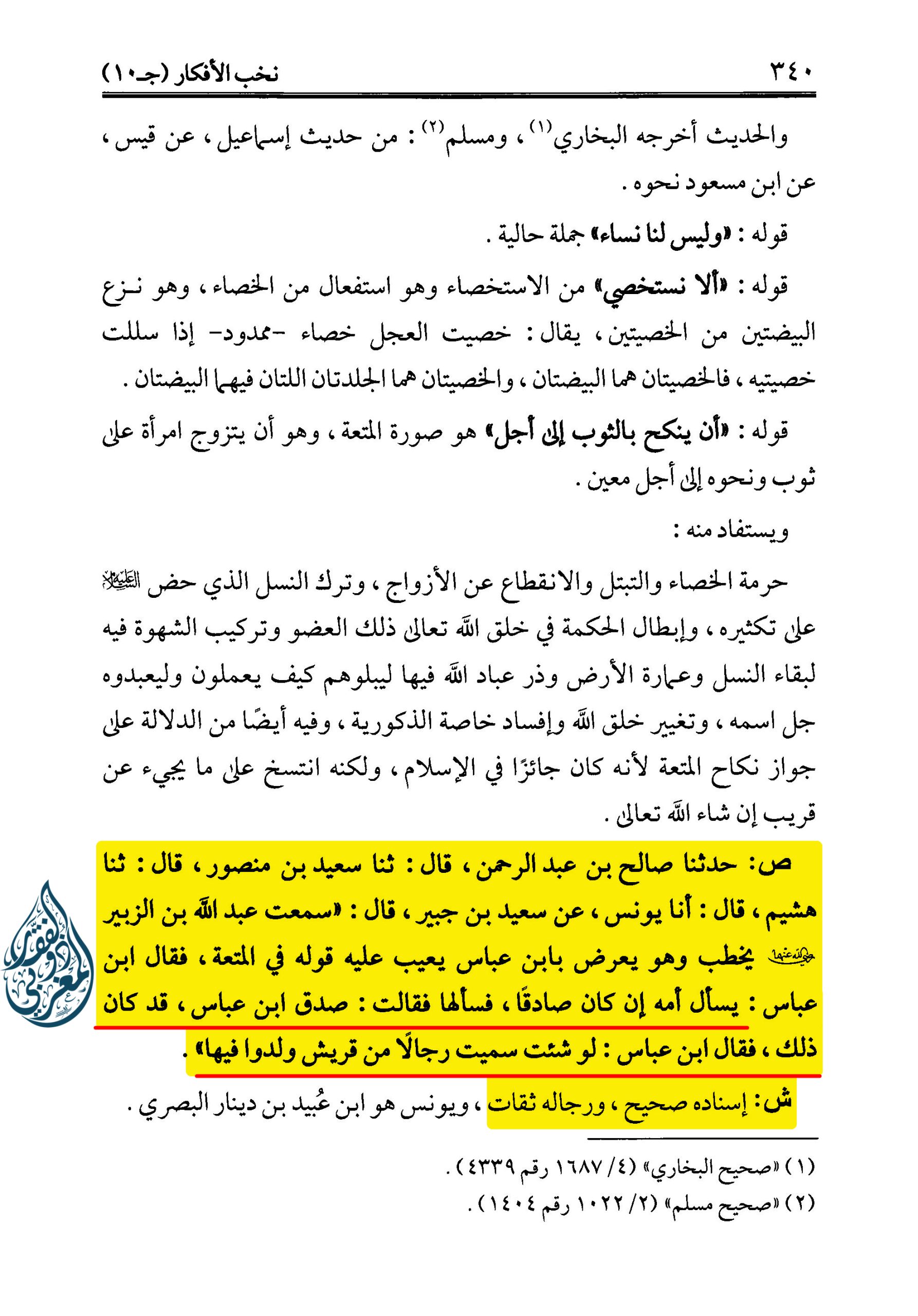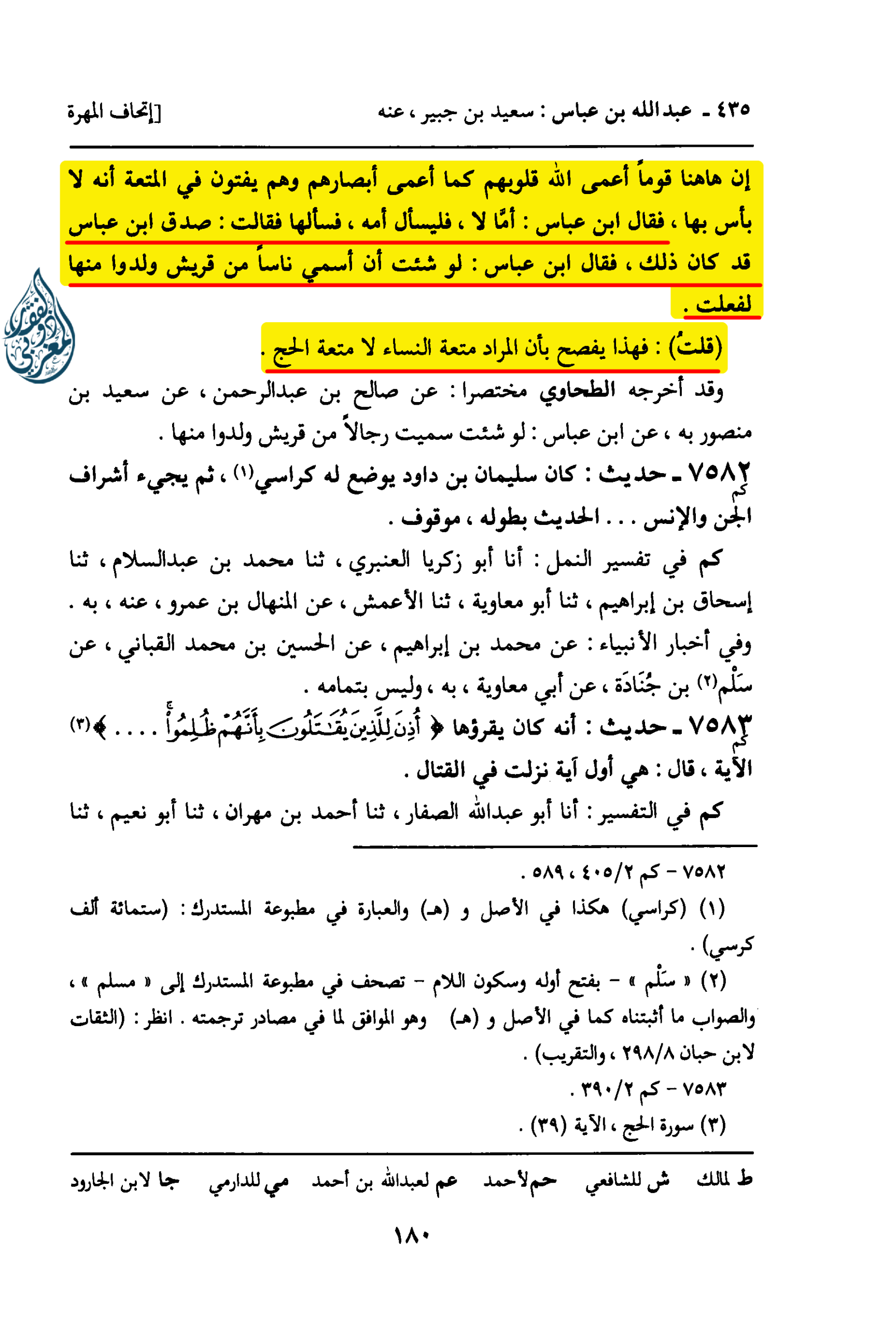 إِنَّ هَاهُنَا قَوْمًا أَعْمَى اللَّهُ قُلُوبَهُمْ كَمَا أَعْمَى أَبْصَارَهُمْ وَهُمْ يُفْتُونَ فِي الْمُتْعَةِ أَنَّهُ لا بَأْسَ بِهَا، فَقَالَ ابْنُ عَبَّاسٍ: أَمَّا لا، فَلْيَسْأَلْ أُمَّهُ، فَسَأَلَهَا فَقَالَتْ: صَدَقَ ابْنُ عَبَّاسٍ قَدْ كَانَ ذَلِكَ، فَقَالَ ابْنُ عَبَّاسٍ: لَوْ شِئْتَ أَنْ أُسَمِّيَ نَاسًا مِنْ قُرَيْشٍ وُلِدَوا مِنْهَا لَفَعَلْتُ. قُلْتُ: فَهَذَا يُفْصِحُ بِأَنَّ الْمُرَادَ مِتْعَةُ النِّسَاءِ لا مُتْعَةُ الْحَجِّ. وَقَدْ أَخْرَجَهُ الطَّحَاوِيُّ مُخْتَصَرًا: عَنْ صَالِحِ بْنِ عَبْدِ الرَّحْمَنِ، عَنْ سَعِيدِ بْنِ مَنْصُورٍ بِهِ، عَنِ ابْنِ عَبَّاسٍ: لَوْ شِئْتَ سَمَّيْتُ رِجَالا مِنْ قُرَيْشٍ وُلِدُوا مِنْهَا.»