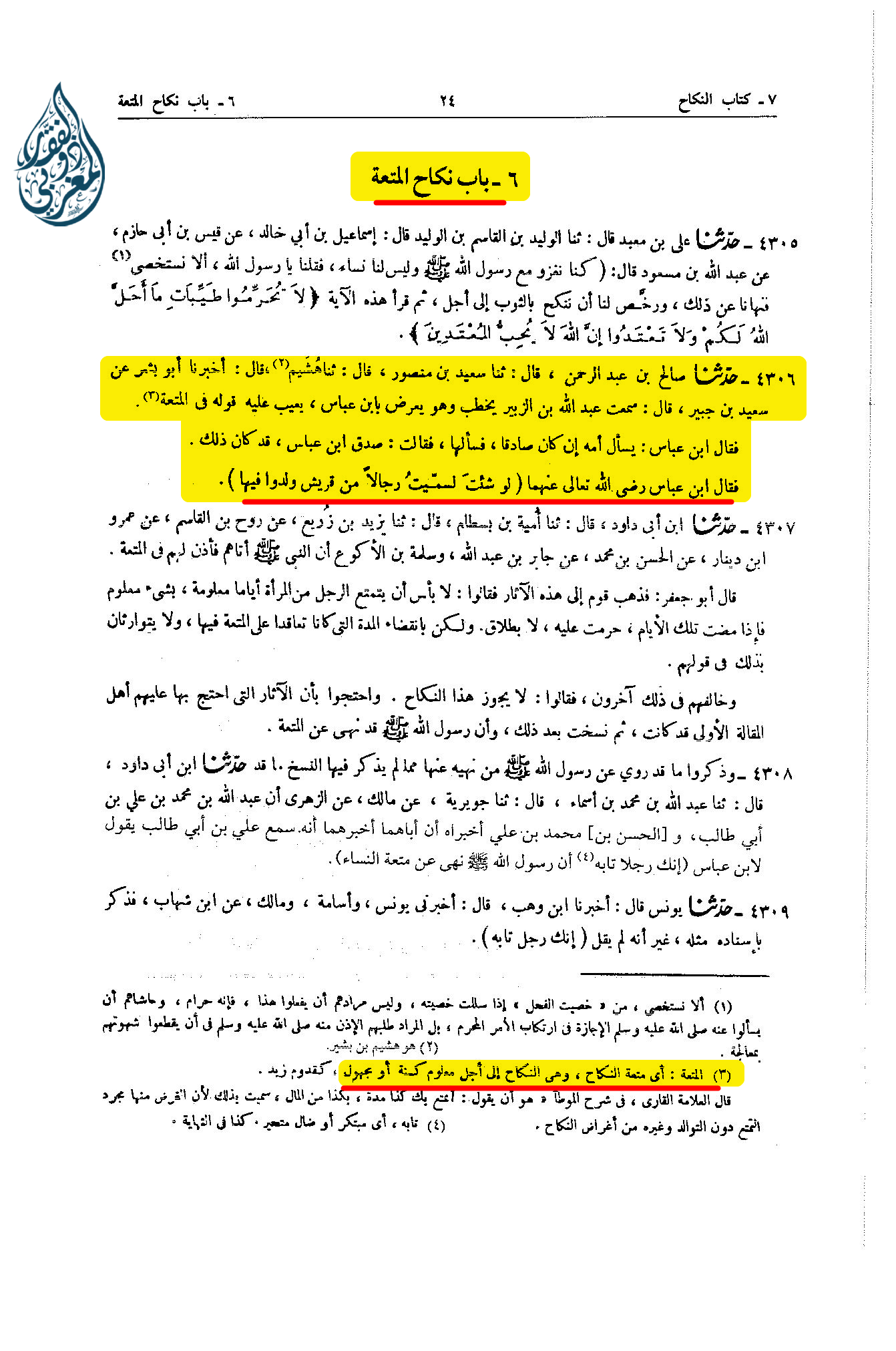 – حَدِيثٌ (طح) : طح فِي النِّكَاحِ: ثنا صَالِحُ بْنُ عَبْدِ الرَّحْمَنِ، ثنا سَعِيدُ بْنُ مَنْصُورٍ، ثنا هُشَيْمٌ، أنا يُونُسُ، عَنْ سَعِيدِ بْنِ جُبَيْرٍ: سَمِعْتُ عَبْدَ اللَّهِ بْنَ الزُّبَيْرِ يَخْطُبُ وَهُوَ يُعَرِّضُ بِابْنِ عَبَّاسٍ، يَعِيبُ عَلَيْهِ قَوْلَهُ فِي الْمُتْعَةِ، فَقَالَ: ابْنُ عَبَّاسٍ: يَسْأَلُ أُمَّهُ إِنْ كَانَ صَادِقًا، فَسَأَلَهَا فَقَالَتْ: صَدَقَ ابْنُ عَبَّاسٍ قَدْ كَانَ ذَلِكَ، فَقَالَ ابْنُ عَبَّاسٍ: لَوْ شِئْتَ لَسَمَّيْتُ رِجَالا مِنْ قُرَيْشٍ وُلِدُوا مِنْهَا.»