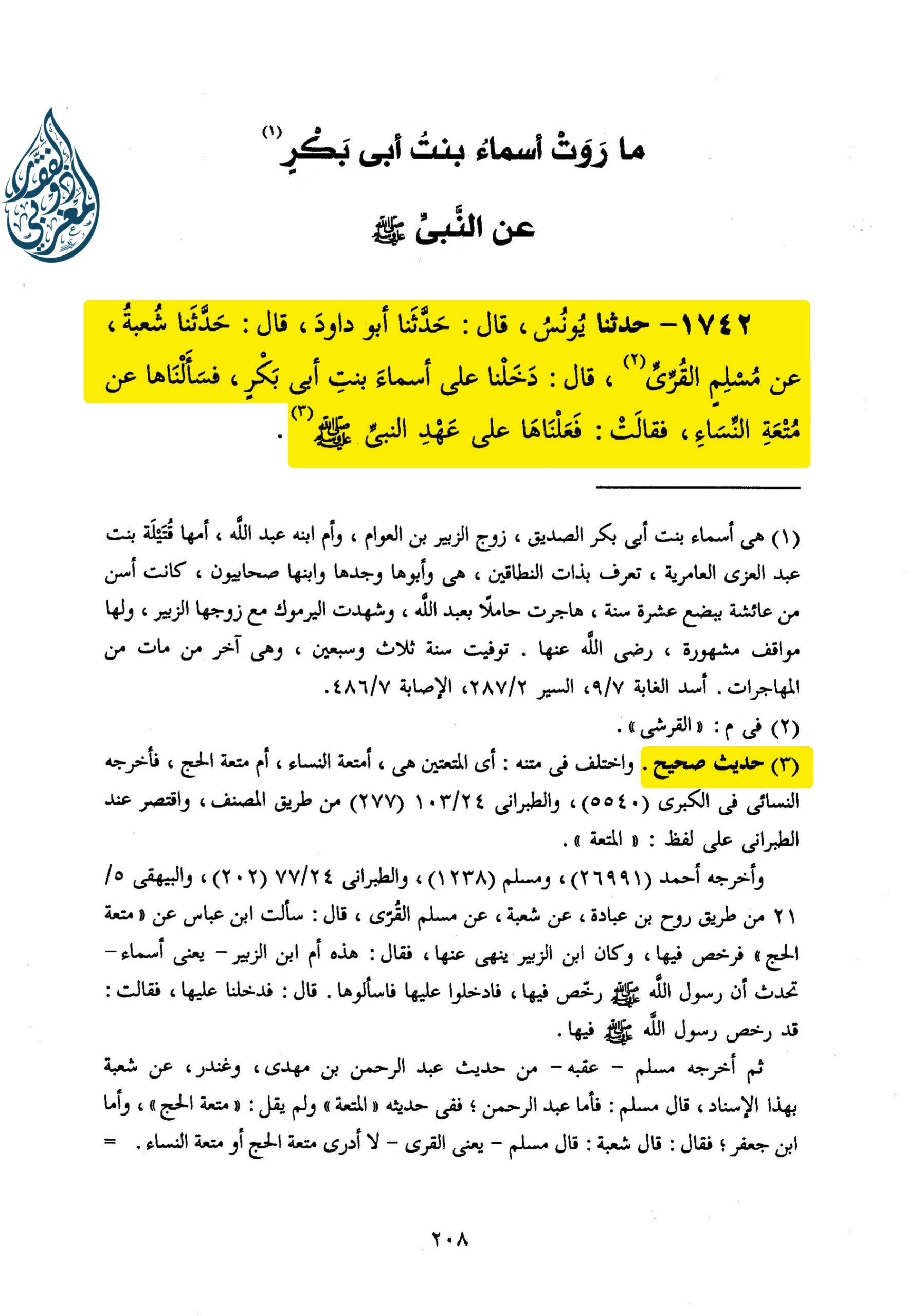 1742 – حَدَّثَنَا يُونُسُ ، قَالَ: حَدَّثَنَا أَبُو دَاوُدَ ، قَالَ: حَدَّثَنَا شُعْبَةُ ، عَنْ مُسْلِمٍ الْقُرِّيِّ ، قَالَ: «دَخَلْنَا عَلَى أَسْمَاءَ بِنْتِ أَبِي بَكْرٍ ، فَسَأَلْنَاهَا عَنْ مُتْعَةِ النِّسَاءِ، فَقَالَتْ: فَعَلْنَاهَا عَلَى عَهْدِ النَّبِيِّ صلى الله عليه وسلم».