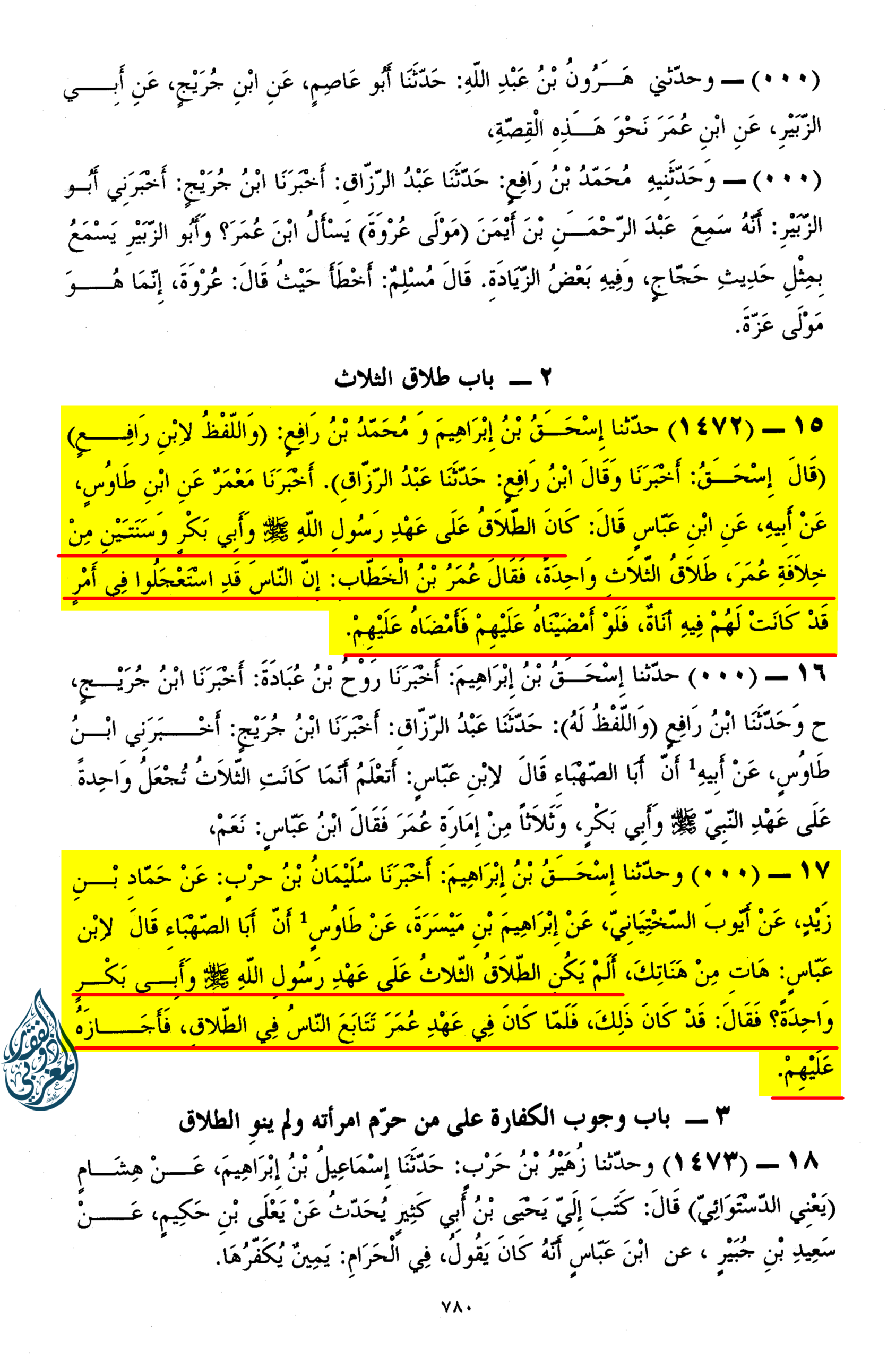 كَانَ الطَّلَاقُ عَلَى عَهْدِ رَسُولِ اللَّهِ صلى الله عليه وسلم وَأَبِي بَكْرٍ وَسَنَتَيْنِ مِنْ خِلَافَةِ عُمَرَ، طَلَاقُ الثَّلَاثِ وَاحِدَةً. فقَالَ عُمَرُ بْنُ الْخَطَّابِ: إِنَّ النَّاسَ قَدِ اسْتَعْجَلُوا فِي أَمْرٍ قَدْ كَانَتْ لَهُمْ فِيهِ أَنَاةٌ. فَلَوْ أَمْضَيْنَاهُ عَلَيْهِمْ! فأمضاه عليهم» عَلَى عَهْدِ رَسُولِ اللَّهِ صلى الله عليه وسلم وَأَبِي بَكْرٍ وَسَنَتَيْنِ مِنْ خِلَافَةِ عُمَرَ، طَلَاقُ الثَّلَاثِ وَاحِدَةً. فقَالَ عُمَرُ بْنُ الْخَطَّابِ: إِنَّ النَّاسَ قَدِ اسْتَعْجَلُوا فِي أَمْرٍ قَدْ كَانَتْ لَهُمْ فِيهِ أَنَاةٌ. فَلَوْ أَمْضَيْنَاهُ عَلَيْهِمْ! فأمضاه عليهم 17 – (1472) وحدثنا إِسْحَاق بْنُ إِبْرَاهِيمَ. أَخْبَرَنَا سُلَيْمَانُ بْنُ حَرْبٍ عَنْ حَمَّادِ بْنِ زَيْدٍ، عَنْ أَيُّوبَ السَّخْتِيَانِيِّ، عَنْ إِبْرَاهِيمَ بْنِ مَيْسَرَةَ، عَنْ طَاوُسٍ؛ أَنَّ أَبَا الصَّهْبَاءِ قَالَ لِابْنِ عَبَّاسٍ: هَاتِ مِنْ هَنَاتِكَ. أَلَمْ يَكُنِ الطَّلَاقُ الثَّلَاثُ عَلَى عَهْدِ رَسُولِ اللَّهِ صلى الله عليه وسلم وَأَبِي بَكْرٍ وَاحِدَةً؟ فقَالَ: