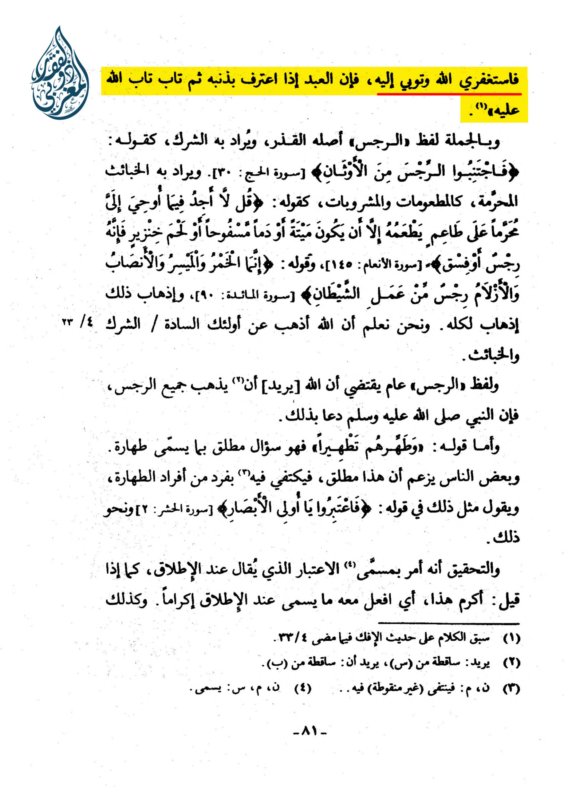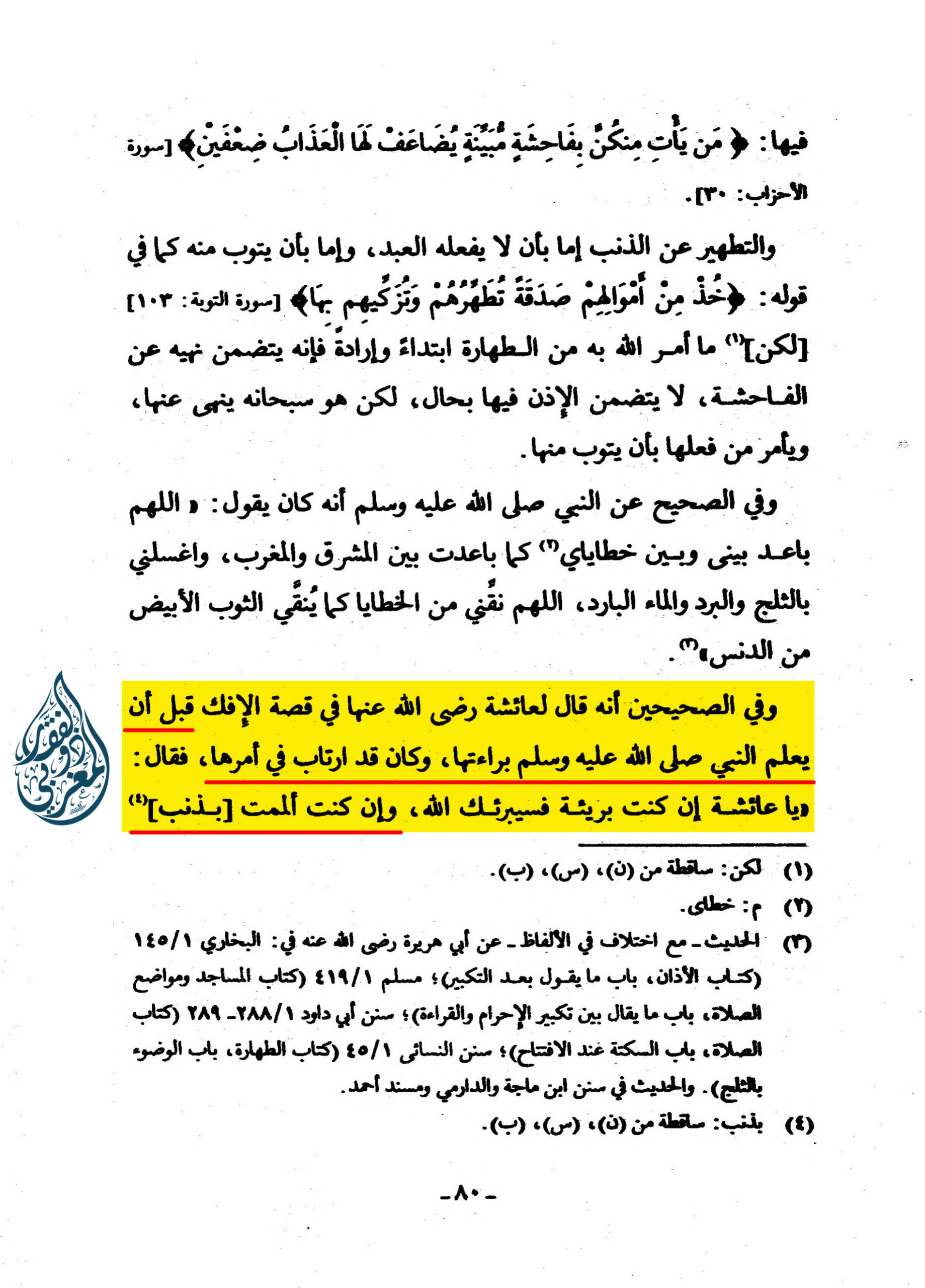 وَفِي الصَّحِيحَيْنِ أَنَّهُ قَالَ لِعَائِشَةَ رضي الله عنها فِي قِصَّةِ الْإِفْكِ قَبْلَ أَنْ يَعْلَمَ النَّبِيُّ بَرَاءَتَهَا، وَكَانَ قَدِ ارْتَابَ فِي أَمْرِهَا، فَقَالَ: «يَا عَائِشَةُ، إِنْ كُنْتِ بَرِيئَةً فَسَيُبَرِّئُكِ اللَّهُ، وَإِنْ كُنْتِ أَلْمَمْتِ [بِذَنْبٍ] فَاسْتَغْفِرِي اللَّهَ وَتُوبِي إِلَيْهِ، فَإِنَّ الْعَبْدَ إِذَا اعْتَرَفَ بِذَنْبِهِ ثُمَّ تَابَ تَابَ اللَّهُ عَلَيْهِ