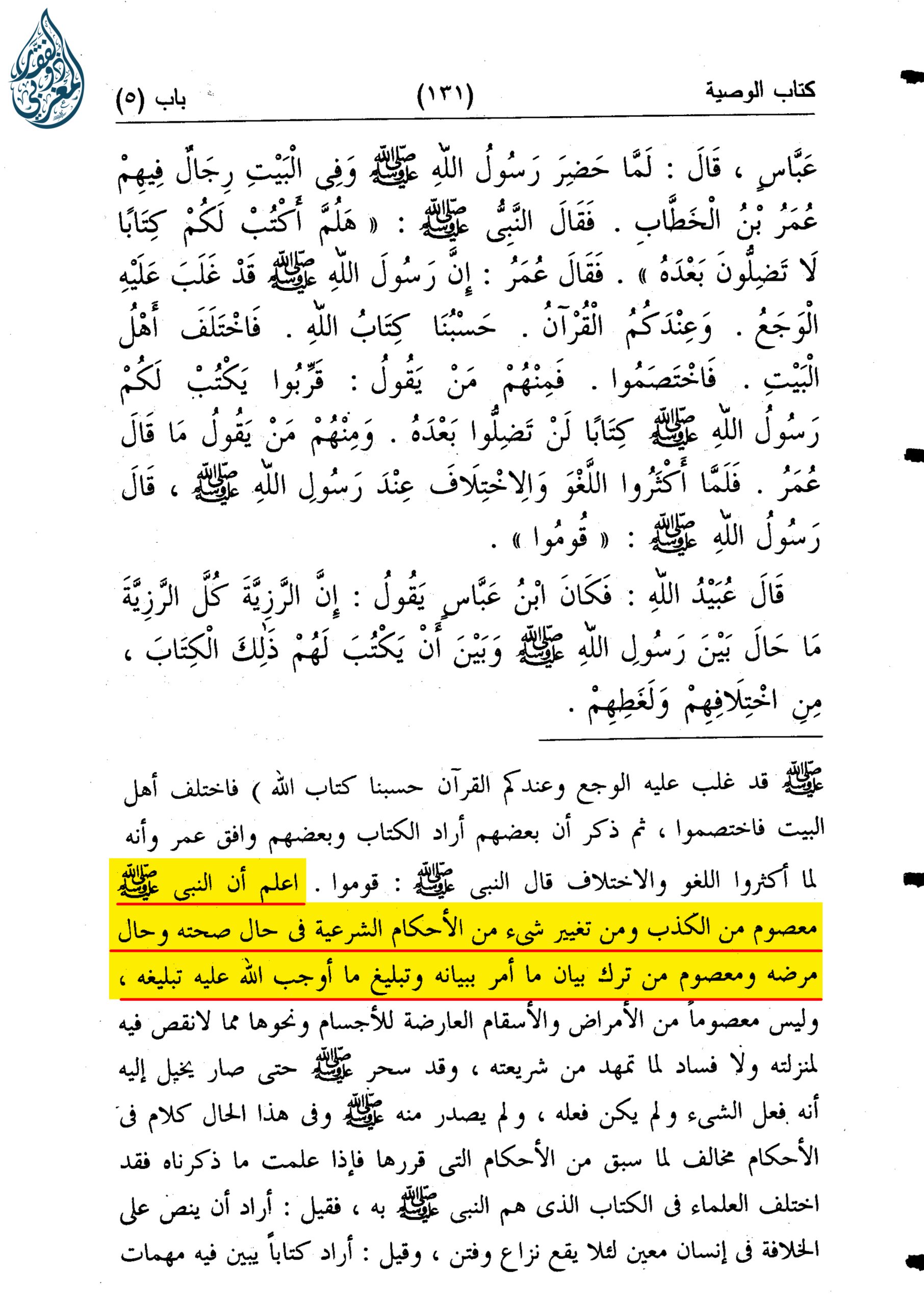 «‌اعْلَمْ ‌أَنَّ ‌النَّبِيَّ صلى الله عليه وسلم مَعْصُومٌ مِنَ الْكَذِبِ وَمِنْ تَغْيِيرِ شَيْءٍ مِنَ الْأَحْكَامِ الشَّرْعِيَّةِ فِي حَالِ صِحَّتِهِ وَحَالِ مَرَضِهِ وَمَعْصُومٌ مِنْ تَرْكِ بَيَانِ مَا أُمِرَ بِبَيَانِهِ وَتَبْلِيغِ مَا أَوْجَبَ اللَّهُ عَلَيْهِ تَبْلِيغَهُ»