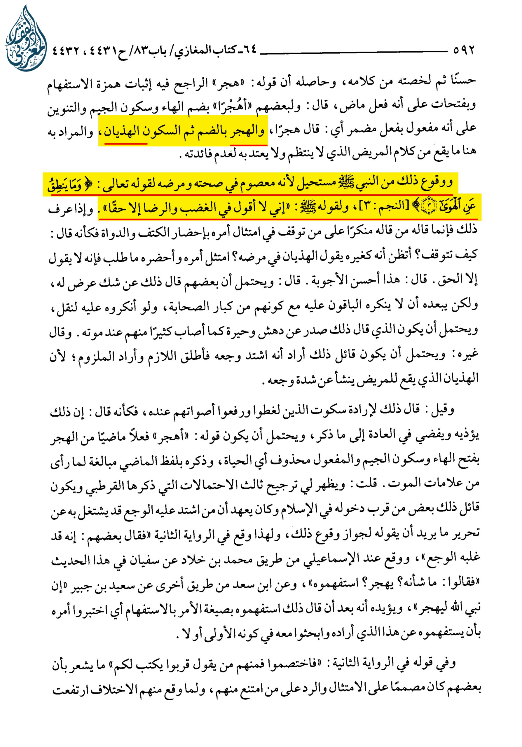 ابن حجر : وقوع الهذيان من النبي مستحيل؛ لأنه معصوم في صحته ومرضه