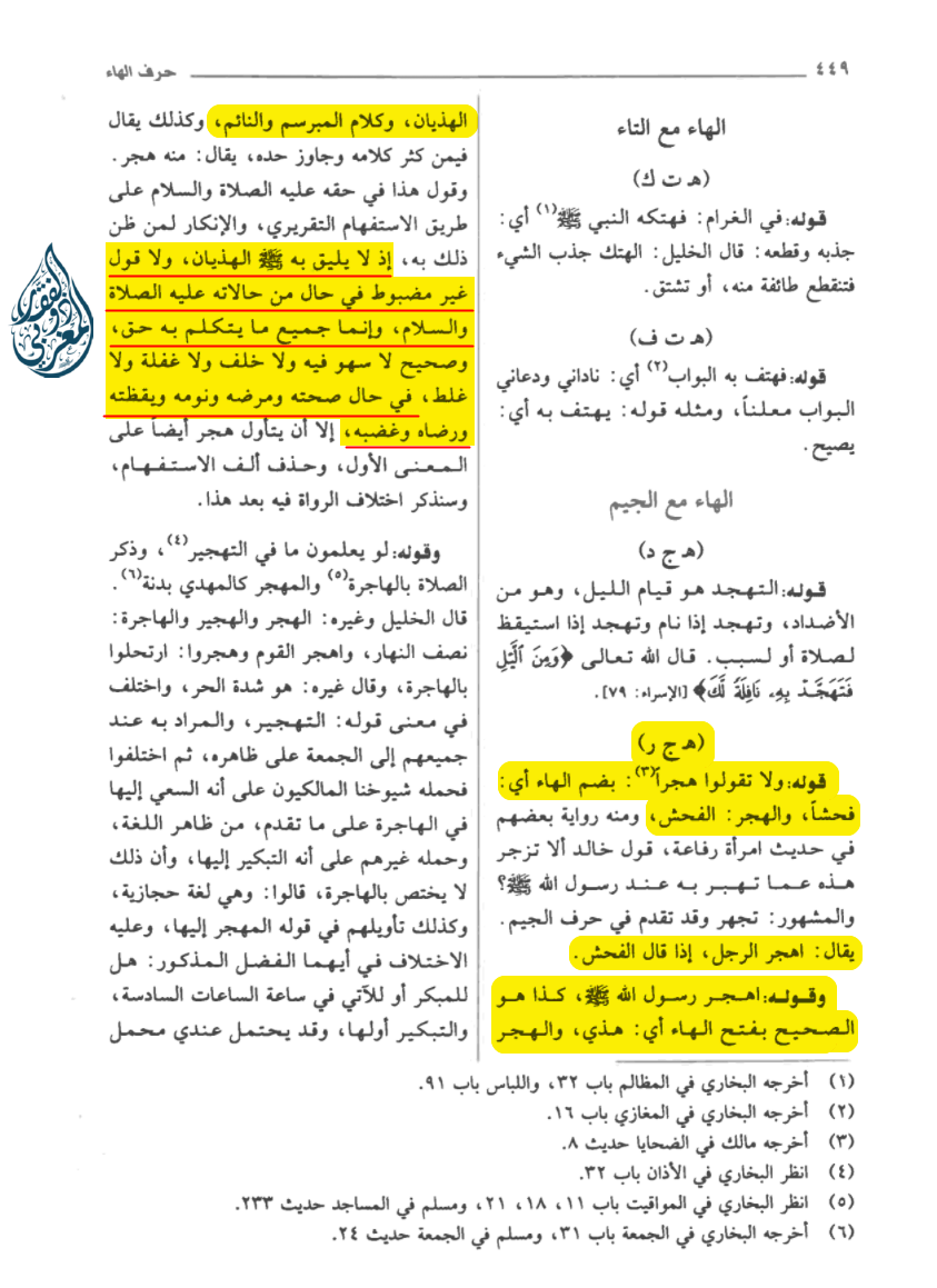 «(هـ ج ر) قَوْله ‌وَلَا ‌تَقولُوا ‌هجرا بِضَم الْهَاء أَي فحشا والهجر الْفُحْش وَمِنْه رِوَايَة بَعضهم فِي حَدِيث امْرَأَة رِفَاعَة قَول خَالِد أَلا تزجر هَذِه عَمَّا تهبر بِهِ عِنْد رَسُول الله صلى الله عليه وسلم وَالْمَشْهُور تجْهر وَقد تقدم فِي حرف الْجِيم يُقَال اهجر الرجل إِذا قَالَ الْفُحْش وَقَوله اهجر رَسُول الله صلى الله عليه وسلم كَذَا هُوَ الصَّحِيح بِفَتْح الْهَاء أَي هذي والهجر الهذيان وككلام المبرسم والنائم وَكَذَلِكَ يُقَال فِيمَن كثر كَلَامه وَجَاوَزَ حَده يُقَال مِنْهُ هجر وَقَول هَذَا فِي حَقه صلى الله عليه وسلم على طَرِيق الِاسْتِفْهَام التقريري وَالْإِنْكَار لمن ظن ذَلِك بِهِ إِذْ لَا يَلِيق بِهِ صلى الله عليه وسلم الهذيان وَلَا قَول غير مضبوط فِي حَال من حالاته صلى الله عليه وسلم وَإِنَّمَا جَمِيع مَا يتَكَلَّم بِهِ حق وصحيح لَا سَهْو فِيهِ وَلَا خلف وَلَا غَفلَة وَلَا غلط فِي حَال صِحَّته ومرضه ونومه ويقظته وَرضَاهُ وغضبه