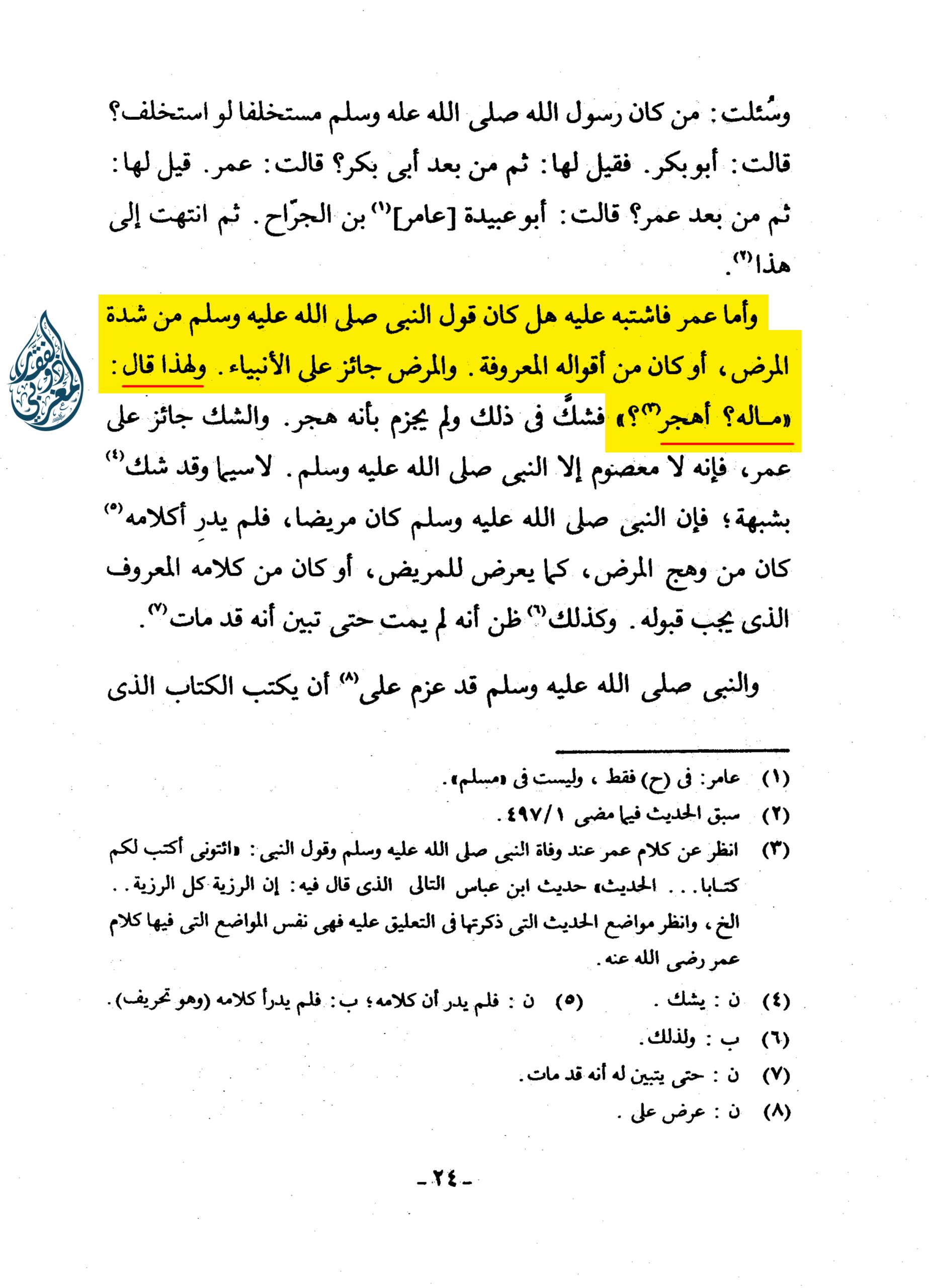«وَأَمَّا عُمَرُ فَاشْتَبَهَ عَلَيْهِ هَلْ كَانَ قَوْلُ النَّبِيِّ صلى الله عليه وسلم مِنْ شِدَّةِ الْمَرَضِ، أَوْ كَانَ مِنْ أَقْوَالِهِ الْمَعْرُوفَةِ؟ وَالْمَرَضُ جَائِزٌ عَلَى الْأَنْبِيَاءِ، وَلِهَذَا قَالَ: ” مَا لَهُ؟ أَهَجَرَ (3) ؟ ” فَشَكَّ فِي ذَلِكَ وَلَمْ يَجْزِمْ بِأَنَّهُ هَجَرَ، وَالشَّكُّ جَائِزٌ عَلَى عُمَرَ، فَإِنَّهُ لَا مَعْصُومَ إِلَّا النَّبِيَّ صلى الله عليه وسلم لَا سِيَّمَا وَقَدْ شَكَّ (4) بِشُبْهَةٍ؛ فَإِنَّ النَّبِيَّ صلى الله عليه وسلم كَانَ مَرِيضًا، فَلَمْ يَدْرِ أَكَلَامُهُ (5) كَانَ مِنْ وَهَجِ الْمَرَضِ، كَمَا يَعْرِضُ لِلْمَرِيضِ، أَوْ كَانَ مِنْ كَلَامِهِ الْمَعْرُوفِ الَّذِي يَجِبُ قَبُولُهُ؟ وَكَذَلِكَ (6) . ظَنَّ أَنَّهُ لَمْ يَمُتْ حَتَّى تَبَيَّنَ أَنَّهُ قَدْ مَاتَ