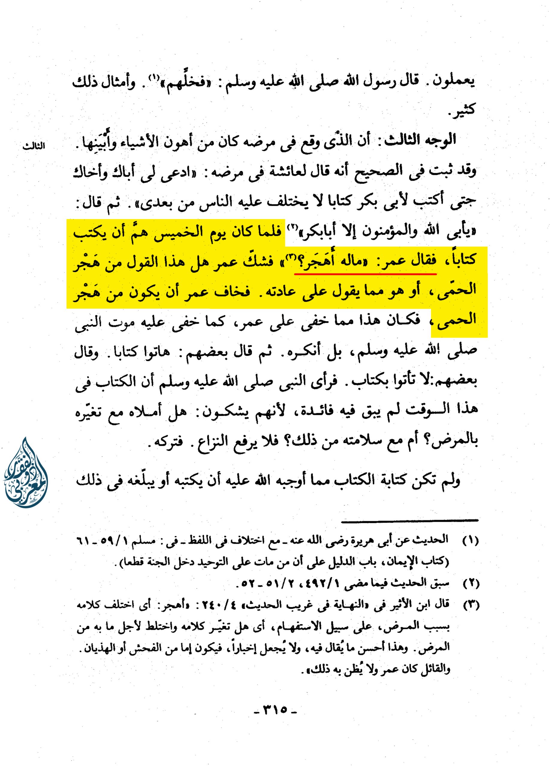 «فَلَمَّا كَانَ يَوْمُ الْخَمِيسِ هَمَّ أَنْ يَكْتُبَ كِتَابًا، فَقَالَ عُمَرُ: ” مَالَهُ أَهَجَرَ؟ (3) ” فَشَكَّ عُمَرُ هَلْ هَذَا الْقَوْلُ مَنْ هُجْرِ الْحُمَّى أَوْ هُوَ مِمَّا يَقُولُ عَلَى عَادَتِهِ فَخَافَ عُمَرُ أَنَّ يَكُونَ مِنْ هُجْرِ الْحُمَّى، أَوْ هَذَا مِمَّا خَفِيَ عَلَى عُمَرَ كَمَا خَفِيَ عَلَيْهِ مَوْتُ النَّبِيِّ صلى الله عليه وسلم بَلْ أَنْكَرَهُ، ثُمَّ قَالَ بَعْضُهُمْ هَاتُوا كِتَابًا، وَقَالَ بَعْضُهُمْ: لَا تَأْتُوا بِكِتَابٍ. فَرَأَى النَّبِيُّ صلى الله عليه وسلم أَنَّ الْكِتَابَ فِي هَذَا الْوَقْتِ لَمْ يَبْقَ فِيهِ فَائِدَةٌ، لِأَنَّهُمْ يَشُكُّونَ: هَلْ أَمْلَاهُ مَعَ تَغَيُّرِهِ بِالْمَرَضِ؟ أَمْ مَعَ سَلَامَتِهِ مِنْ ذَلِكَ؟ فَلَا يَرْفَعُ النِّزَاعَ فَتَرَكَهُ»