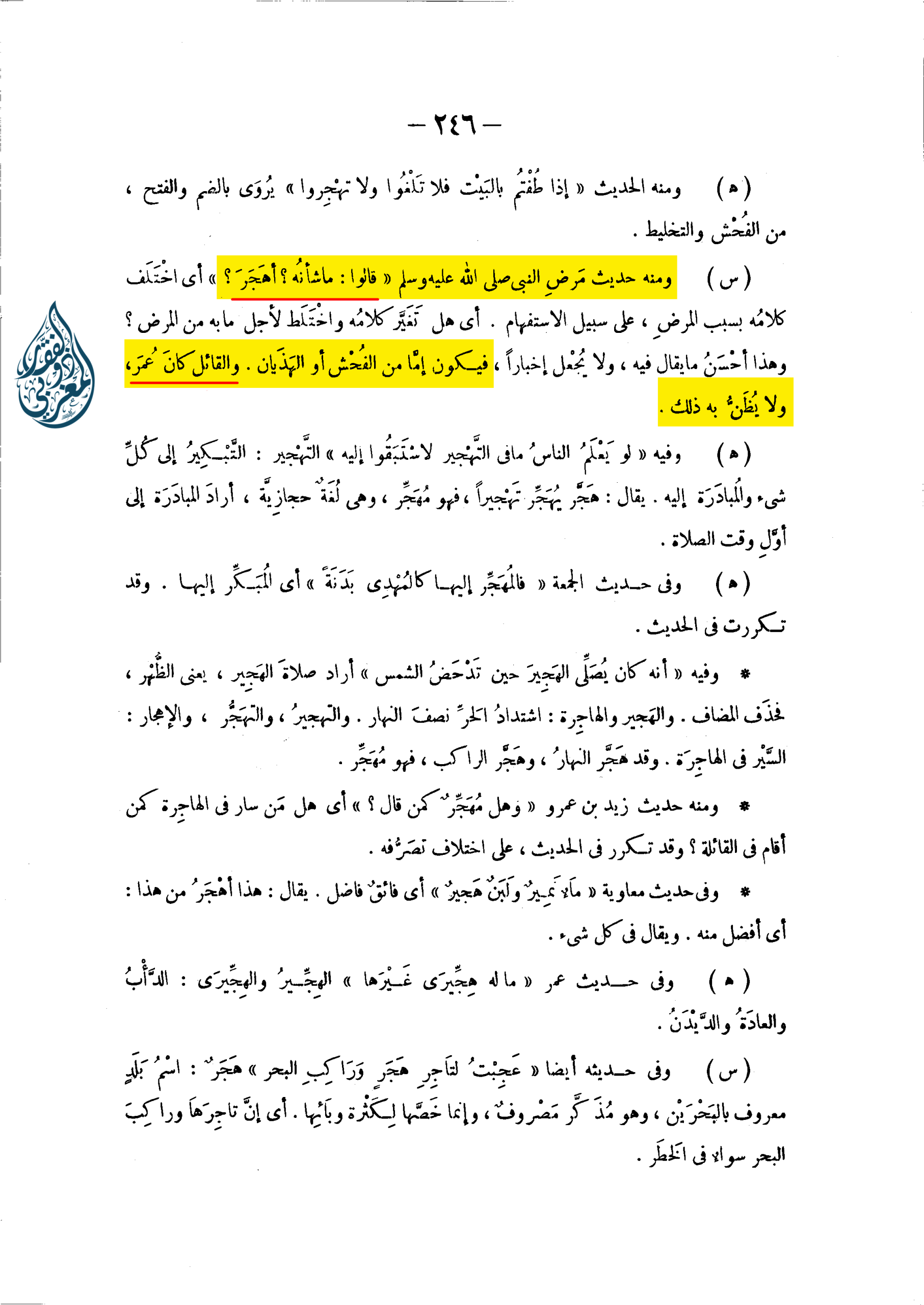 وَمِنْهُ حَدِيثِ مرضِ النَّبِيِّ صلى الله عليه وسلم «قَالُوا: مَا شأنُه؟ أهَجَرَ؟» أَيِ اخْتَلَف كلامُه بِسَبَبِ المرضِ، عَلَى سَبِيلِ الِاسْتِفْهَامِ. أَيْ هَلْ تَغَيَّر كلامُه واخْتَلَط لِأَجْلِ مَا بِهِ مِنَ الْمَرَضِ؟