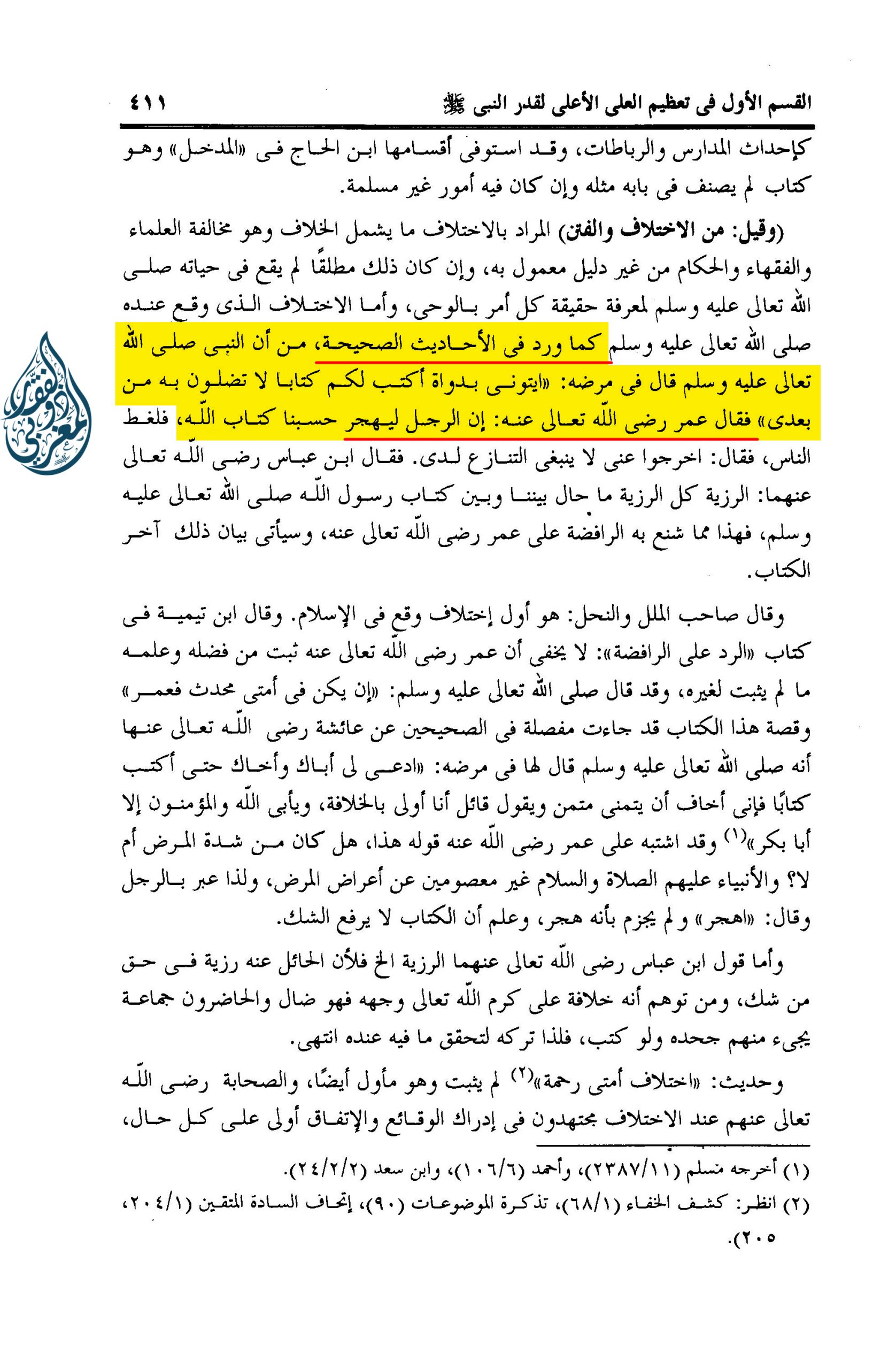 وأما الاختلاف الذي وقع عنده صلى الله عليه (وآله) وسلم كما ورد في الأحاديث الصحيحة , من أن النبي صلى الله تعالى عليه ( وآله ) وسلم قال في مرضه ( أيتوني بدواة أكتب لكم كتابا لا تضلون به من بعدي )) فقال عمر رضي الله تعالى عنه : إن الرجل ليهجر حسبنا كتاب الله , فلغط الناس , فقال : اخرجوا عني لا ينبغي التنازع لدي