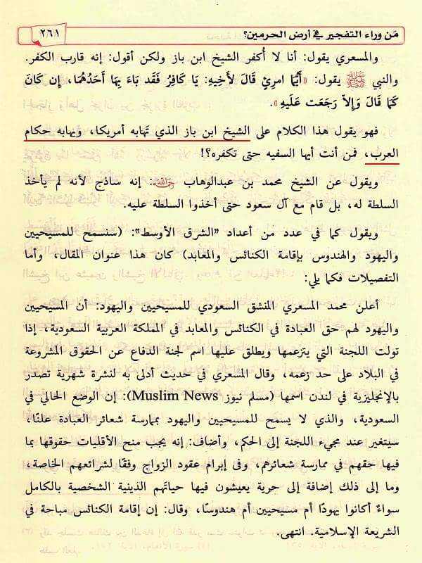 قال الشيخ مقبل بن هادي الوادعي في كتابه (تحفة المجيب على أسئلة الحاضر والغريب، ص 261): (فهو يقول هذا الكلام على الشيخ ابن باز الذي تهابه أمريكا ويهابه حكَّام العرب، فمن أنت أيها السفيه حتى تكفّره؟!).