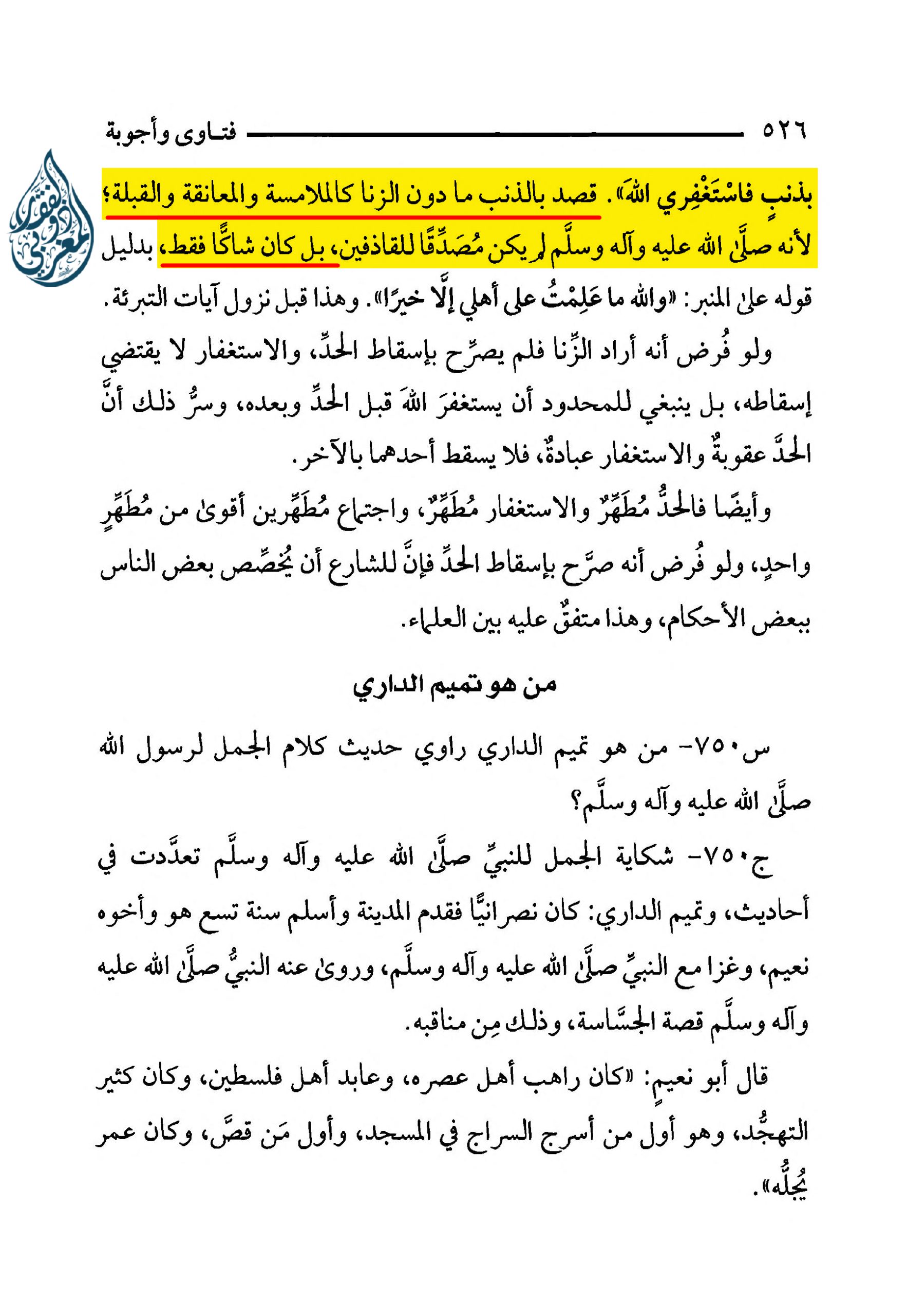 الصديق الغماري : ان كنت الممت بالذنب فاستغفري الله، قصد بالذنب ما دون الزنا كالملامسة والمعانقة والقبلة