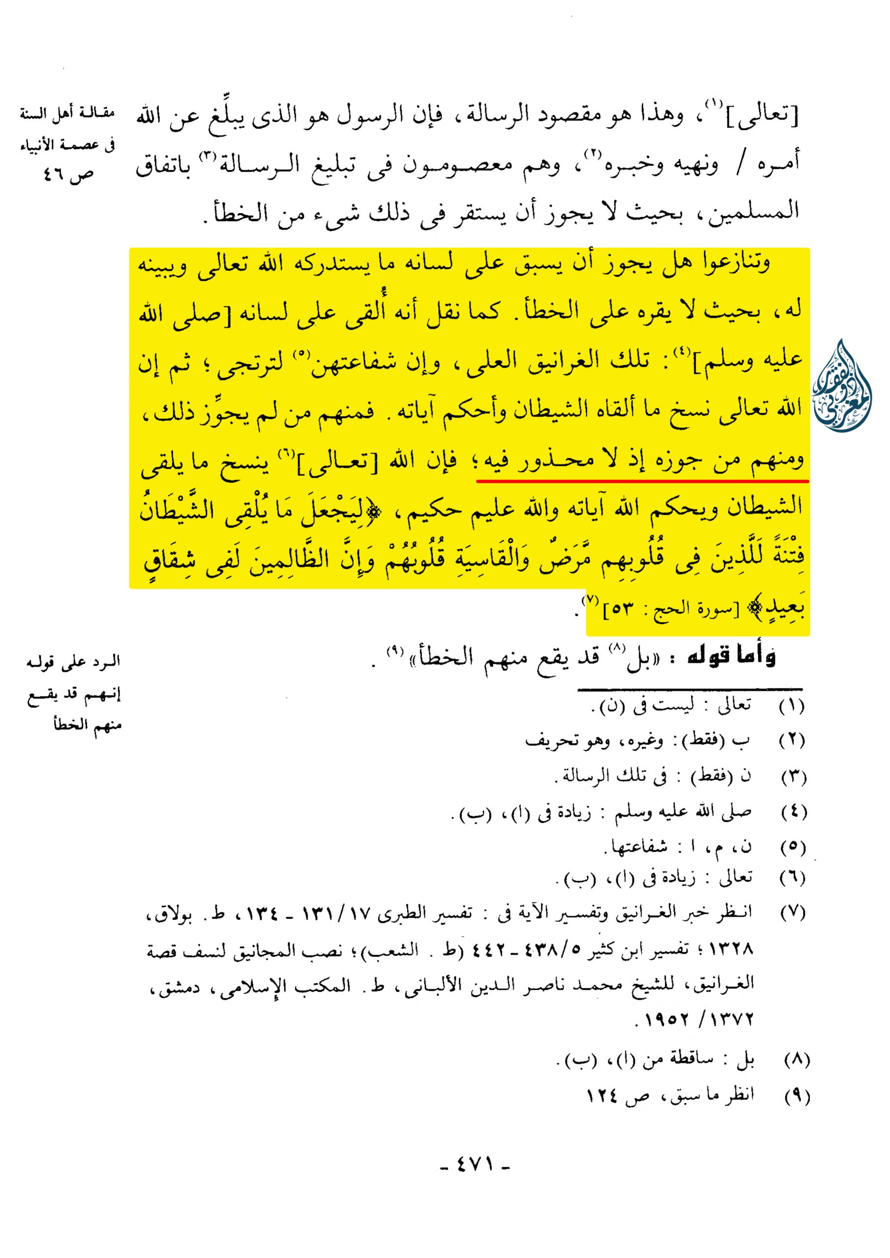 «وتنازعوا هل يجوز أن يسبق على لسانه ما يستدركه الله تعالى ويبينه له بحيث لا يقره على الخطأ. كما نقل أنه ألقي على لسانه [صلى الله عليه وسلم] (4) : تلك الغرانيق العلى، وإن شفاعتهن (5) لترتجى؛ ثم إن الله تعالى نسخ ما ألقاه الشيطان وأحكم آياته. فمنهم من لم يجوز ذلك ومنهم من جوزه إذ لا محذور فيه؛ فإن الله [تعالى] (6) ينسخ ما يلقي الشيطان ويحكم الله آياته والله عليم حكيم، {ليجعل ما يلقي الشيطان فتنة للذين في قلوبهم مرض والقاسية قلوبهم وإن الظالمين لفي شقاق بعيد} [سورة الحج: 53] (7)»