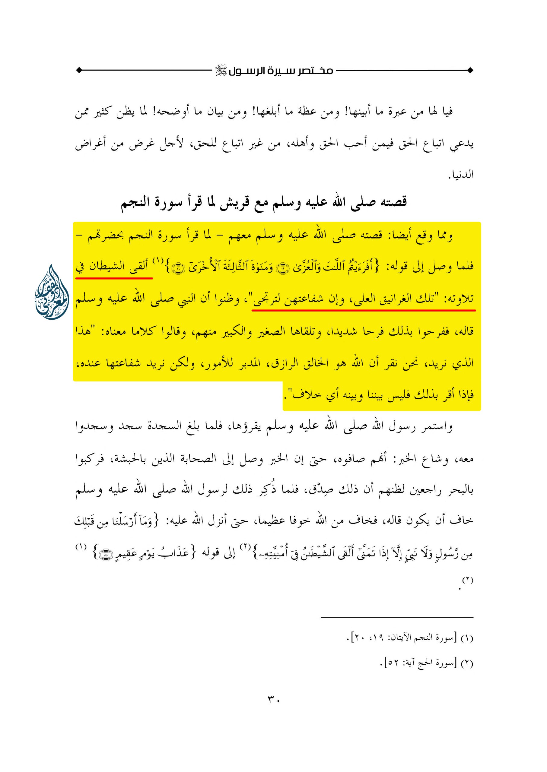 ومما وقع أيضا: قصته صلى الله عليه وسلم معهم – لما قرأ سورة النجم بحضرتهم – فلما وصل إلى قوله: {أَفَرَأَيْتُمُ اللَّاتَ وَالْعُزَّى – وَمَنَاةَ الثَّالِثَةَ الْأُخْرَى} [النجم: 19 – 20] (1) ألقى الشيطان في تلاوته: تلك الغرانيق العلى، وإن شفاعتهن لترتجى. وظنوا أن النبي صلى الله عليه وسلم قاله، ففرحوا بذلك فرحا شديدا، وتلقاها الصغير والكبير منهم، وقالوا كلاما معناه: هذا الذي نريد، نحن نقر أن الله هو الخالق الرازق، المدبر للأمور، ولكن نريد شفاعتها عنده. فإذا أقر بذلك فليس بيننا وبينه أي خلاف.»