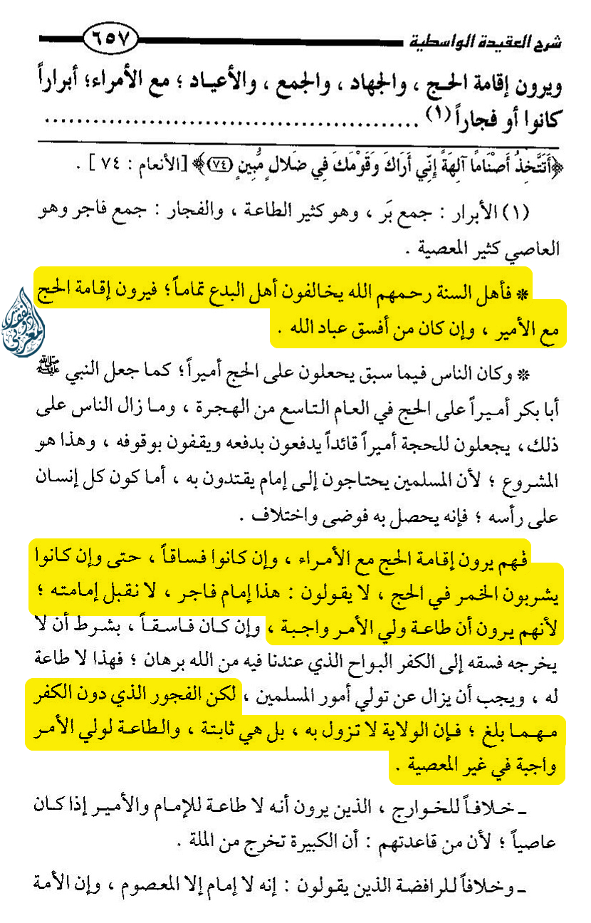 فهم يرون إقامة الحج مع الأمراء، وإن كانوا فساقا، حتى وإن كانوا يشربون الخمر في الحج، لا يقولون: هذا إمام فاجر، لا نقبل إمامته؛ لأنهم يرون أن طاعة ولي الأمر واجبة، وإن كان فاسقا، بشرط أن لا يخرجه فسقه إلى الكفر البواح الذي عندنا فيه من الله برهان، فهذا لا طاعة له، ويجب أن يزال عن تولي أمور المسلمين، لكن الفجور الذي دون الكفر مهما بلغ، فإن الولاية لا تزال به، بل هي ثابتة، والطاعة لولي الأمر واجبة في غير المعصية.»