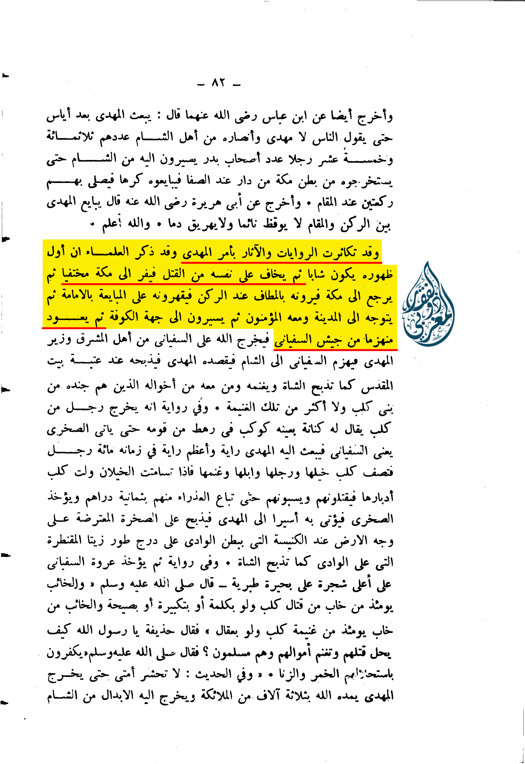«وَقَدْ تَكَاثَرَتِ الرِّوَايَاتُ وَالْآثَارُ بِأَمْرِ الْمَهْدِيِّ وَقَدْ ذَكَرَ الْعُلَمَاءُ أَنَّ أَوَّلَ ظُهُورِهِ يَكُونُ شَابًّا ثُمَّ يَخَافُ عَلَى نَفْسِهِ مِنَ الْقَتْلِ فَيَفِرُّ إِلَى مَكَّةَ مُخْتَفِيًا ثُمَّ يَرْجِعُ إِلَى مَكَّةَ فَيَرَوْنَهُ بِالْمَطَافِ عِنْدَ الرُّكْنِ فَيَقْهَرُونَهُ عَلَى الْمُبَايَعَةِ بِالْإِمَامَةِ ثُمَّ يَتَوَجَّهُ إِلَى الْمَدِينَةِ وَمَعَهُ الْمُؤْمِنُونَ ثُمَّ يَسِيرُونَ إِلَى جِهَةِ الْكُوفَةِ ثُمَّ يَعُودُ مُنْهَزِمًا مِنْ جَيْشِ السُّفْيَانِيِّ»