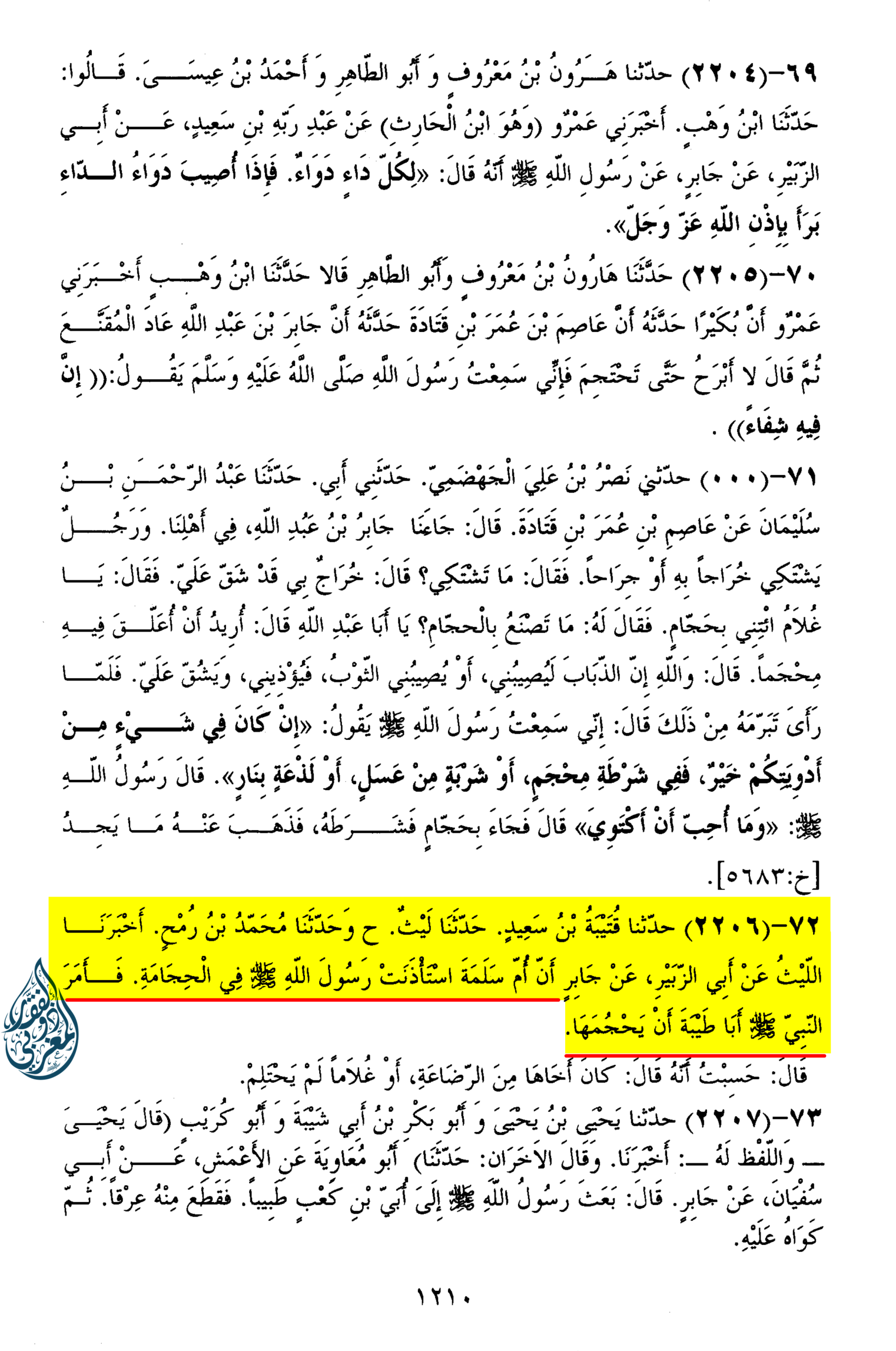 72 – (2206) حَدَّثَنَا قُتَيْبَةُ بْنُ سَعِيدٍ ، حَدَّثَنَا لَيْثٌ ، (ح) وَحَدَّثَنَا مُحَمَّدُ بْنُ رُمْحٍ ، أَخْبَرَنَا اللَّيْثُ ، عَنْ أَبِي الزُّبَيْرِ ، عَنْ جَابِرٍ « أَنَّ أُمَّ سَلَمَةَ اسْتَأْذَنَتْ رَسُولَ اللهِ صلى الله عليه وسلم فِي الْحِجَامَةِ، فَأَمَرَ النَّبِيُّ صلى الله عليه وسلم أَبَا طَيْبَةَ أَنْ يَحْجُمَهَا.