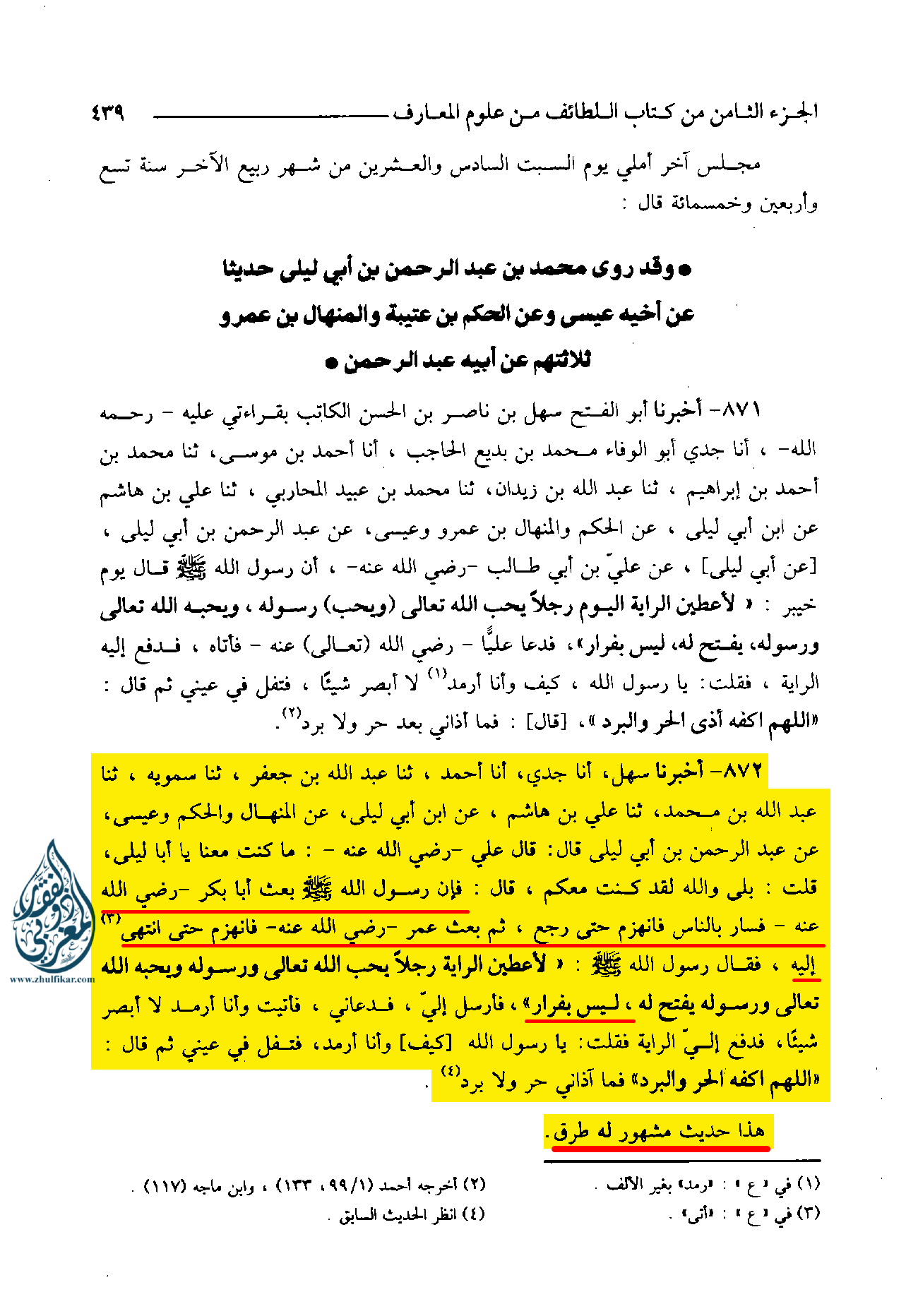 «872- أخبرنا سهل، أنا جدي، أنا أحمد، ثنا عبد الله بن جعفر، ثنا سمويه، ثنا عبد الله بن محمد، ثنا علي هاشم، عن ابن أبي ليلى، عن المنهال والحكم وعيسى، عن عبد الرحمن بن أبي ليلى قال: قال علي رضي الله عنه: ما كنت معنا يا أبا ليلى، قلت: بلى والله لقد كنت معكم، قال: فإن رسول الله صلى الله عليه وسلم ‌بعث ‌أبا ‌بكر رضي الله عنه فسار بالناس فانهزم حتى رجع، ثم بعث عمر رضي الله عنه فانهزم حتى انتهى إليه، فقال رسول الله صلى الله عليه وسلم: ((لأعطين الراية رجلاً يحب الله تعالى ورسوله ويحبه الله تعالى ورسوله يفتح له، ليس بفرار)) ، فأرسل إلي، فدعاني، فأتيت وأنا أرمد لا أبصر شيئاً، فدفع إلي الراية فقلت: يا رسول الله [كيف] وأنا أرمد، فتفل في عيني ثم قال: ((اللهم اكفه الحر والبرد)) فما آذاني حر ولا برد.