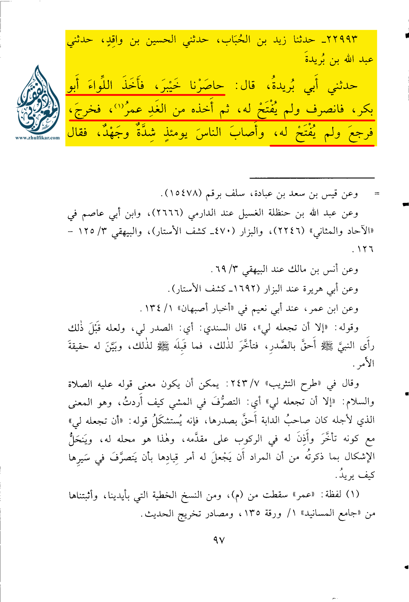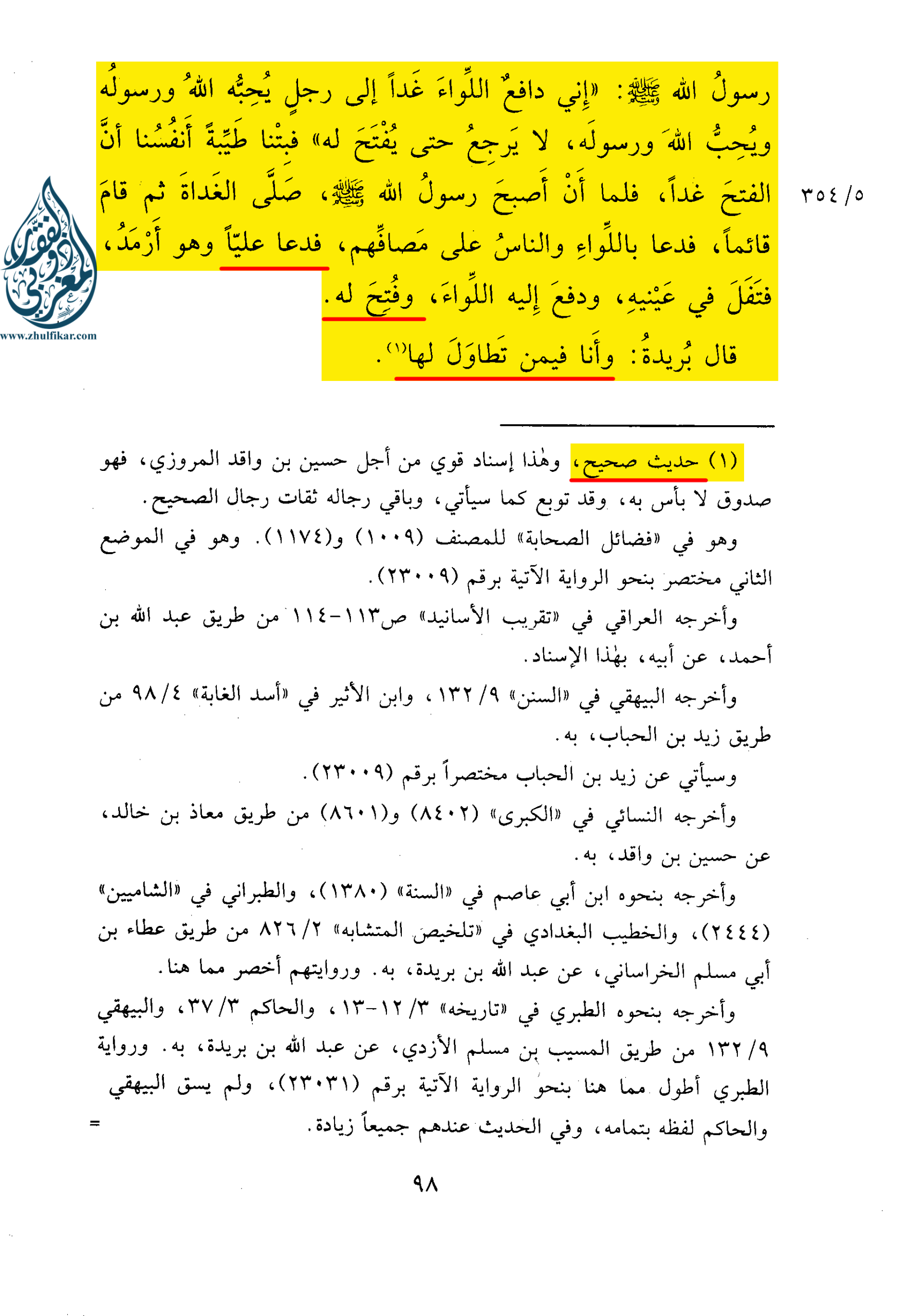 «22993 – حَدَّثَنَا زَيْدُ بْنُ الْحُبَابِ، حَدَّثَنِي الْحُسَيْنُ بْنُ وَاقِدٍ، حَدَّثَنِي عَبْدُ اللهِ بْنُ بُرَيْدَةَ، حَدَّثَنِي أَبِي بُرَيْدَةُ، قَالَ: ‌حَاصَرْنَا ‌خَيْبَرَ، فَأَخَذَ اللِّوَاءَ أَبُو بَكْرٍ، فَانْصَرَفَ وَلَمْ يُفْتَحْ لَهُ، ثُمَّ أَخَذَهُ مِنَ الْغَدِ عُمَرُ (1)، فَخَرَجَ، فَرَجَعَ وَلَمْ يُفْتَحْ لَهُ، وَأَصَابَ النَّاسَ يَوْمَئِذٍ شِدَّةٌ وَجَهْدٌ، فَقَالَ رَسُولُ اللهِ صلى الله عليه وسلم: ” إِنِّي دَافِعٌ اللِّوَاءَ غَدًا إِلَى رَجُلٍ يُحِبُّهُ اللهُ وَرَسُولُهُ وَيُحِبُّ اللهَ وَرَسُولَهُ، لَا يَرْجِعُ حَتَّى يُفْتَحَ لَهُ ” فَبِتْنَا طَيِّبَةٌ أَنْفُسُنَا أَنَّ الْفَتْحَ غَدًا، فَلَمَّا أَنْ أَصْبَحَ رَسُولُ اللهِ صلى الله عليه وسلم، صَلَّى الْغَدَاةَ ثُمَّ قَامَ قَائِمًا، فَدَعَا بِاللِّوَاءِ وَالنَّاسُ عَلَى مَصَافِّهِمْ، فَدَعَا عَلِيًّا وَهُوَ أَرْمَدُ، فَتَفَلَ فِي عَيْنَيْهِ، وَدَفَعَ إِلَيْهِ اللِّوَاءَ، وَفُتِحَ لَهُ.