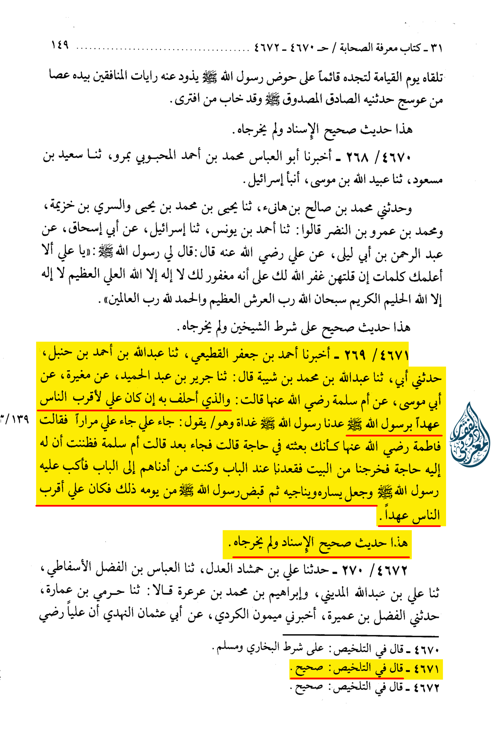 4671 – أَخْبَرَنَا أَحْمَدُ بْنُ جَعْفَرٍ الْقَطِيعِيُّ، ثنا عَبْدُ اللَّهِ بْنُ أَحْمَدَ بْنِ حَنْبَلٍ، حَدَّثَنِي أَبِي، ثنا عَبْدُ اللَّهِ بْنُ مُحَمَّدِ بْنِ شَيْبَةَ، قَالَ: ثنا جَرِيرُ بْنُ عَبْدِ الْحَمِيدِ، عَنْ مُغِيرَةَ، عَنْ أَبِي مُوسَى، عَنْ أُمِّ سَلَمَةَ رضي الله عنها قَالَتْ: وَالَّذِي أَحْلِفُ بِهِ إِنْ كَانَ عَلِيٌّ لَأَقْرَبَ النَّاسِ عَهْدًا بِرَسُولِ اللَّهِ صلى الله عليه وسلم، عُدْنَا رَسُولَ اللَّهِ صلى الله عليه وسلم غَدَاةً وَهُوَ يَقُولُ: «جَاءَ عَلِيٌّ؟ جَاءَ عَلِيٌّ؟» مِرَارًا، فَقَالَتْ فَاطِمَةُ رضي الله عنها: كَأَنَّكَ بَعَثْتَهُ فِي حَاجَةٍ، قَالَتْ: فَجَاءَ بَعْدُ، قَالَتْ أَبِي سَلَمَةَ: فَظَنَنْتُ أَنَّ لَهُ إِلَيْهِ حَاجَةً، فَخَرَجْنَا مِنَ الْبَيْتِ فَقَعَدْنَا عِنْدَ الْبَابِ، وَكُنْتُ مِنْ أَدْنَاهُمْ إِلَى الْبَابِ، فَأَكَبَّ عَلَيْهِ رَسُولُ اللَّهِ صلى الله عليه وسلم وَجَعَلَ يُسَارُّهُ وَيُنَاجِيهِ، ثُمَّ قُبِضَ رَسُولُ اللَّهِ صلى الله عليه وسلم مِنْ يَوْمِهِ ذَلِكَ، فَكَانَ عَلِيٌّ أَقْرَبَ النَّاسِ عَهْدًا «هَذَا حَدِيثٌ صَحِيحُ الْإِسْنَادِ، وَلَمْ يُخَرِّجَاهُ»