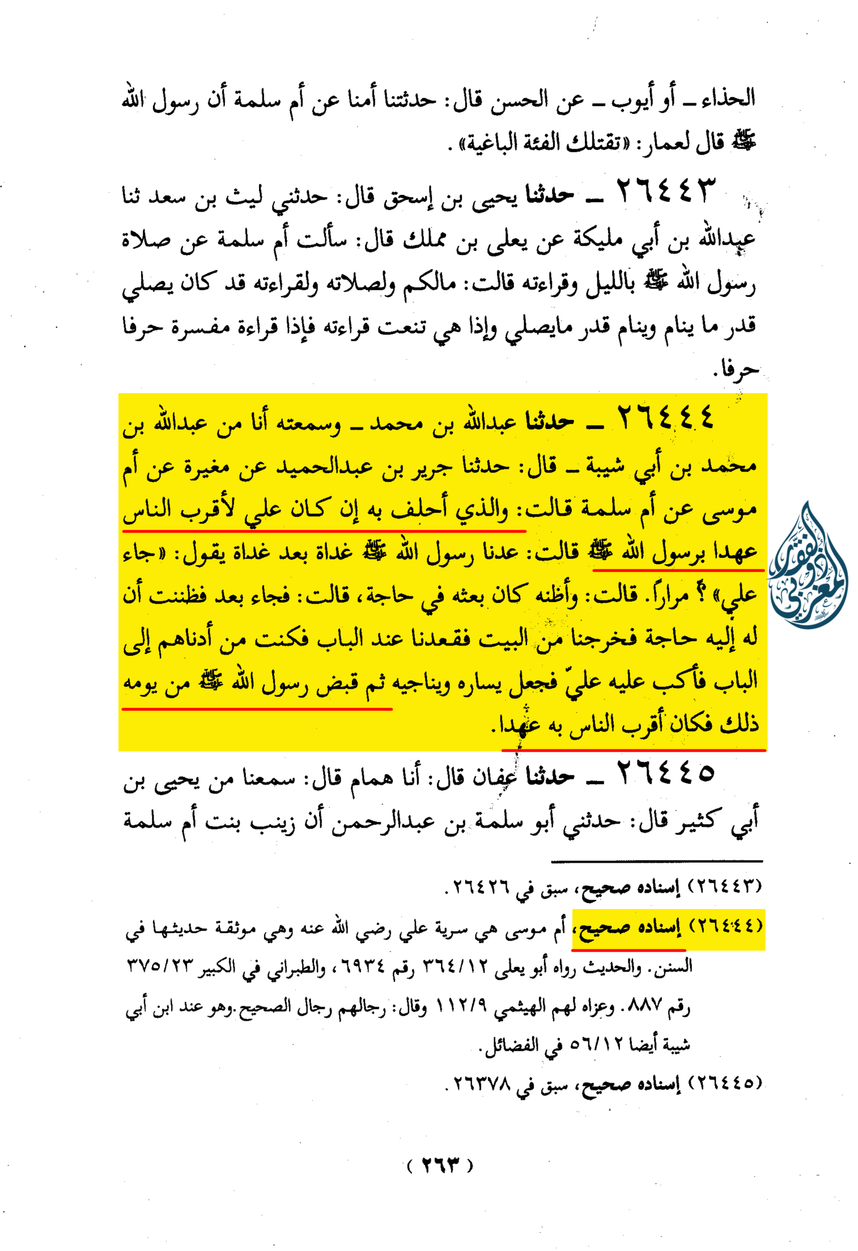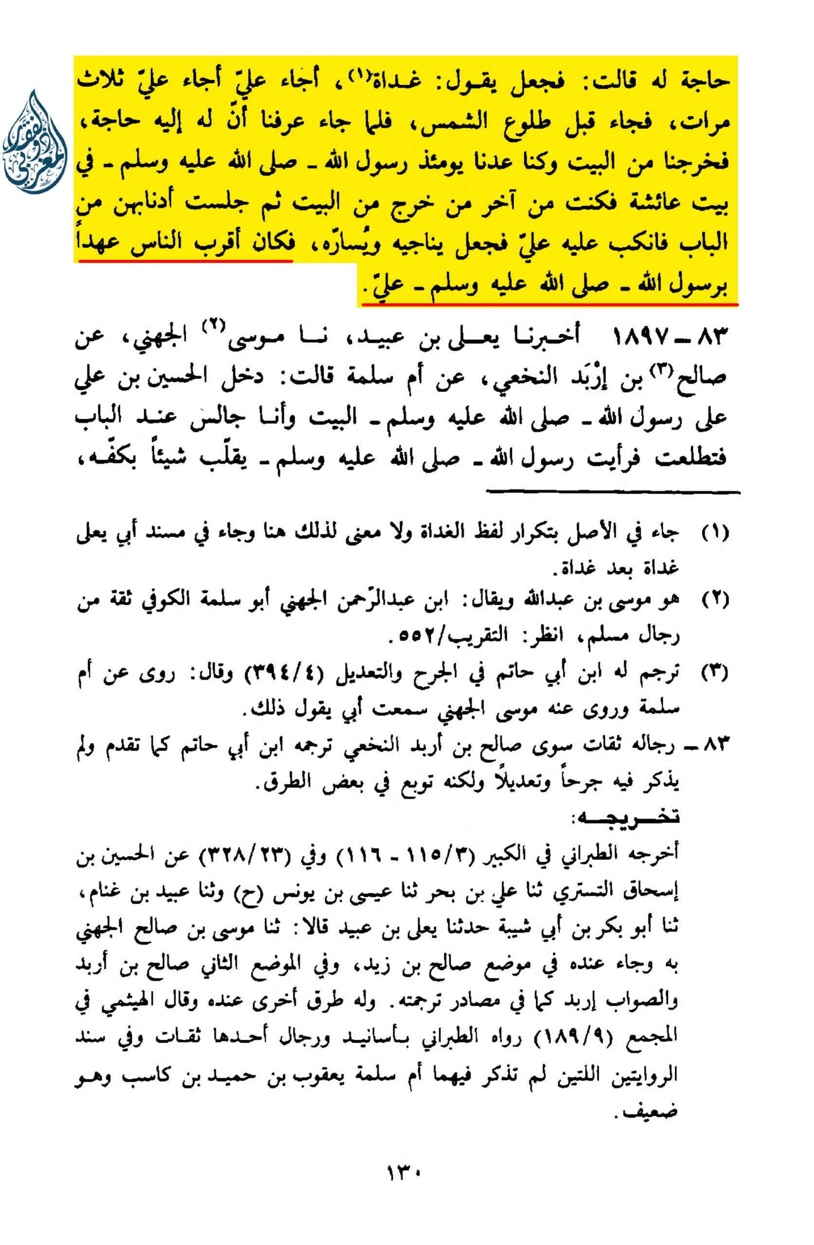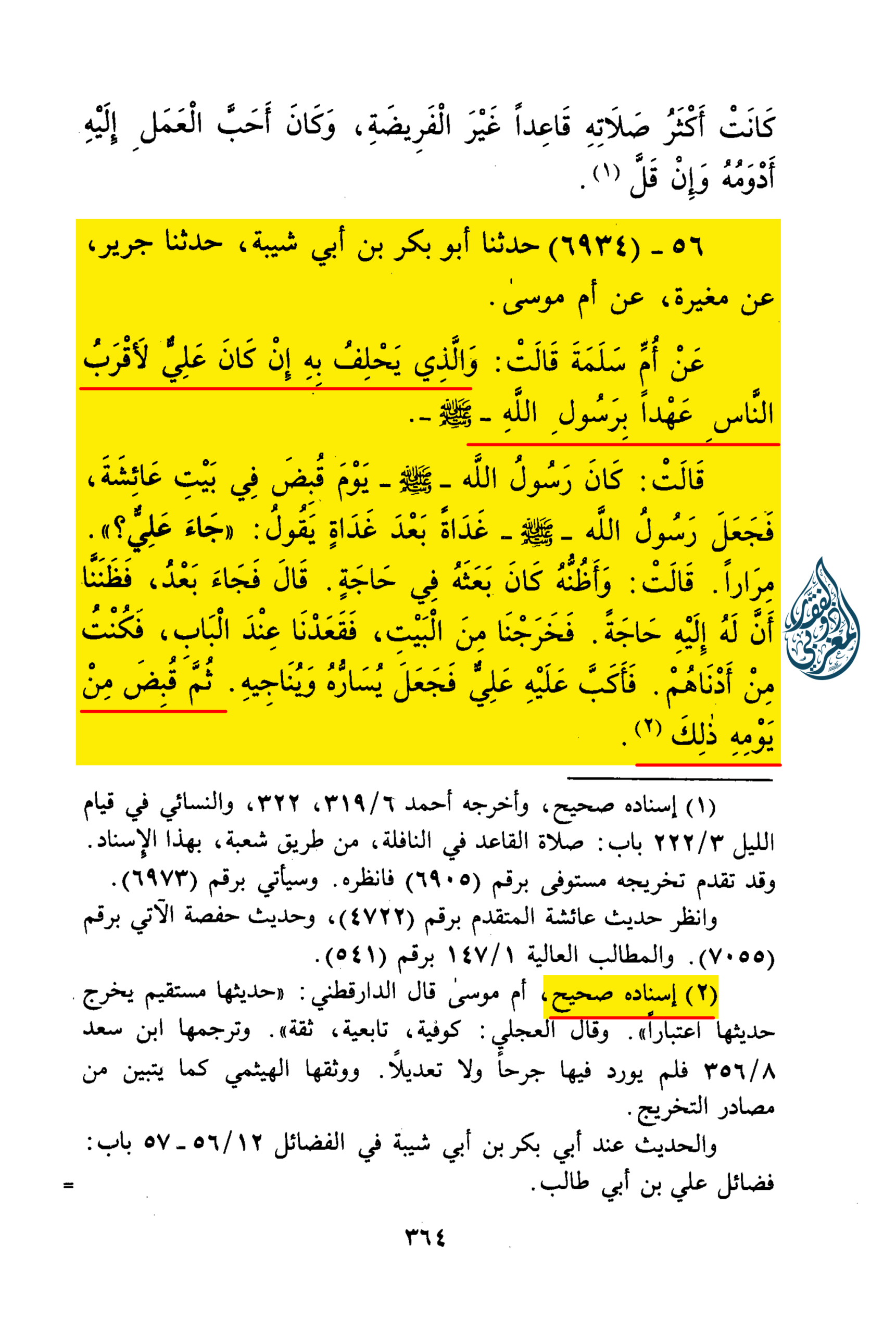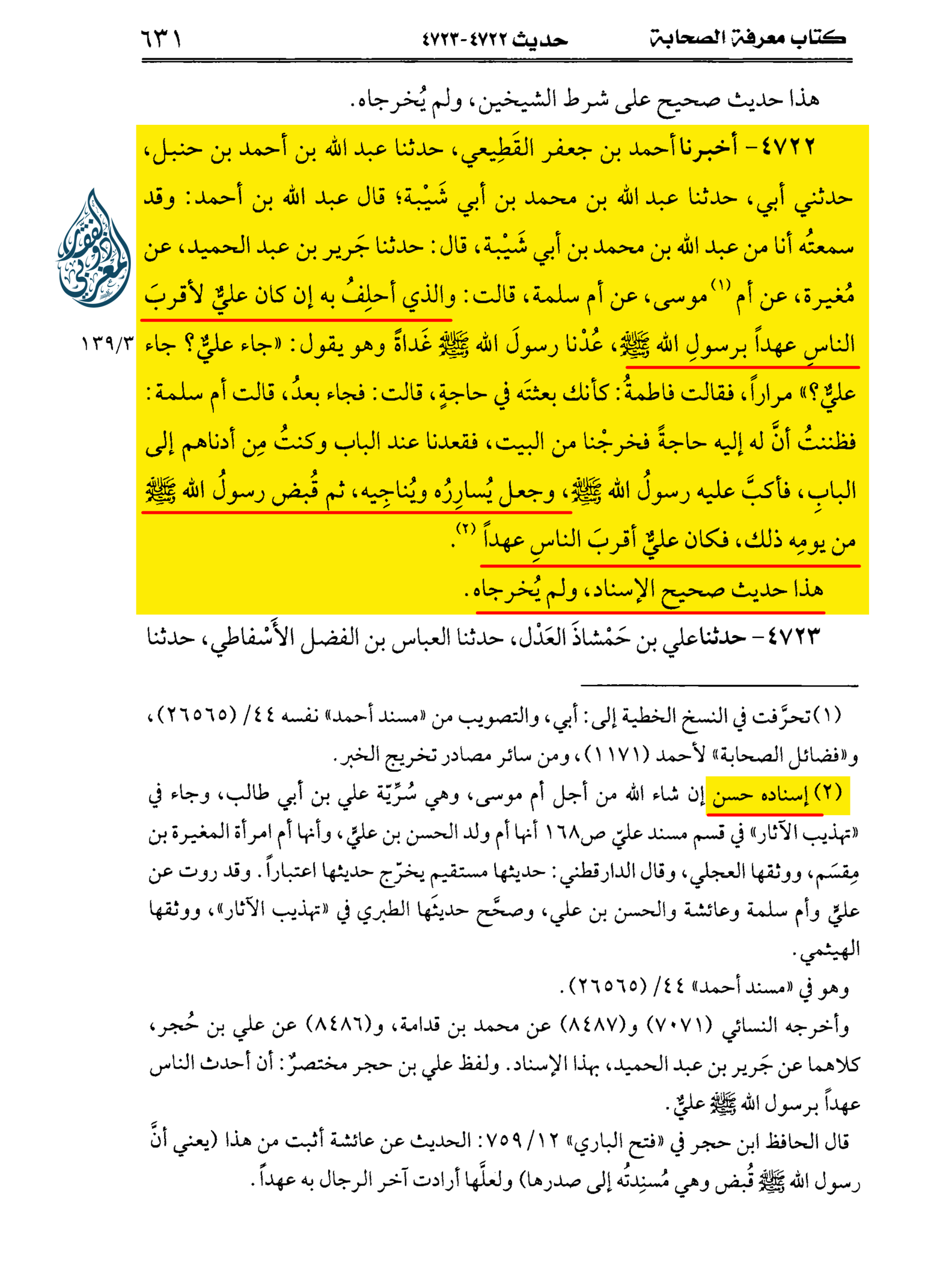 «4722 – أخبرنا أحمد بن جعفر القَطِيعي، حدثنا عبد الله بن أحمد بن حنبل، حدثني أبي، حدثنا عبد الله بن محمد بن أبي شَيْبة؛ قال عبد الله بن أحمد: وقد سمعتُه أنا من عبد الله بن محمد بن أبي شَيْبة، قال: حدثنا جَرير بن عبد الحميد، عن مُغيرة، عن أم موسى، عن أم سلمة قالت: والذي أحلِفُ به إن كان عليٌّ لأقربَ الناسِ عهدًا برسولِ الله صلى الله عليه وسلم، عُدْنا رسولَ الله صلى الله عليه وسلم غَداةً وهو يقول: “جاء عليٌّ؟ جاء عليٌّ؟ ” مرارًا، فقالت فاطمةُ: كأنك بعثتَه في حاجةٍ، قالت: فجاء بعدُ، قالت أم سلمة: فظننتُ أنَّ له إليه حاجةً فخرجْنا من البيت، فقعدنا عند الباب وكنتُ مِن أدناهم إلى البابِ، فأكبَّ عليه رسولُ الله صلى الله عليه وسلم، وجعل يُسارِرُه ويُناجِيه، ثم قُبض رسولُ الله صلى الله عليه وسلم من يومِه ذلك، فكان عليٌّ أقربَ الناسِ عهدًا.