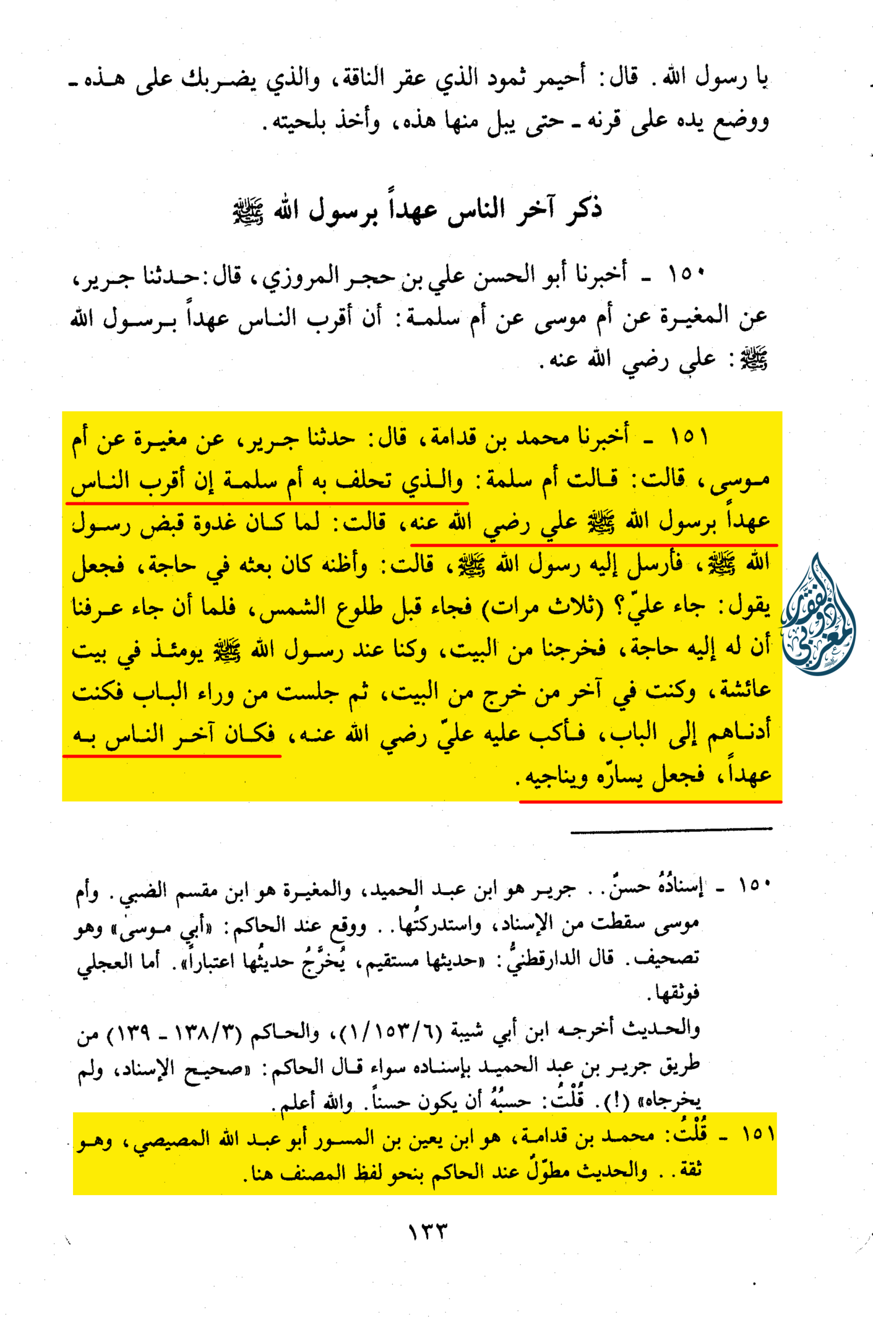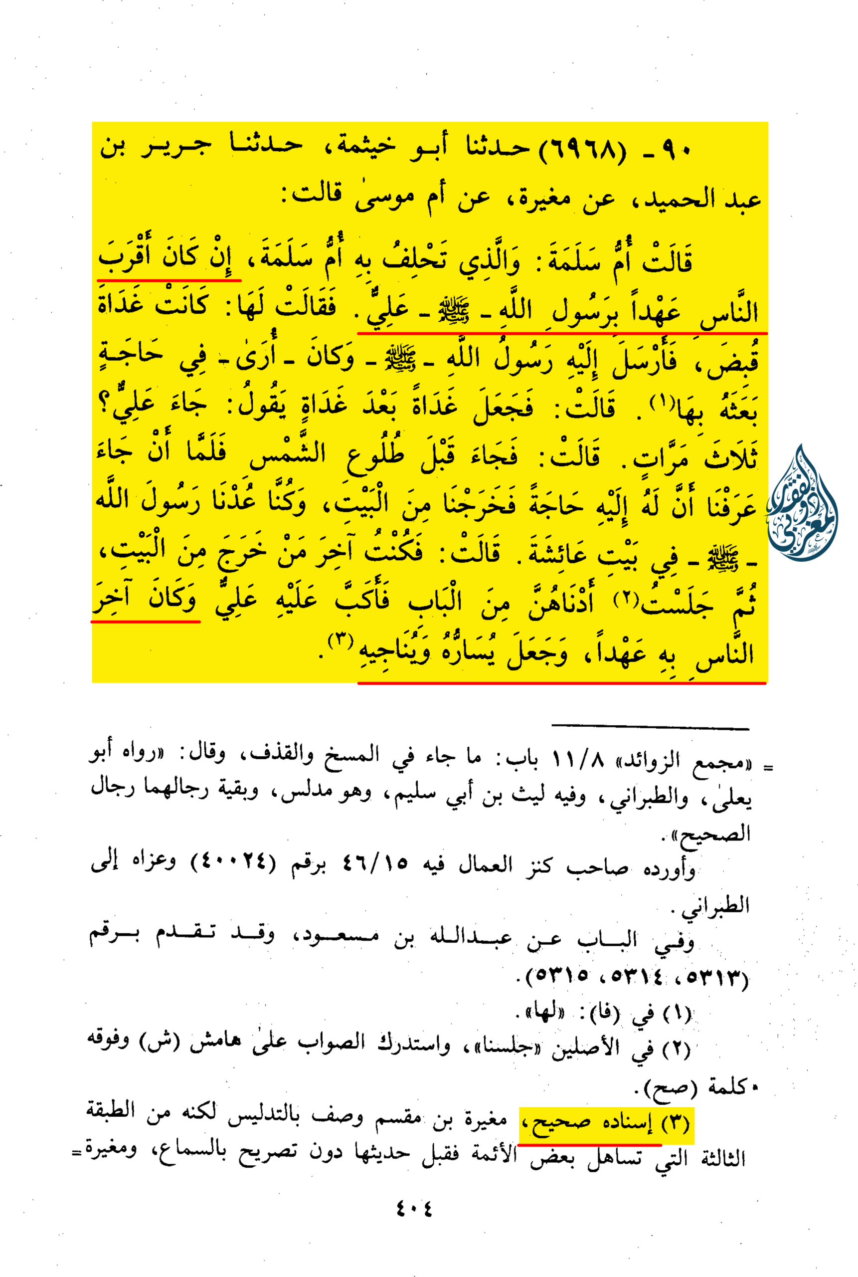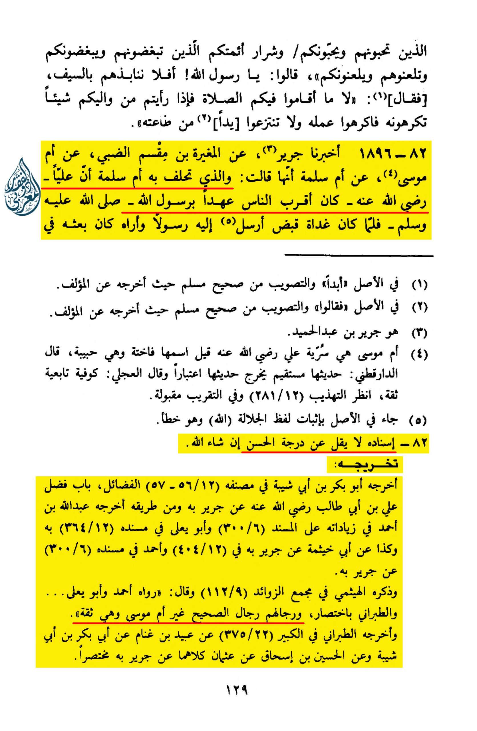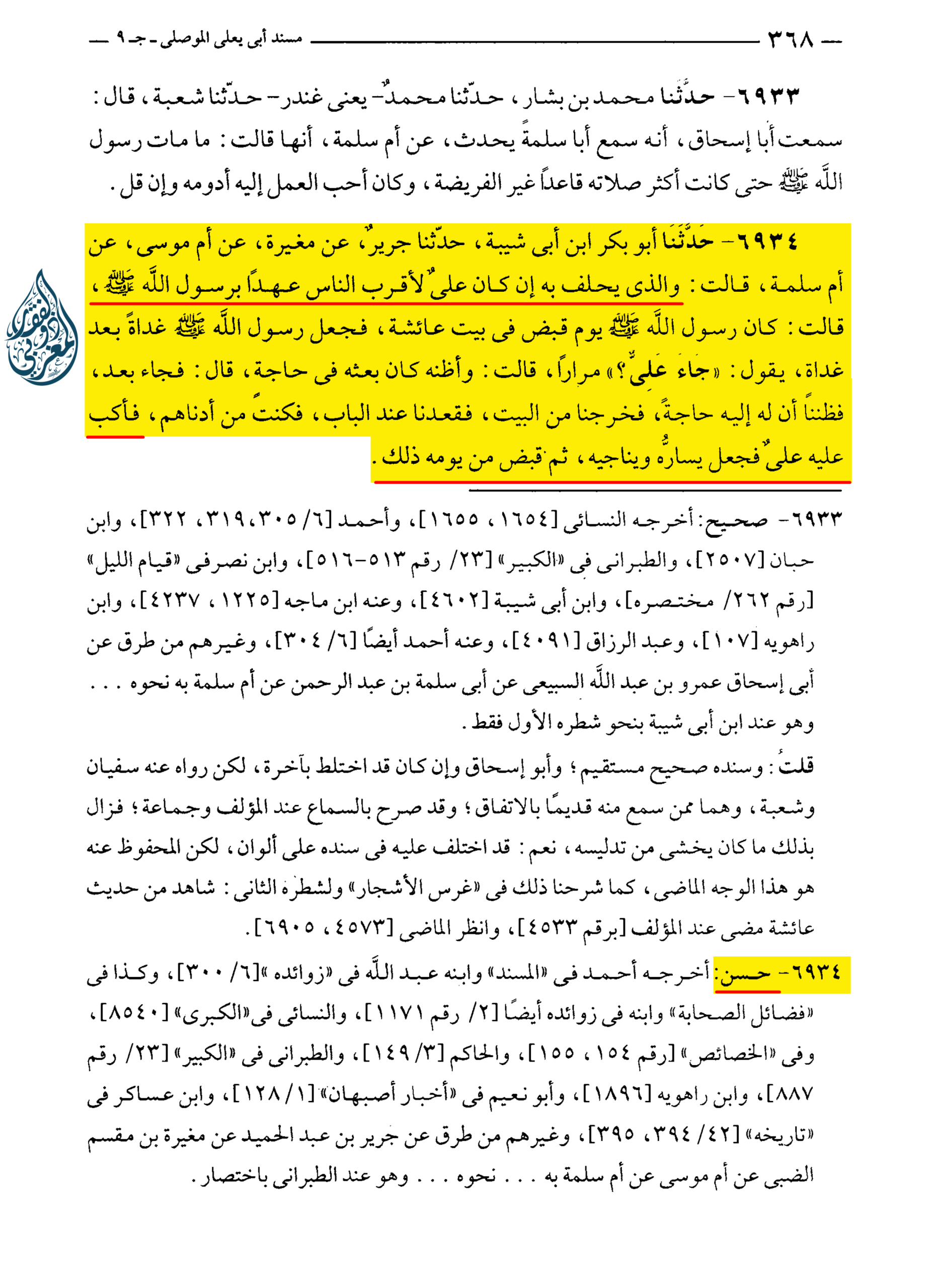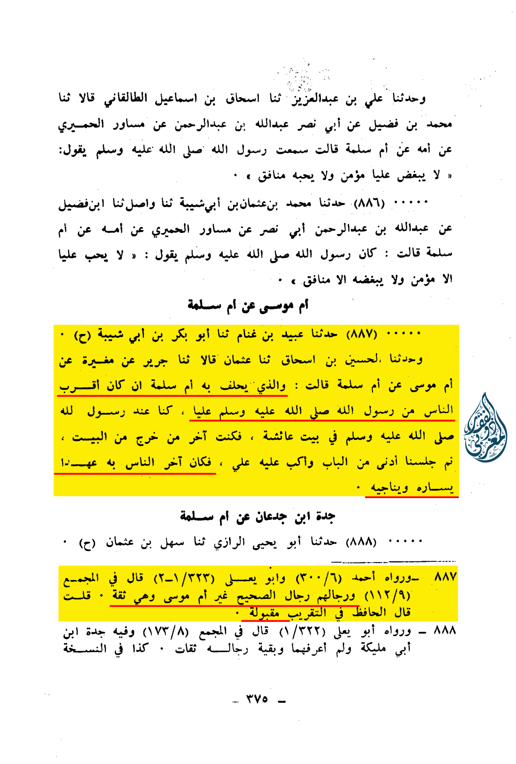«4722 – أخبرنا أحمد بن جعفر القَطِيعي، حدثنا عبد الله بن أحمد بن حنبل، حدثني أبي، حدثنا عبد الله بن محمد بن أبي شَيْبة؛ قال عبد الله بن أحمد: وقد سمعتُه أنا من عبد الله بن محمد بن أبي شَيْبة، قال: حدثنا جَرير بن عبد الحميد، عن مُغيرة، عن أم موسى، عن أم سلمة قالت: والذي أحلِفُ به إن كان عليٌّ لأقربَ الناسِ عهدًا برسولِ الله صلى الله عليه وسلم، عُدْنا رسولَ الله صلى الله عليه وسلم غَداةً وهو يقول: “جاء عليٌّ؟ جاء عليٌّ؟ ” مرارًا، فقالت فاطمةُ: كأنك بعثتَه في حاجةٍ، قالت: فجاء بعدُ، قالت أم سلمة: فظننتُ أنَّ له إليه حاجةً فخرجْنا من البيت، فقعدنا عند الباب وكنتُ مِن أدناهم إلى البابِ، فأكبَّ عليه رسولُ الله صلى الله عليه وسلم، وجعل يُسارِرُه ويُناجِيه، ثم قُبض رسولُ الله صلى الله عليه وسلم من يومِه ذلك، فكان عليٌّ أقربَ الناسِ عهدًا.