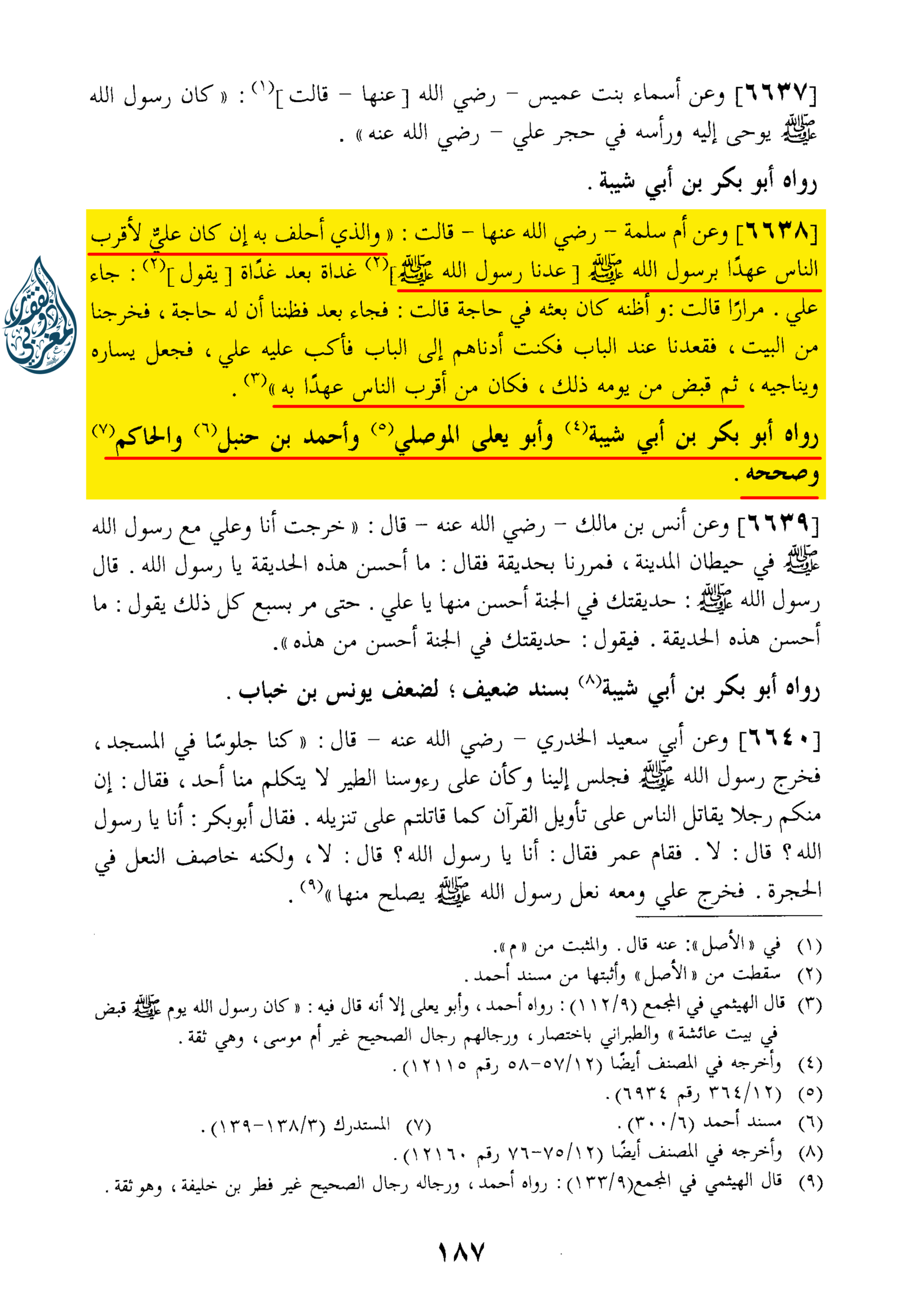 رَوَاهُ أَبُو بَكْرِ بْنُ أَبِي شَيْبَةَ وَأَبُو يَعْلَى الْمَوْصِلِيُّ وَأَحْمَدُ بْنُ حَنْبَلٍ وَالْحَاكِمُ وَصَحَّحَهُ.