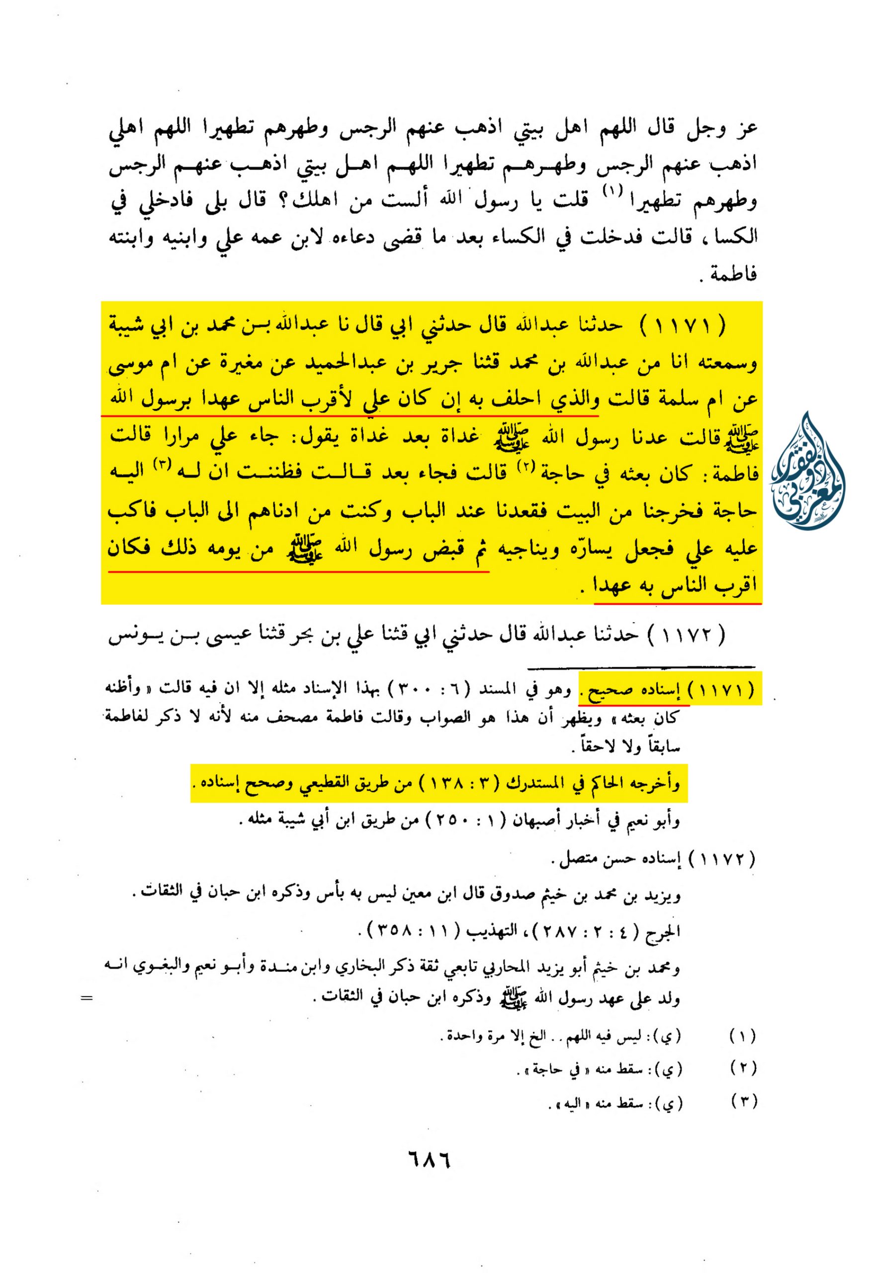 1171 – حَدَّثَنَا عَبْدُ اللَّهِ قَالَ: حَدَّثَنِي أَبِي، نا عَبْدُ اللَّهِ بْنُ مُحَمَّدِ بْنِ أَبِي شَيْبَةَ، وَسَمِعْتُهُ أَنَا مِنْ عَبْدِ اللَّهِ بْنِ مُحَمَّدٍ قثنا جَرِيرُ بْنُ عَبْدِ الْحَمِيدِ، عَنْ مُغِيرَةَ، عَنْ أُمِّ مُوسَى، عَنْ أُمِّ سَلَمَةَ قَالَتْ: وَالَّذِي أَحْلِفُ بِهِ إِنْ كَانَ عَلِيٌّ لَأَقْرَبَ النَّاسِ عَهْدًا بِرَسُولِ اللَّهِ صلى الله عليه وسلم، قَالَتْ: عُدْنَا رَسُولَ اللَّهِ صلى الله عليه وسلم غَدَاةً بَعْدَ غَدَاةٍ، يَقُولُ: «جَاءَ عَلِيٌّ؟» مِرَارًا، قَالَتْ فَاطِمَةُ: كَانَ بَعَثَهُ فِي حَاجَةٍ، قَالَتْ: فَجَاءَ بَعْدُ، قَالَتْ: فَظَنَنْتُ أَنَّ لَهُ إِلَيْهِ حَاجَةً، فَخَرَجْنَا مِنَ الْبَيْتِ فَقَعَدْنَا عِنْدَ الْبَابِ وَكُنْتُ مِنْ أَدْنَاهُمْ إِلَى الْبَابِ، فَأَكَبَّ عَلَيْهِ عَلِيٌّ فَجَعَلَ يُسَارُّهُ وَيُنَاجِيهِ، ثُمَّ قُبِضَ رَسُولُ اللَّهِ صلى الله عليه وسلم مِنْ يَوْمِهِ ذَلِكَ، فَكَانَ أَقْرَبَ النَّاسِ بِهِ عَهْدًا