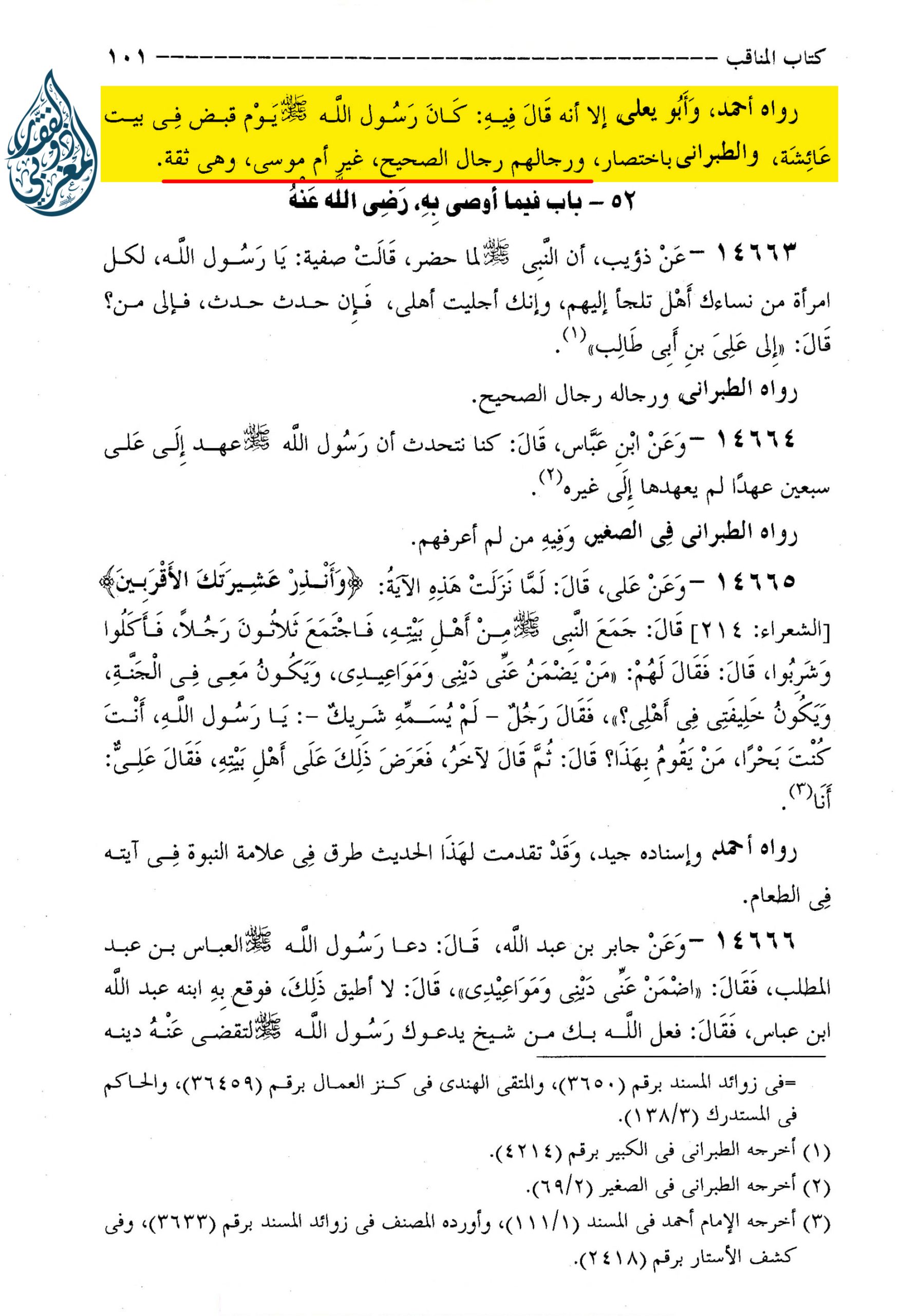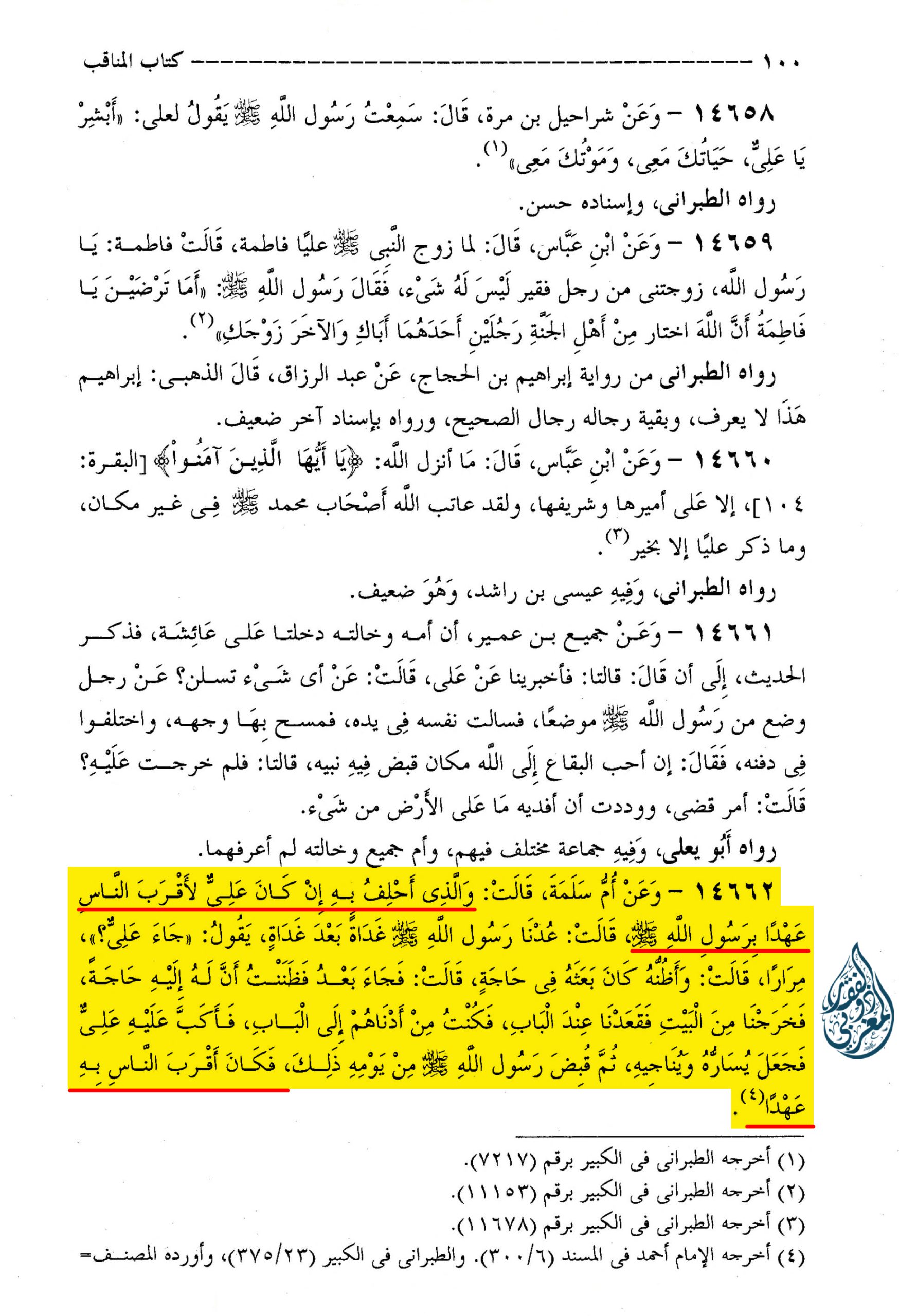 14662 – «عَنْ أُمِّ سَلَمَةَ قَالَتْ: وَالَّذِي أَحْلِفُ بِهِ أَنْ كَانَ عَلِيٌّ لَأَقْرَبَ النَّاسِ عَهْدًا بِرَسُولِ اللَّهِ صلى الله عليه وسلم. قَالَتْ: عُدْنَا رَسُولَ اللَّهِ صلى الله عليه وسلم غَدَاةً بَعْدِ غَدَاةٍ يَقُولُ: ” جَاءَ عَلِيٌّ؟ “. مِرَارًا. قَالَتْ: وَأَظُنُّهُ كَانَ بَعَثَهُ فِي حَاجَةٍ. قَالَتْ: فَجَاءَ بَعْدُ، فَظَنَنْتُ أَنَّ لَهُ إِلَيْهِ حَاجَّةً، فَخَرَجْنَا مِنَ الْبَيْتِ، فَقَعَدْنَا عِنْدَ الْبَيْتِ وَكُنْتُ مِنْ أَدْنَاهُمْ إِلَى الْبَابِ، فَأَكَبَّ عَلَيْهِ عَلِيٌّ فَجَعَلَ يُسَارُّهُ وَيُنَاجِيهِ، ثُمَّ قُبِضَ رَسُولُ اللَّهِ صلى الله عليه وسلم مِنْ يَوْمِهِ ذَلِكَ، وَكَانَ أَقْرَبَ النَّاسِ بِهِ عَهْدًا».