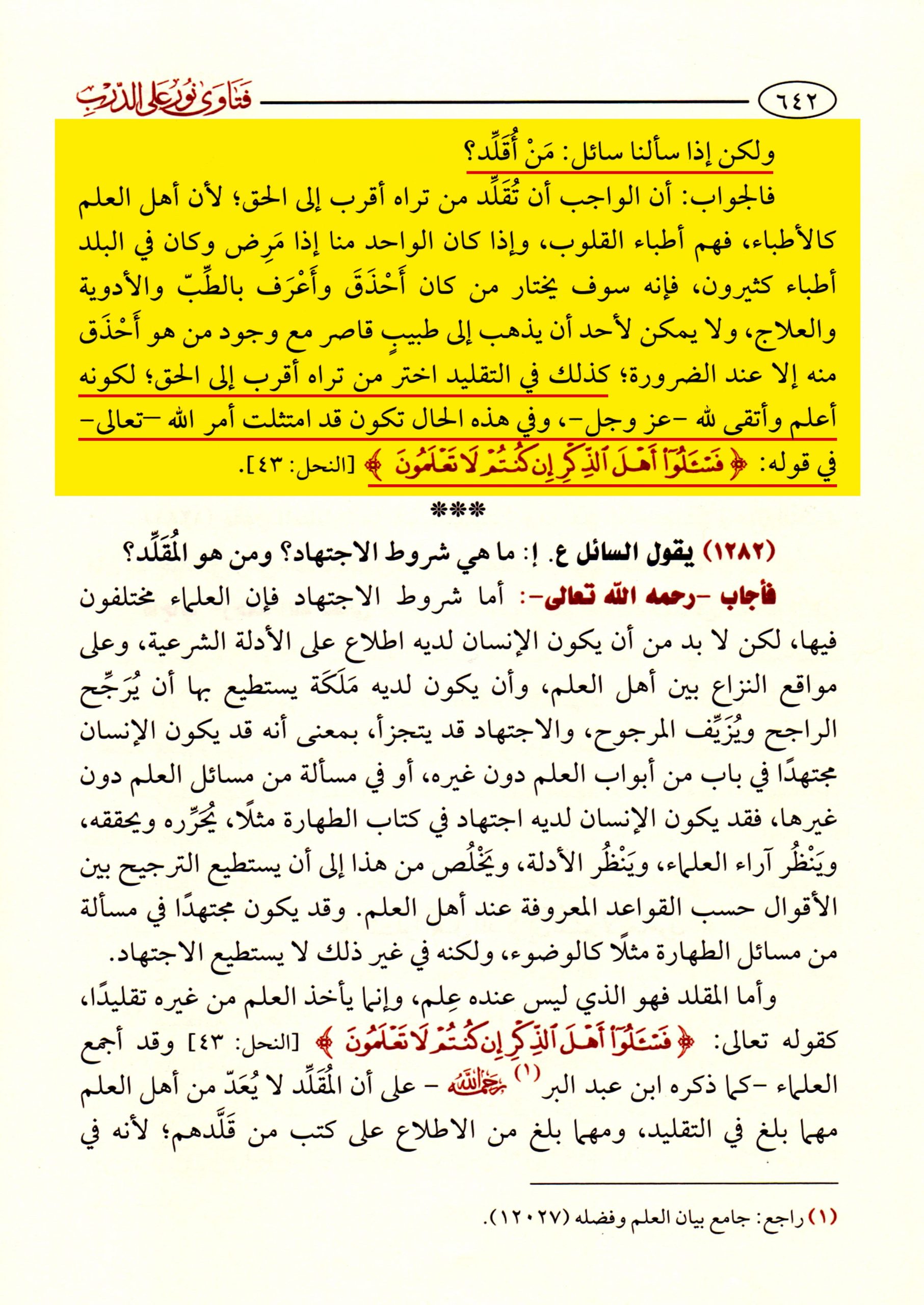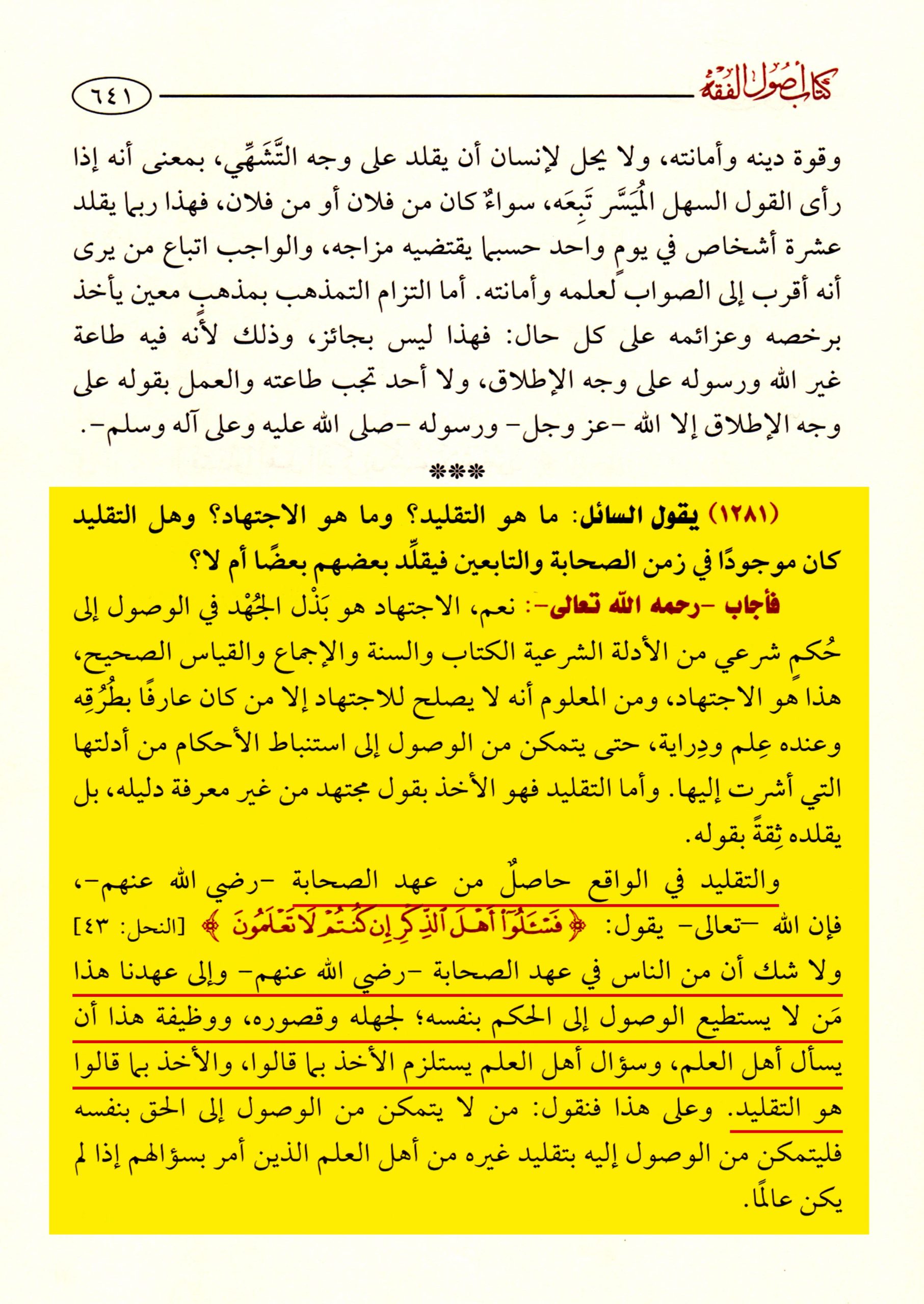 سُئِلَ الشيخ الوهابي محمد بن صالح العثيمين: ما هو التقليد؟ وما هو الاجتهاد؟ وهل التقليد كان موجوداً في زمن الصحابة والتابعين فيقلِّد بعضهم بعضاً أم لا؟