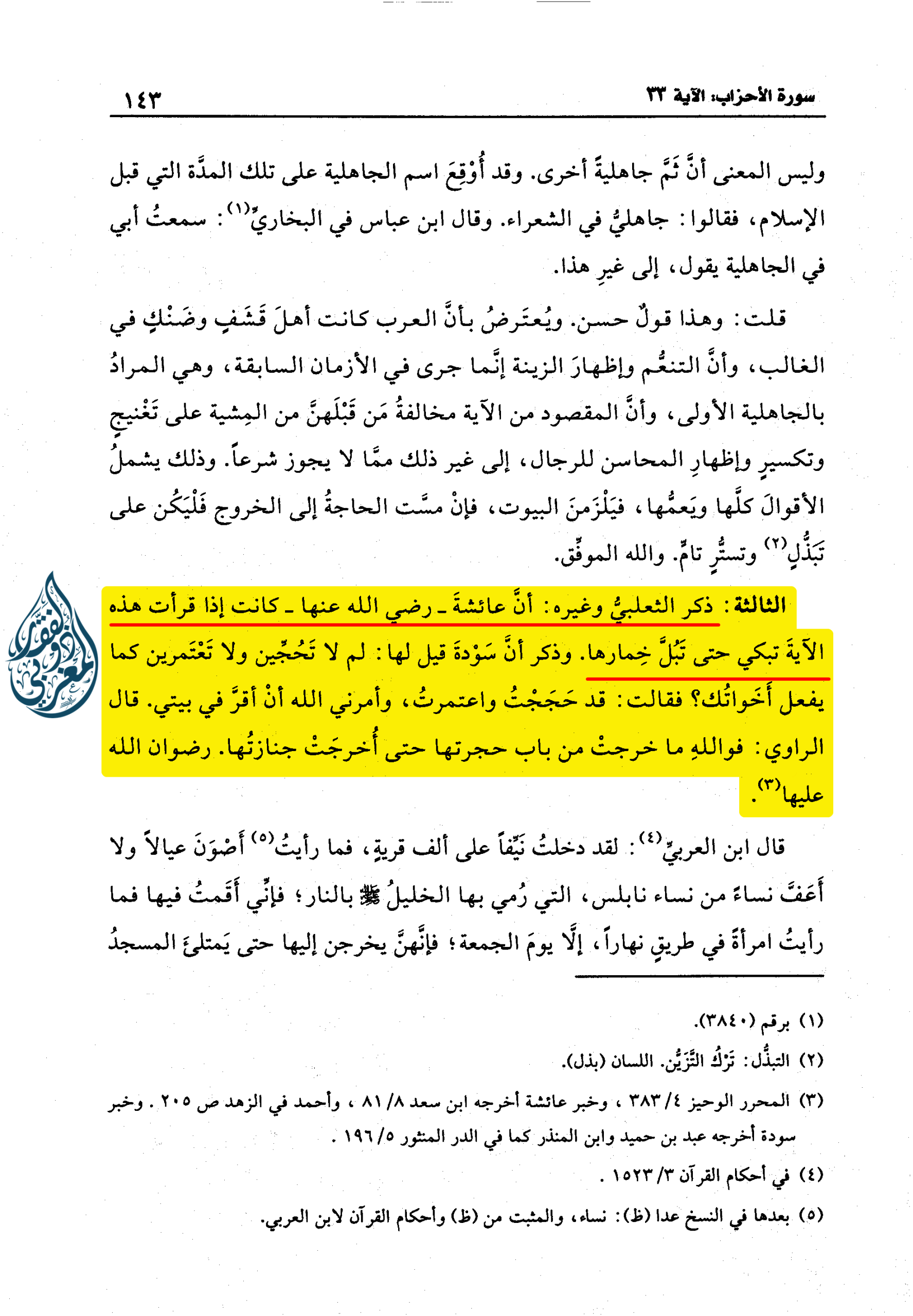 «ذَكَرَ الثَّعْلَبِيُّ وَغَيْرُهُ: أَنَّ عَائِشَةَ رضي الله عنها كَانَتْ إِذَا قَرَأَتْ هَذِهِ الْآيَةَ ‌تَبْكِي ‌حَتَّى تَبُلَّ خِمَارَهَا. وَذَكَرَ أَنَّ سَوْدَةَ قِيلَ لَهَا: لِمَ لَا تَحُجِّينَ وَلَا تَعْتَمِرِينَ كما يفعل أَخَوَاتُكِ؟ فَقَالَتْ: قَدْ حَجَجْتُ وَاعْتَمَرْتُ، وَأَمَرَنِي اللَّهُ أَنْ أَقِرَّ فِي بَيْتِي. قَالَ الرَّاوِي: فَوَاللَّهِ مَا خَرَجَتْ مِنْ بَابِ حُجْرَتِهَا حَتَّى أُخْرِجَتْ جِنَازَتُهَا. رِضْوَانُ اللَّهِ عَلَيْهَا!