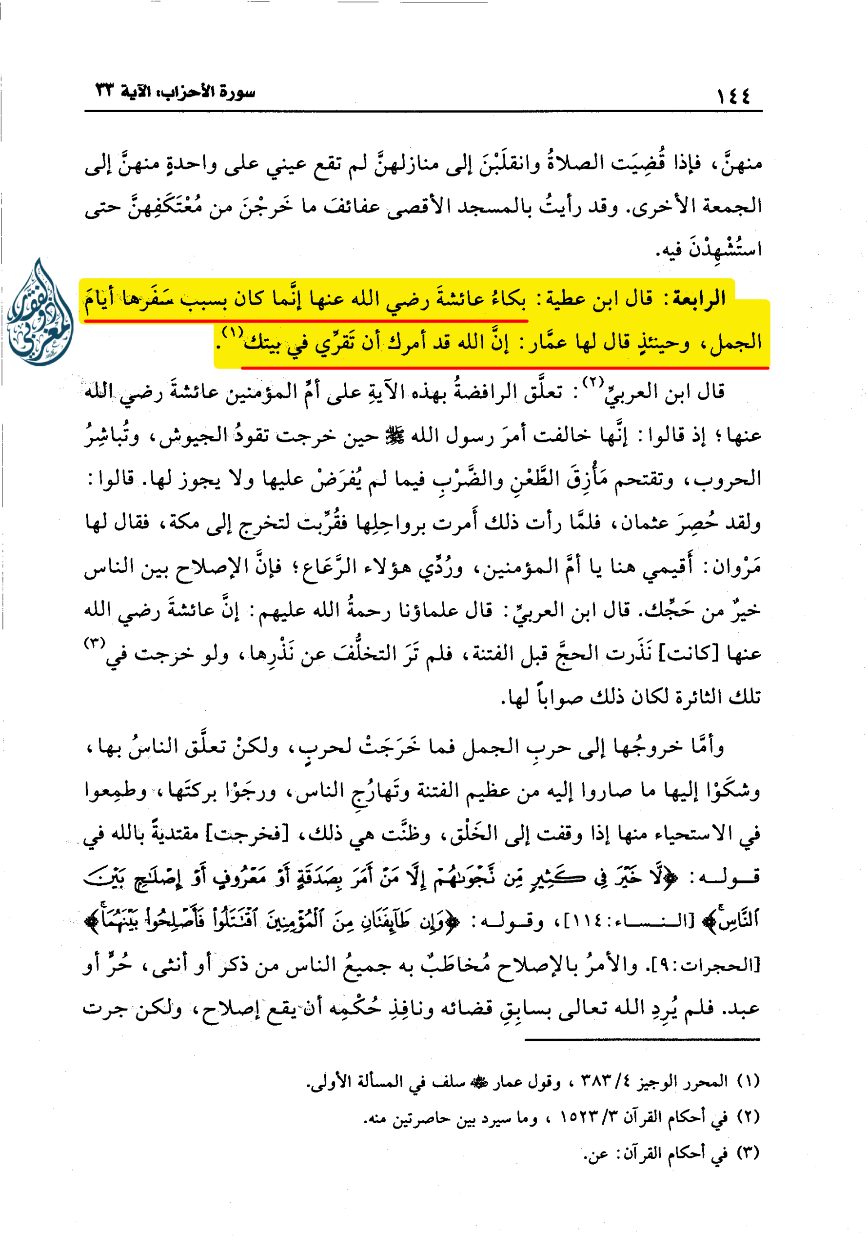 الرَّابِعَةُ- قَالَ ابْنُ عَطِيَّةَ: بُكَاءُ عَائِشَةَ رضي الله عنها إِنَّمَا كَانَ بِسَبَبِ سَفَرِهَا أَيَّامَ الْجَمَلِ، وَحِينَئِذٍ قَالَ لَهَا عَمَّارٌ: إِنَّ اللَّهَ قَدْ أَمَرَكِ أَنْ تَقِرِّي فِي بَيْتِكِ.