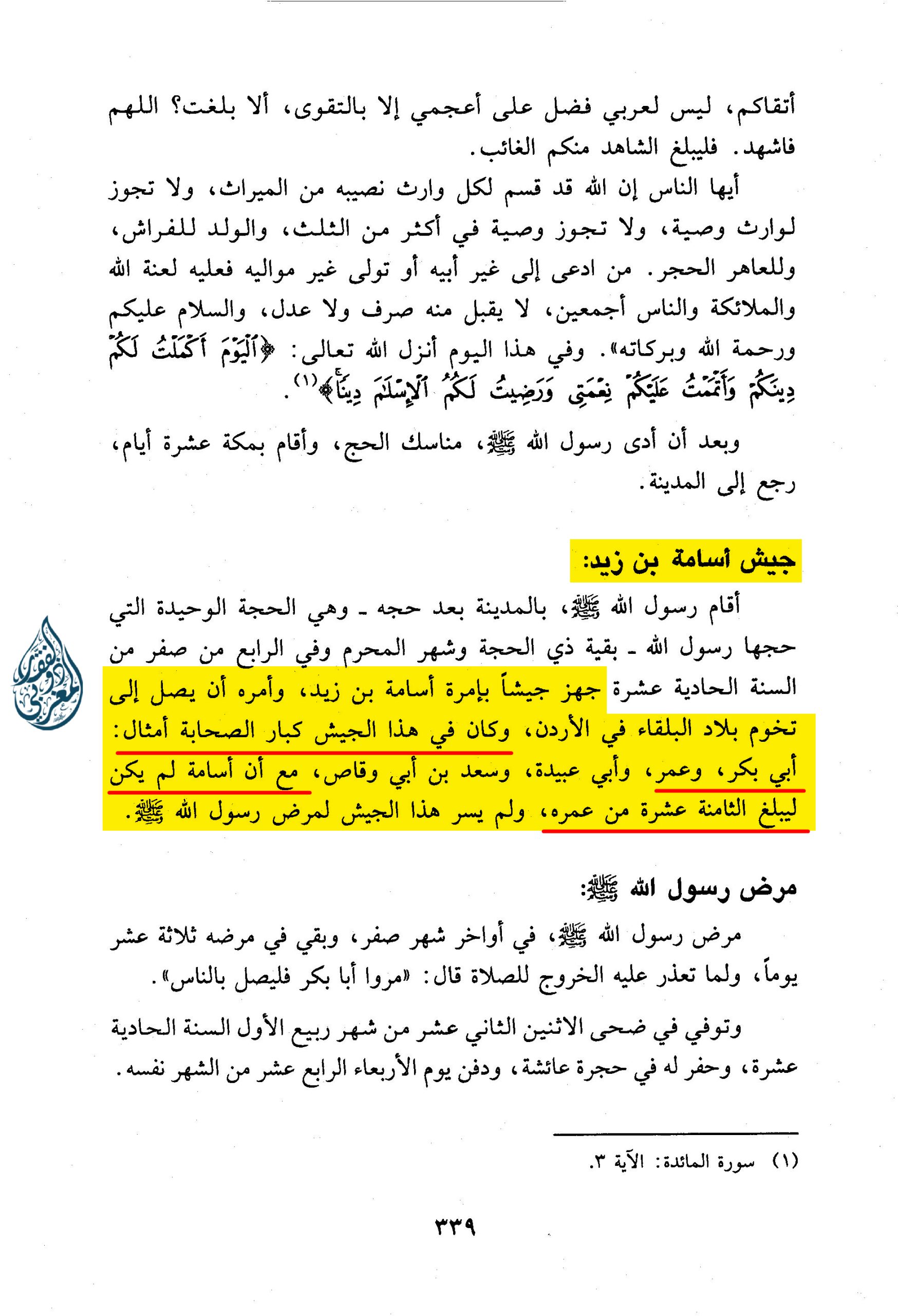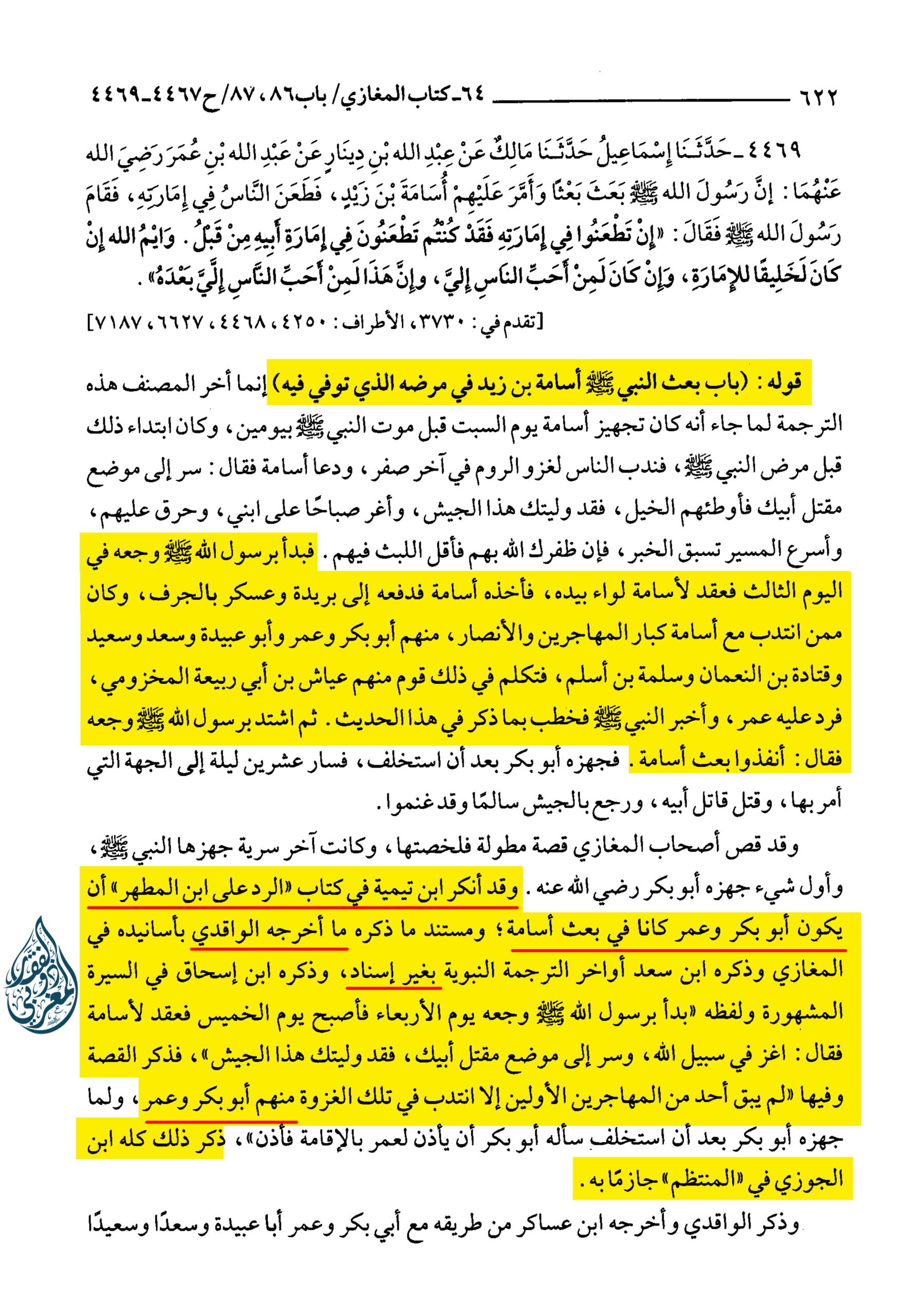 وقد قص أصحاب المغازي قصة مطولة فلخصتها، وكانت آخر سرية جهزها النبي صلى الله عليه وسلم، وأول شيء جهزه أبو بكر رضي الله عنه، وقد أنكر ابن تيمية في كتاب الرد على ابن المطهر أن يكون أبو بكر، وعمر كانا في بعث أسامة ; ومستند ما ذكره ما أخرجه الواقدي بأسانيده في المغازي وذكره ابن سعد أواخر الترجمة النبوية بغير إسناد. وذكره ابن إسحاق في السيرة المشهورة ولفظه بدأ برسول الله صلى الله عليه وسلم وجعه يوم الأربعاء فأصبح يوم الخميس فعقد لأسامة فقال: اغز في سبيل الله وسر إلى موضع مقتل أبيك، فقد وليتك هذا الجيش فذكر القصة وفيها لم يبق أحد من المهاجرين الأولين إلا انتدب في تلك الغزوة منهم أبو بكر، وعمر، ولما جهزه أبو بكر بعد أن استخلف سأله أبو بكر أن يأذن لعمر بالإقامة فأذن، ذكر ذلك كله ابن الجوزي في المنتظم جازما به،»