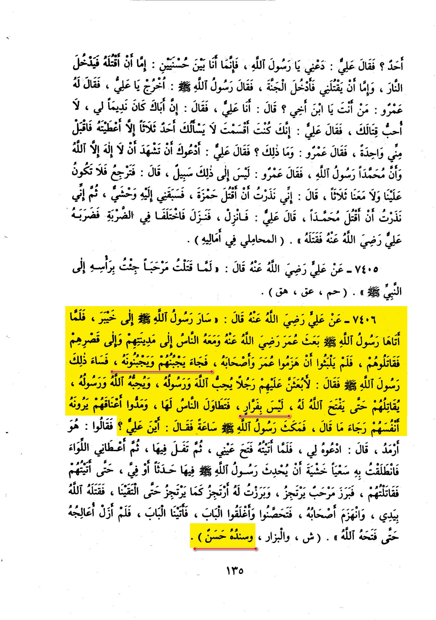 عن على قال: سار رسول الله صلى الله عليه وسلم إلى خيبر فلما آتاها رسول الله صلى الله عليه وسلم بعث عمر ومعه الناس إلى مدينتهم أو إلى قصرهم فقاتلوهم فلم يلبثوا أن هزموا عمر وأصحابه فجاء يجبنهم ويجبنونه فساء ذلك رسول الله صلى الله عليه وسلم فقال لأبعثن عليهم رجلا يحب الله ورسوله ويحبه الله ورسوله يقاتلهم حتى يفتح الله له ليس بفرار فتطاول الناس لها ومدوا أعناقهم يرونه أنفسهم رجاء ما قال فمكث رسول الله صلى الله عليه وسلم ساعة فقال أين على فقالوا هو أرمد قال ادعوه لى فلما أتيته فتح عينى ثم تفل فيها ثم أعطانى اللواء فانطلقت به سعيا خشية أن يحدث رسول الله صلى الله عليه وسلم فيهم حدثا أو فى حتى أتيتهم فقاتلتهم فبرز مرحب يرتجز وبرزت له أرتجز كما يرتجز حتى التقينا فقتله الله بيدى وانهزم أصحابه فتحصنوا وأغلقوا الباب فأتينا الباب فلم أزل أعالجه حتى فتحه الله (ابن أبى شيبة، والبزار وسنده حسن) [كنز العمال 30119]