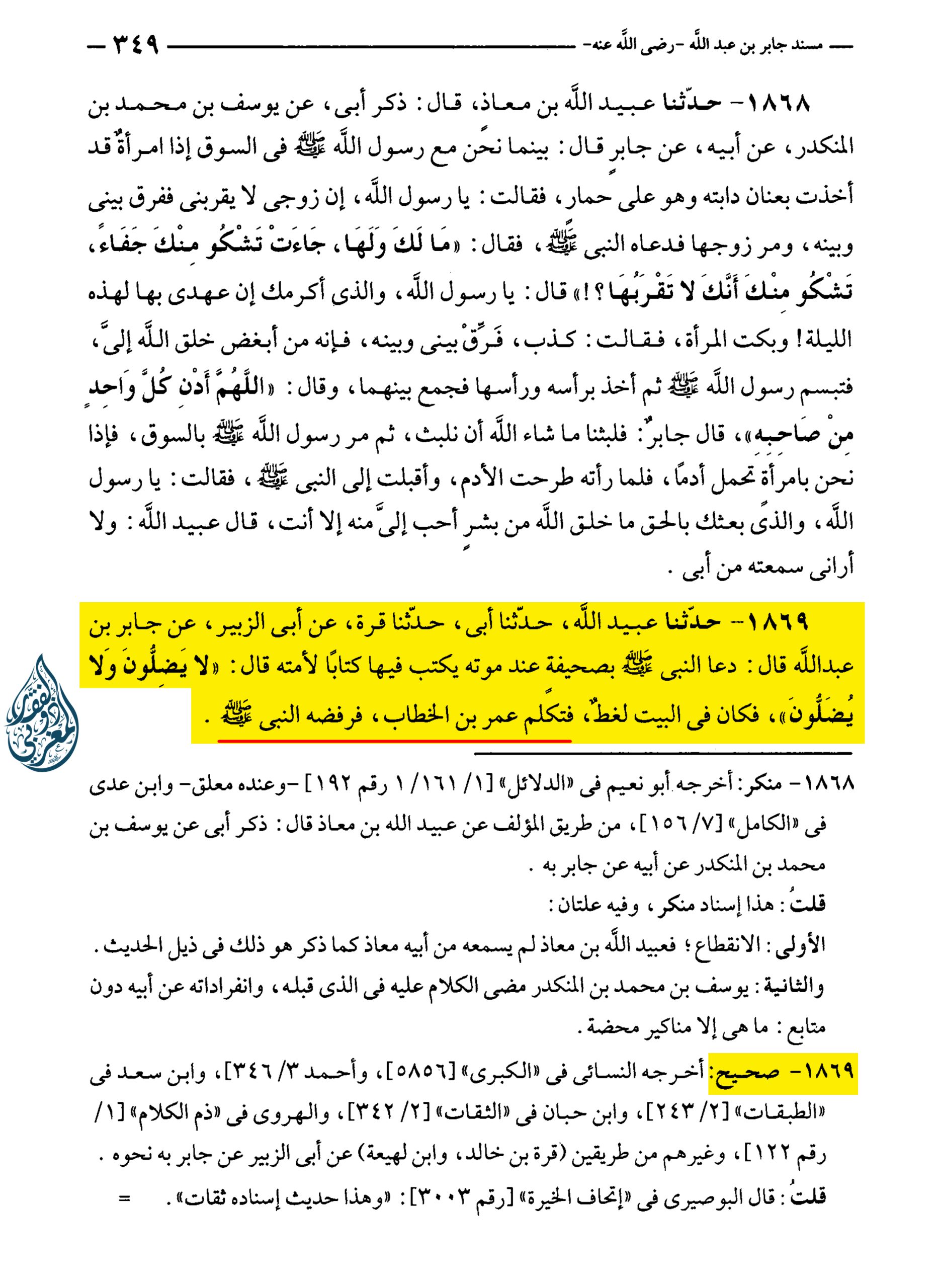 «1869 – حدّثنا عبيد الله، حدّثنا أبى، حدّثنا قرة، عن أبى الزبير، عن جابر بن عبد الله قال: دعا النبي صلى الله عليه وسلم بصحيفة عند موته يكتب فيها كتابًا لأمته قال: “لا يَضِلّونَ وَلا يُضَلّونَ”، فكان في البيت لغطٌ، ‌فتكلم ‌عمر ‌بن ‌الخطاب، فرفضه النبي صلى الله عليه وسلم 1869 – صحيح:
