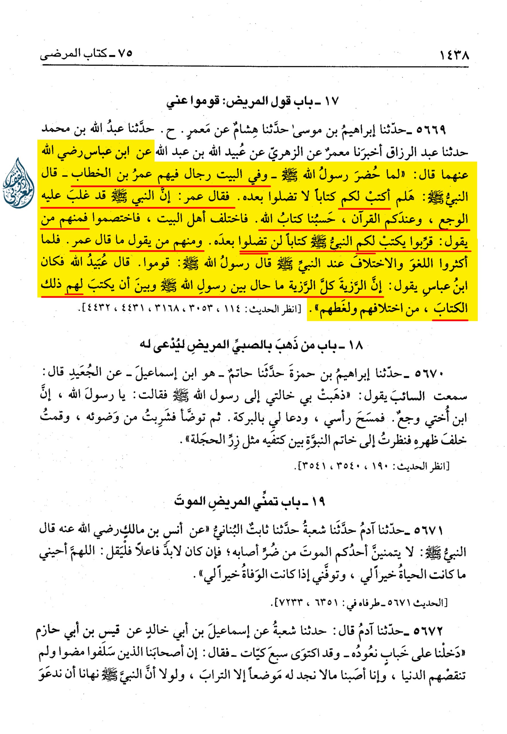 • [5669] حدثنا إِبْرَاهِيمُ بْنُ مُوسَى، حَدَّثَنَا هِشَامٌ، عَنْ مَعْمَرٍ. وَ حَدَّثَنِي عَبْدُ اللَّهِ بْنُ مُحَمَّدٍ، حَدَّثَنَا عَبْدُ الرَّزَّاقِ، أَخْبَرَنَا مَعْمَرٌ، عَنِ الزُّهْرِيِّ، عَنْ عُبَيْدِ اللَّهِ بْنِ عَبْدِ اللَّهِ، عَنِ ابْنِ عَبَّاسٍ رضي الله عنهما قَالَ: لَمَّا حُضِرَ رَسُولُ اللَّهِ صلى الله عليه وسلم وَفي الْبَيْتِ رِجَالٌ، فِيهِمْ عُمَرُ بْنُ الْخَطَّابِ قَالَ النَّبِيُّ صلى الله عليه وسلم: “هَلُمَّ أَكْتُبْ لَكُمْ كِتَابًا لَا تَضِلُّوا بَعْدَهُ” فَقَالَ عُمَرُ: إِنَّ النَّبِيَّ صلى الله عليه وسلم قَدْ غَلَبَ عَلَيْهِ الْوَجَعُ، وَعِنْدَكُمُ الْقُرْآنُ، حَسْبُنَا كِتَابُ اللَّهِ، فَاخْتَلَفَ أَهْلُ الْبَيْتِ، فَاخْتَصَمُوا؛ مِنْهُمْ مَنْ يَقُولُ: قَرِّبُوا يَكْتُبْ لَكُمُ النَّبِيُّ صلى الله عليه وسلم كِتَابًا لَنْ تَضِلُّوا بَعْدَهُ، وَمِنْهُمْ مَنْ يَقُولُ مَا قَالَ عُمَرُ، فَلَمَّا أَكْثَرُوا اللَّغْوَ وَالإِخْتِلَافَ عِنْدَ النَّبِيِّ صلى الله عليه وسلم، قَالَ رَسُولُ اللَّهِ صلى الله عليه وسلم: “قُومُوا”.