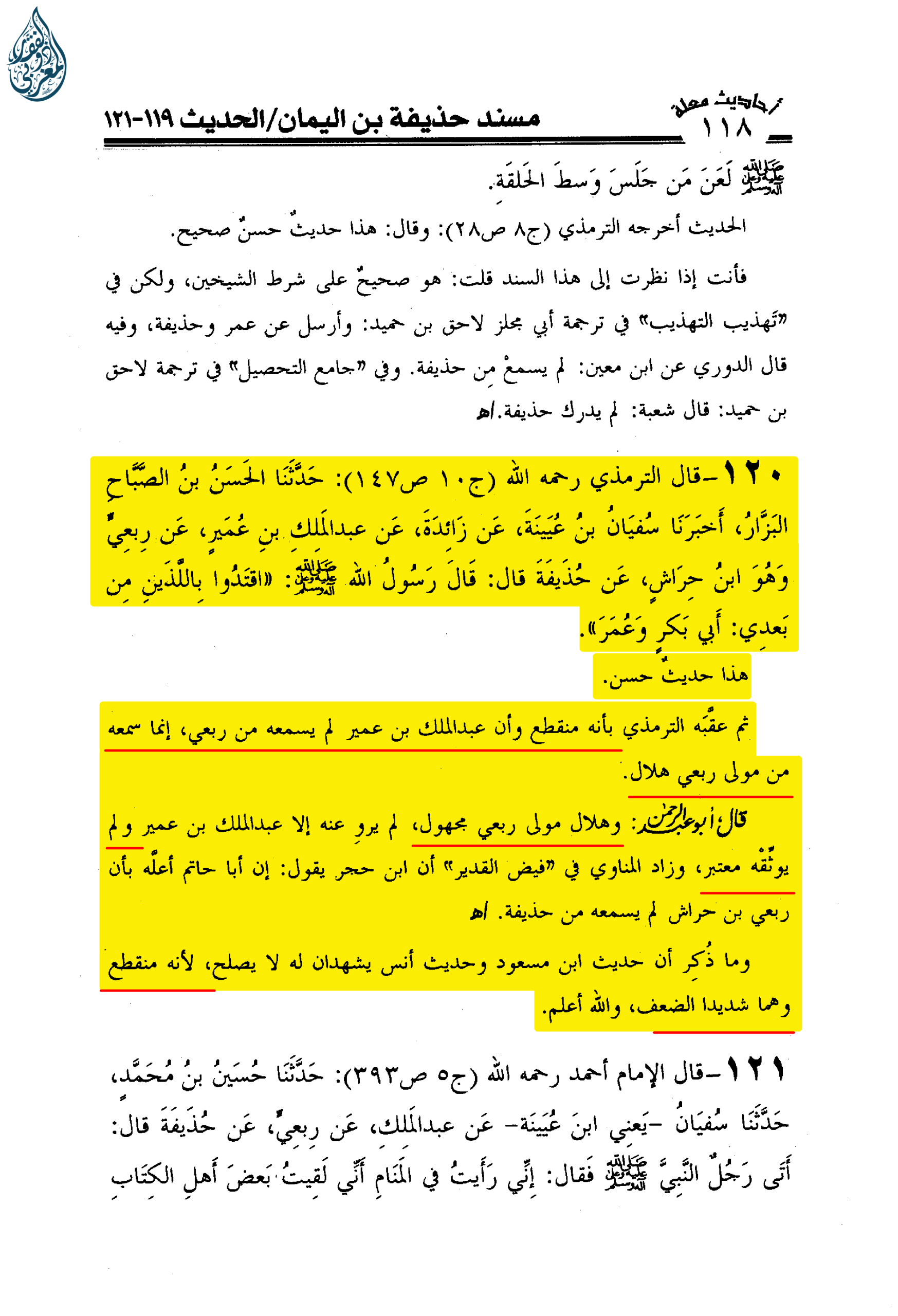 «120-قال الترمذي رحمه الله (ج10ص147) : حَدَّثَنَا الْحَسَنُ بْنُ الصَّبَّاحِ الْبَزَّارُ حَدَّثَنَا سُفْيَانُ بْنُ عُيَيْنَةَ عَنْ زَائِدَةَ عَنْ عَبْدِ الْمَلِكِ بْنِ عُمَيْرٍ عَنْ رِبْعِيٍّ وَهُوَ ابْنُ حِرَاشٍ عَنْ حُذَيْفَةَ قَالَ قَالَ رَسُولُ اللَّهِ صَلَّى اللَّهُ عَلَيْهِ وعلى آله وَسَلَّمَ اقْتَدُوا بِاللَّذَيْنِ مِنْ بَعْدِي أَبِي بَكْرٍ وَعُمَرَ.