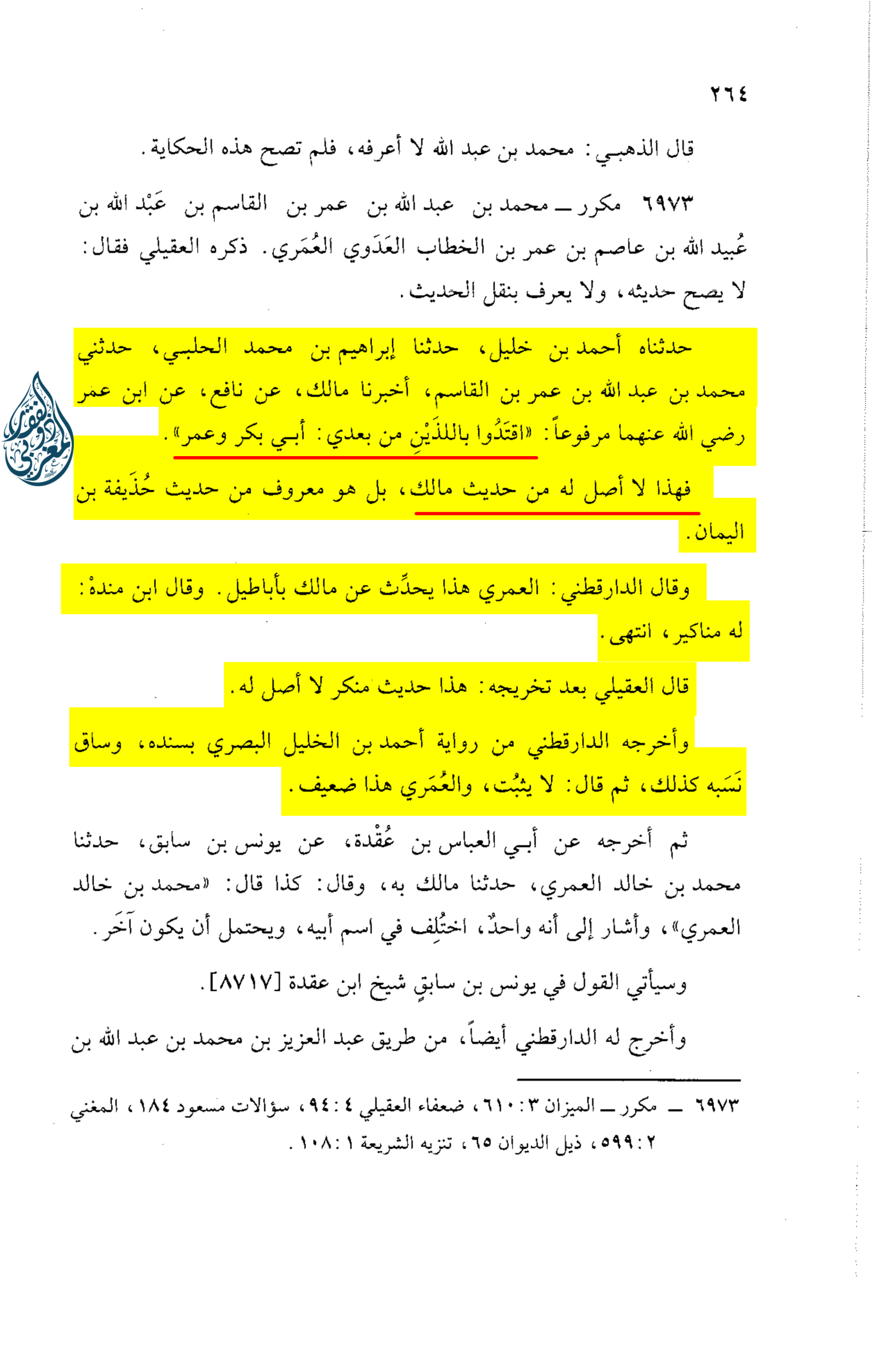«حدثنا أحمد بن خليل قال ثنا إبراهيم بن محمد الحلبي حدثني محمد بن عبد الله بن عمر بن القاسم أنا مالك عن نافع عن ابن عمر رضى الله عنهما مرفوعا اقتدوا بالذين من بعدي أبي بكر وعمر فهذا لا أصل له من حديث مالك بل هو معروف من حديث حذيفة بن اليمان وقال الدارقطني العمري هذا يحدث عن مالك بأباطيل وقال ابن مندة: له مناكير انتهى وقال العقيلي بعد تخريجه هذا حديث منكر لا أصل له وأخرجه الدارقطني من رواية أحمد الخليلي الضمري بسنده وساق بسند كذلك ثم قال: لا يثبت والعمري هذا ضعيف»