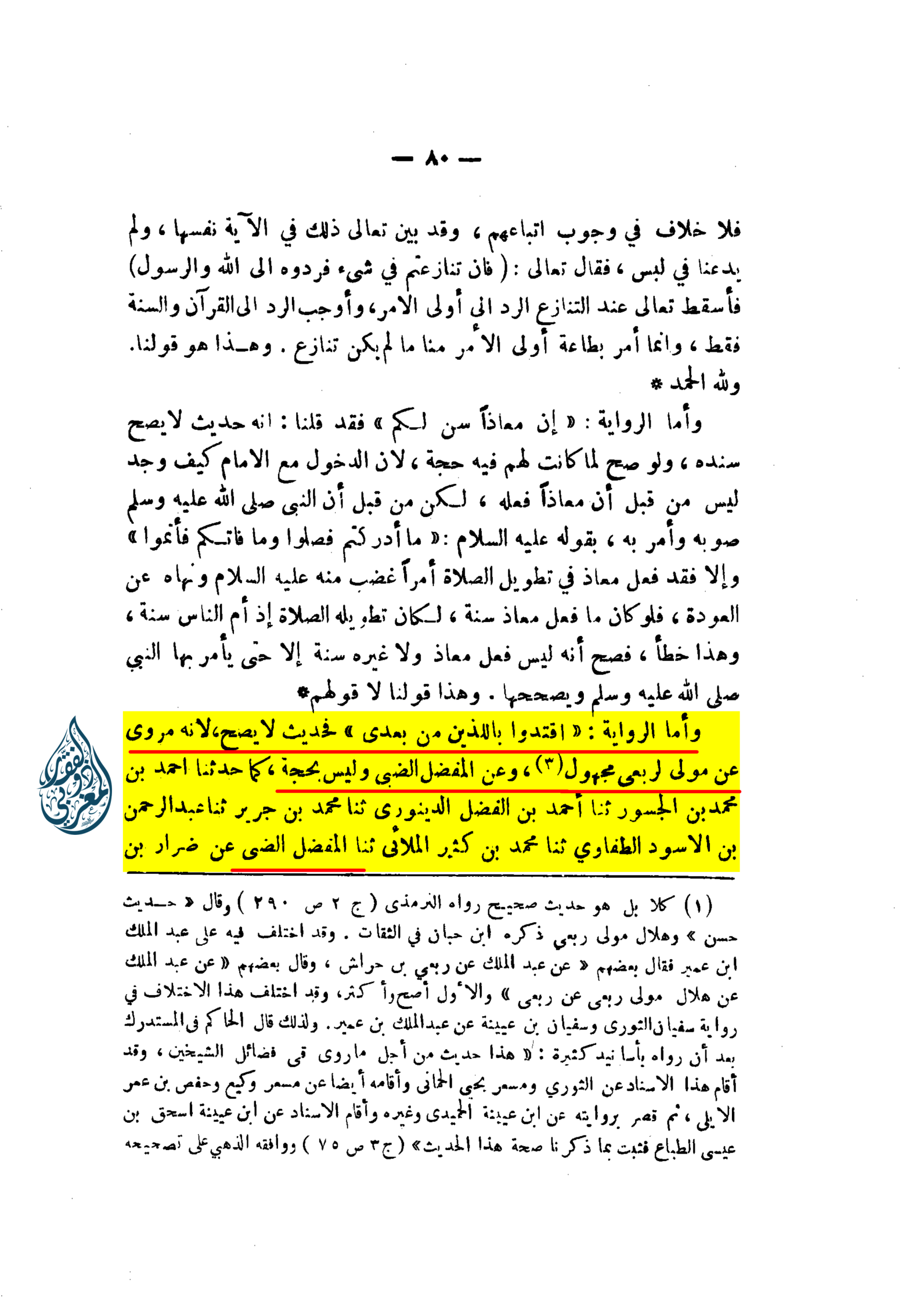 وأما الرواية اقتدوا باللذين من بعدي فحديث لا يصح لأنه مروي عن مولى لربعي مجهول وعن المفضل الضبي وليس بحجة كما حدثنا أحمد بن محمد بن الجسور نا أحمد بن الفضل الدينوري نا محمد بن جبير نا عبد الرحمن بن الأسود الطفاوي نا محمد بن كثير الملائي نا المفضل الضبي عن ضرار بن