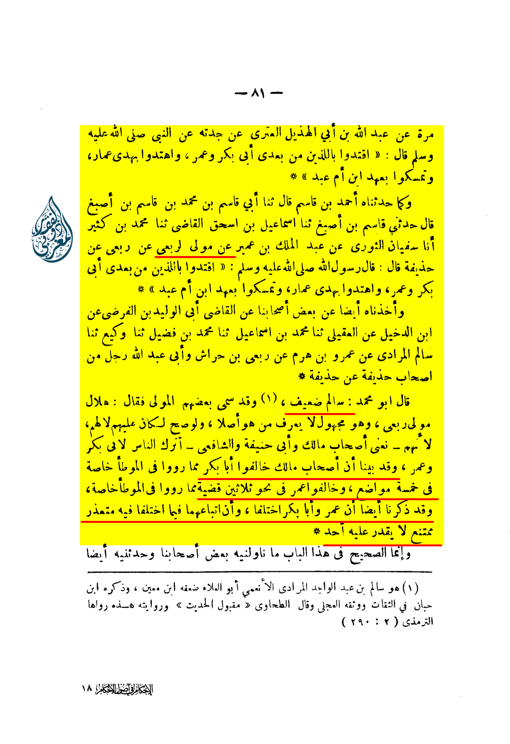 وكما حدثناه أحمد بن قاسم قال نا أبي قاسم بن محمد بن قاسم بن أصبغ قال حدثني قاسم بن أصبغ نا إسماعيل بن إسحاق القاضي نا محمد بن كثير أنا سفيان الثوري عن عبد الملك بن عمير عن مولى الربعي عن حذيفة قال قال رسول الله صلى الله عليه وسلم اقتدوا باللذين من بعدي أبي بكر وعمر واهتدوا بهدي عمار وتمسكوا بعهد ابن أم عبد وأخذناه أيضا عن بعض أصحابنا عن القاضي أبي الوليد بن الفرضي عن ابن الدخيل عن العقيلي نا محمد بن إسماعيل نا محمد بن فضيل نا وكيع نا سالم المرادي عن عمرو بن هرم عن ربعي بن حراش وأبي عبد الله رجل من أصحاب حذيفة عن حذيفة قال أبو محمد سالم ضعيف وقد سمى بعضهم المولى فقال هلال مولى ربعي وهو مجهول لا يعرف من هو أصلا ولو صح لكان عليهم لا لهم لأنهم نعني أصحاب مالك وأبي حنيفة والشافعي أترك الناس لأبي بكر وعمر وقد بينا أن أصحاب مالك خالفوا أبا بكر مما رووا في الموطأ خاصة في خمسة مواضع وخالفوا عمر في نحو ثلاثين قضية مما رووا في الموطأ خاصة وقد ذكرنا أيضا أن عمر وأبا بكر اختلفا وأن اتباعهما فيما اختلفا فيه متعذر ممتنع لا يقدر عليه أحد»