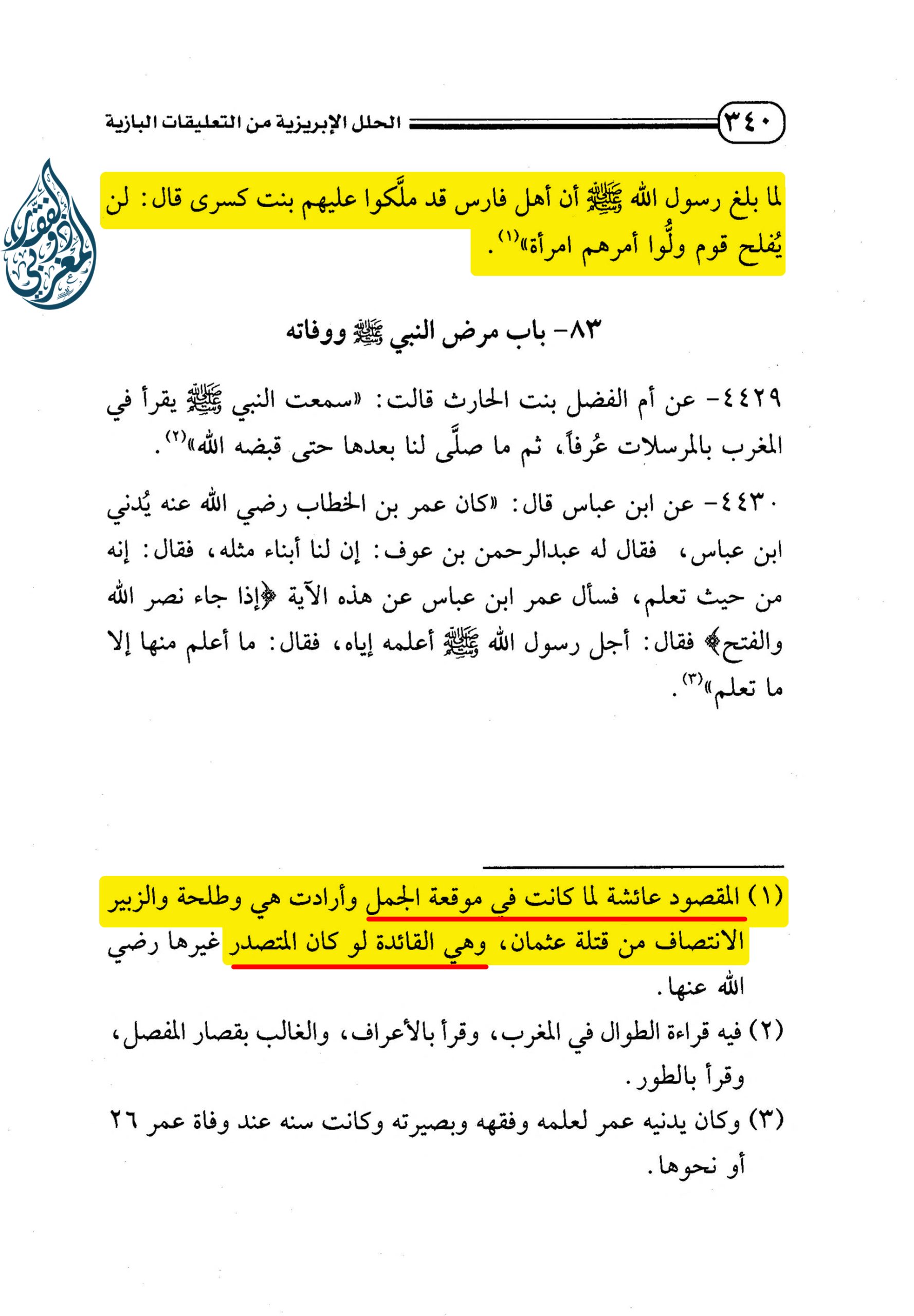 (1) المقصود عائشة لما كانت في موقعة الجمل وأرادت هي وطلحة والزبير الانتصاف من قتلة عثمان، وهي القائدة لو كان المتصدر غيرها رضي الله عنها.