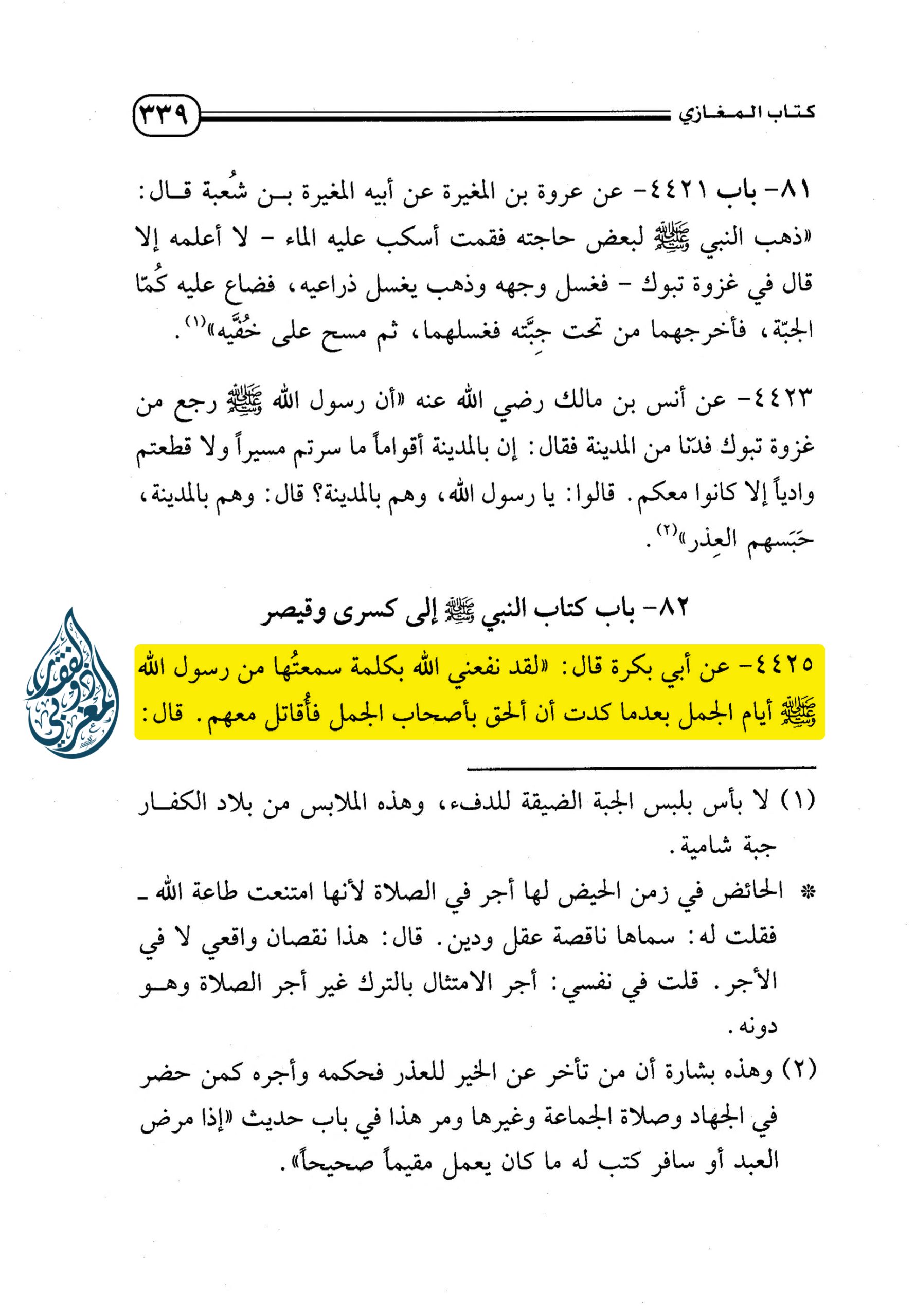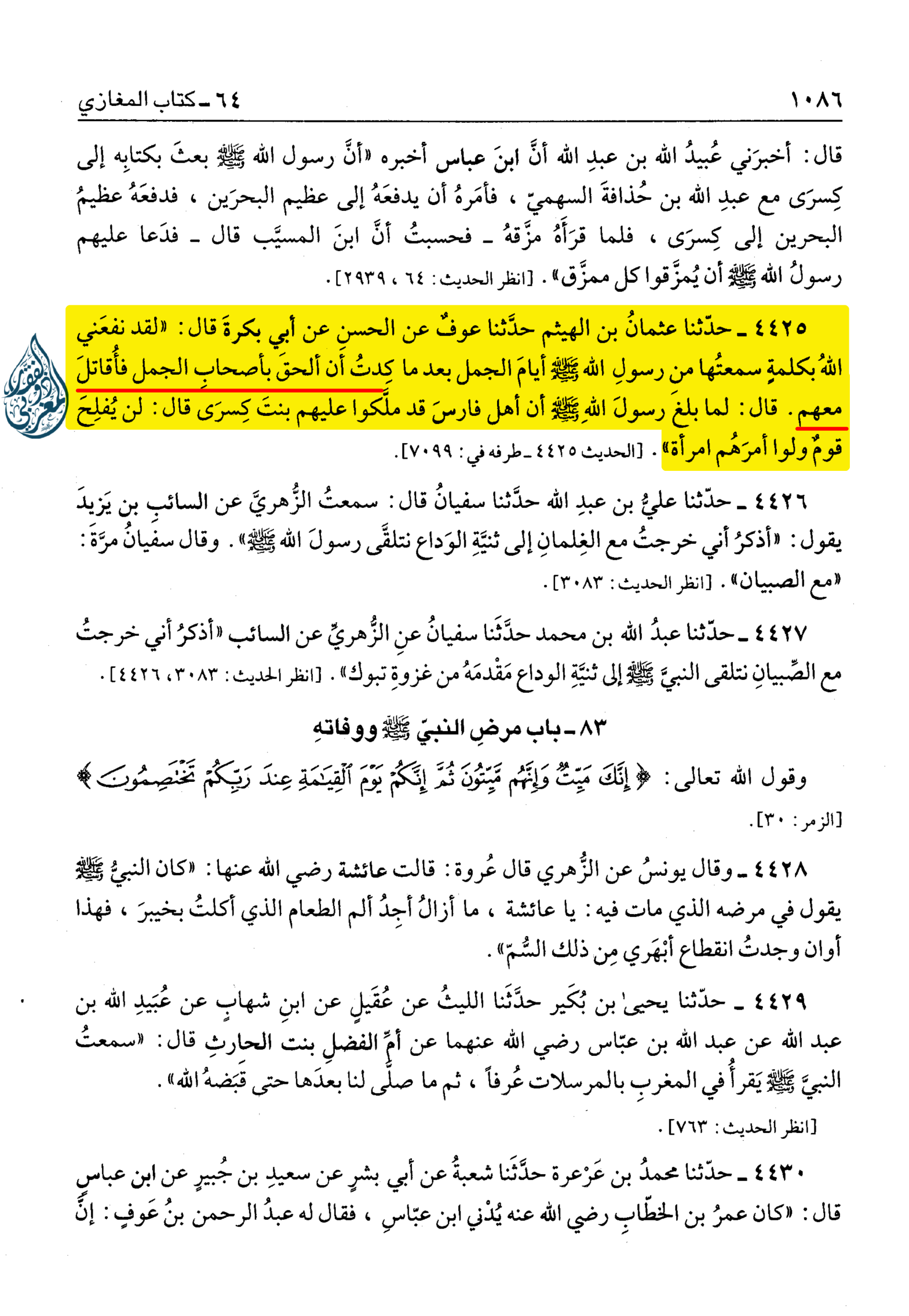 4425 – عن أبي بكرة قال: «لقد نفعني الله بكلمة سمعتُها من رسول الله صلى الله عليه وسلم أيام الجمل بعدما كدت أن ألحق بأصحاب الجمل فأُقاتل معهم. قال: لما بلغ رسول الله صلى الله عليه وسلم أن أهل فارس قد ملَّكوا عليهم بنت كسرى قال: لن يُفلح قوم ولُّوا أمرهم امرأة» (1).