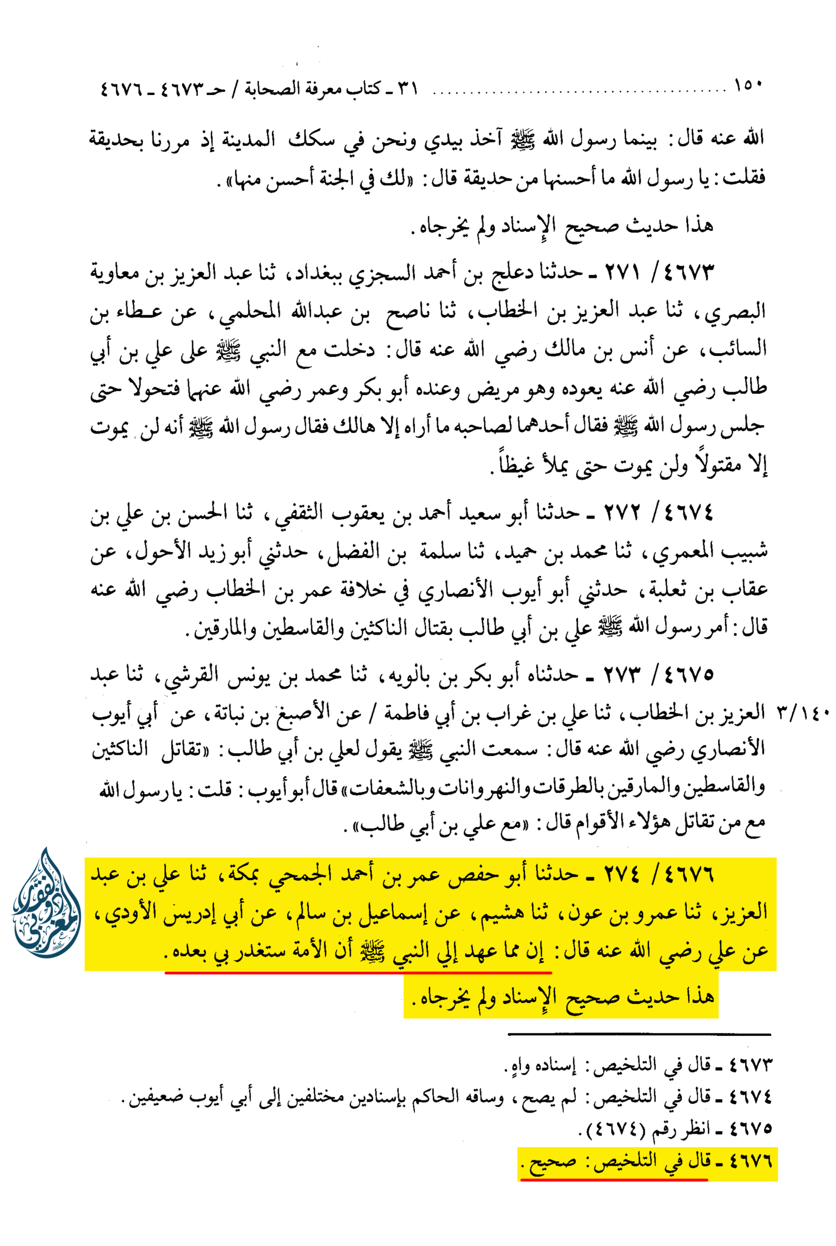4676 – حَدَّثَنَا أَبُو حَفْصٍ عُمَرُ بْنُ أَحْمَدَ الْجُمَحِيُّ، بِمَكَّةَ، ثنا عَلِيُّ بْنُ عَبْدِ الْعَزِيزِ، ثنا عَمْرُو بْنُ عَوْنٍ، ثنا هُشَيْمٌ، عَنْ إِسْمَاعِيلَ بْنِ سَالِمٍ، عَنْ أَبِي إِدْرِيسَ الْأَوْدِيِّ، عَنْ عَلِيٍّ رضي الله عنه قَالَ: ” إِنَّ مِمَّا عَهِدَ إِلَيَّ النَّبِيُّ صلى الله عليه وسلم: أَنَّ الْأُمَّةَ سَتَغْدِرُ بِي بَعْدَهُ «هَذَا حَدِيثٌ صَحِيحُ الْإِسْنَادِ، وَلَمْ يُخَرِّجَاهُ»