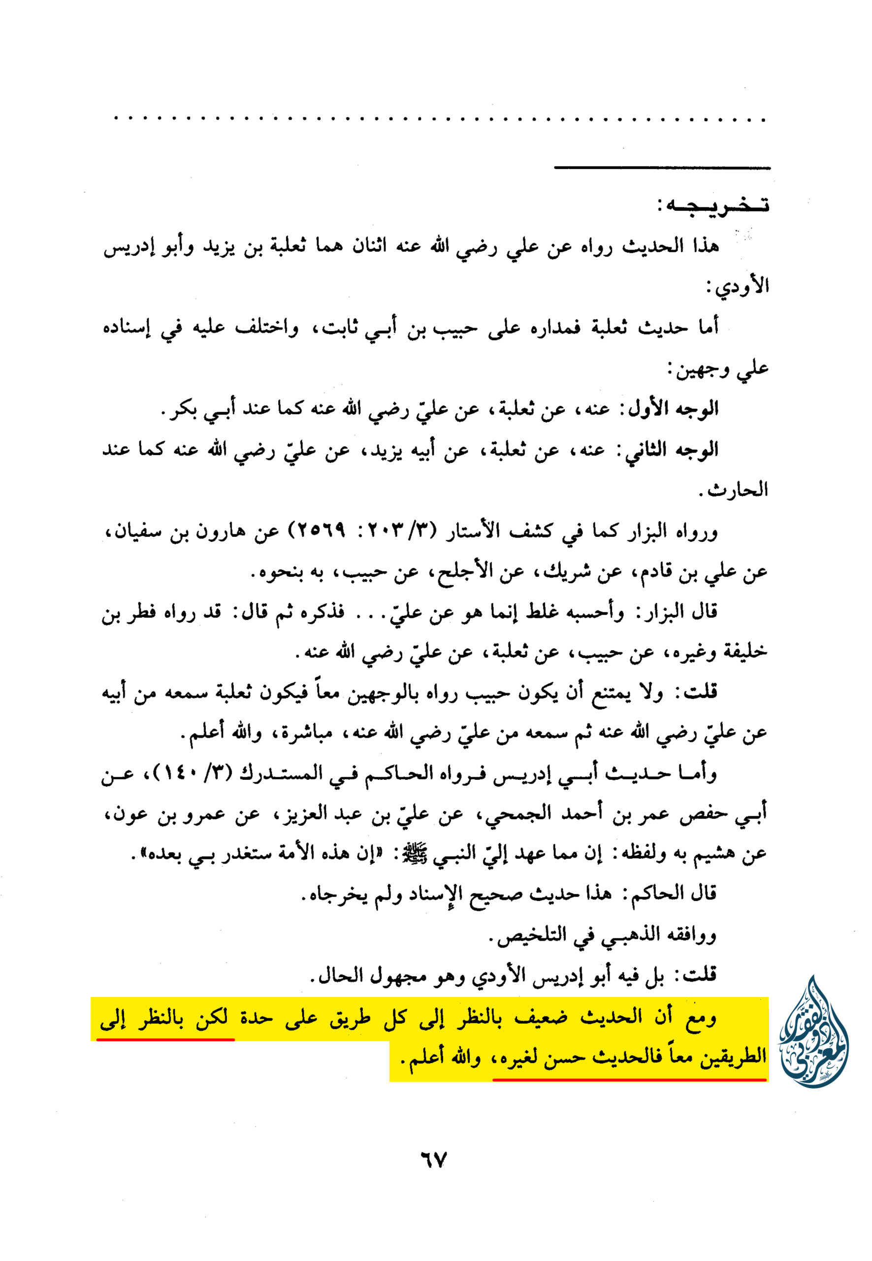 رَوَاهُ أَبُو بَكْرِ بْنُ أَبِي شَيْبَةَ بِإِسْنَادٍ حَسَنٍ وَالْحَارِثُ بْنُ أَبِي أُسَامَةَ وَالْبَزَّارُ.»