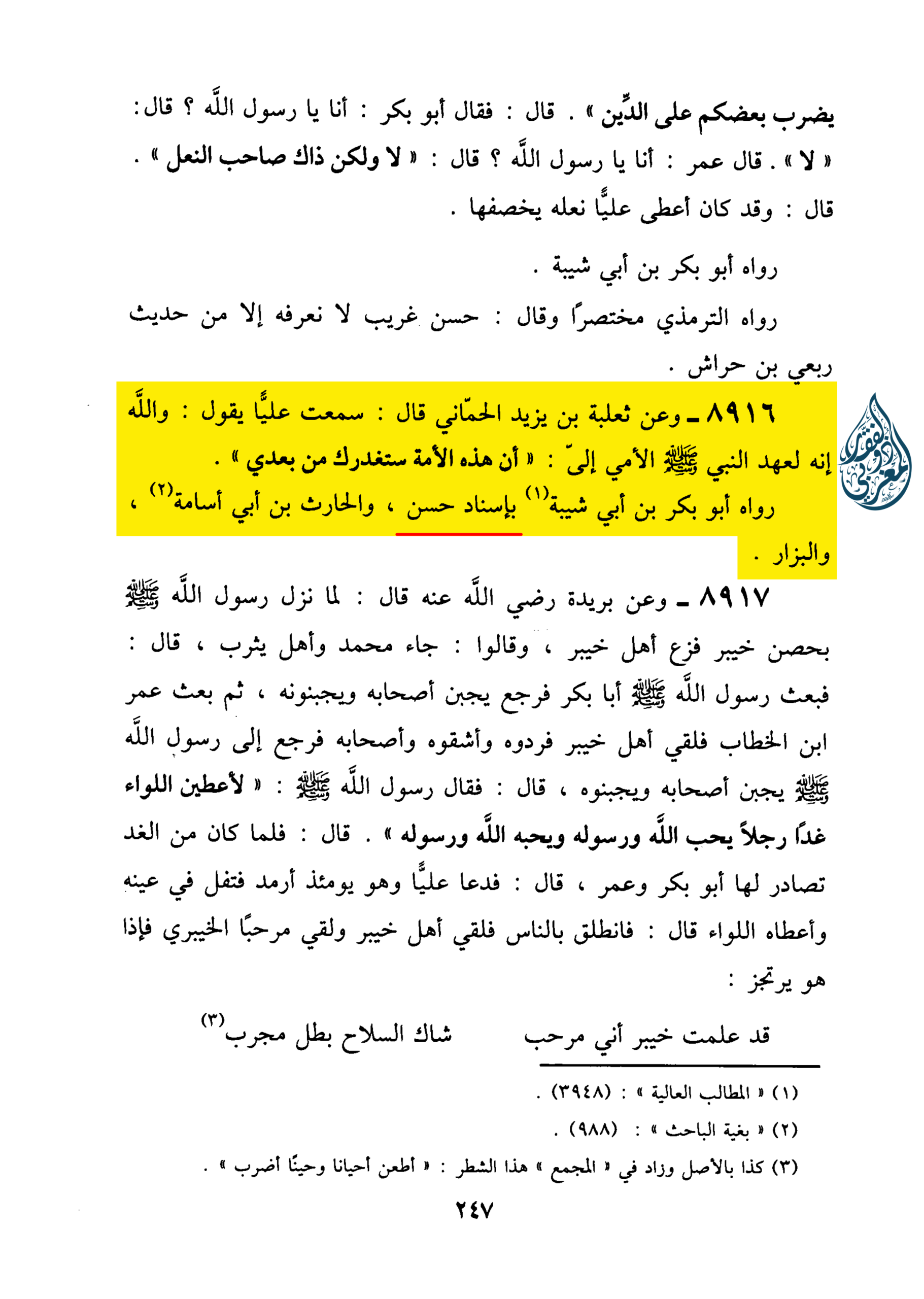 «3921 – (1) حدّثنا حَبِيبٍ (2) عَنْ ثَعْلَبَةَ بْنِ يَزِيدَ الْحِمَّانِيِّ، عَنْ أبيه قَالَ: سَمِعْتُ عَلِيًّا رضي الله عنه يَقُولُ عَلَى الْمِنْبَرِ: وَاللَّهِ إِنَّهُ لَعَهْدُ النبيِّ الأميِّ: “إن هذه الأمة ستغدر بي”.»