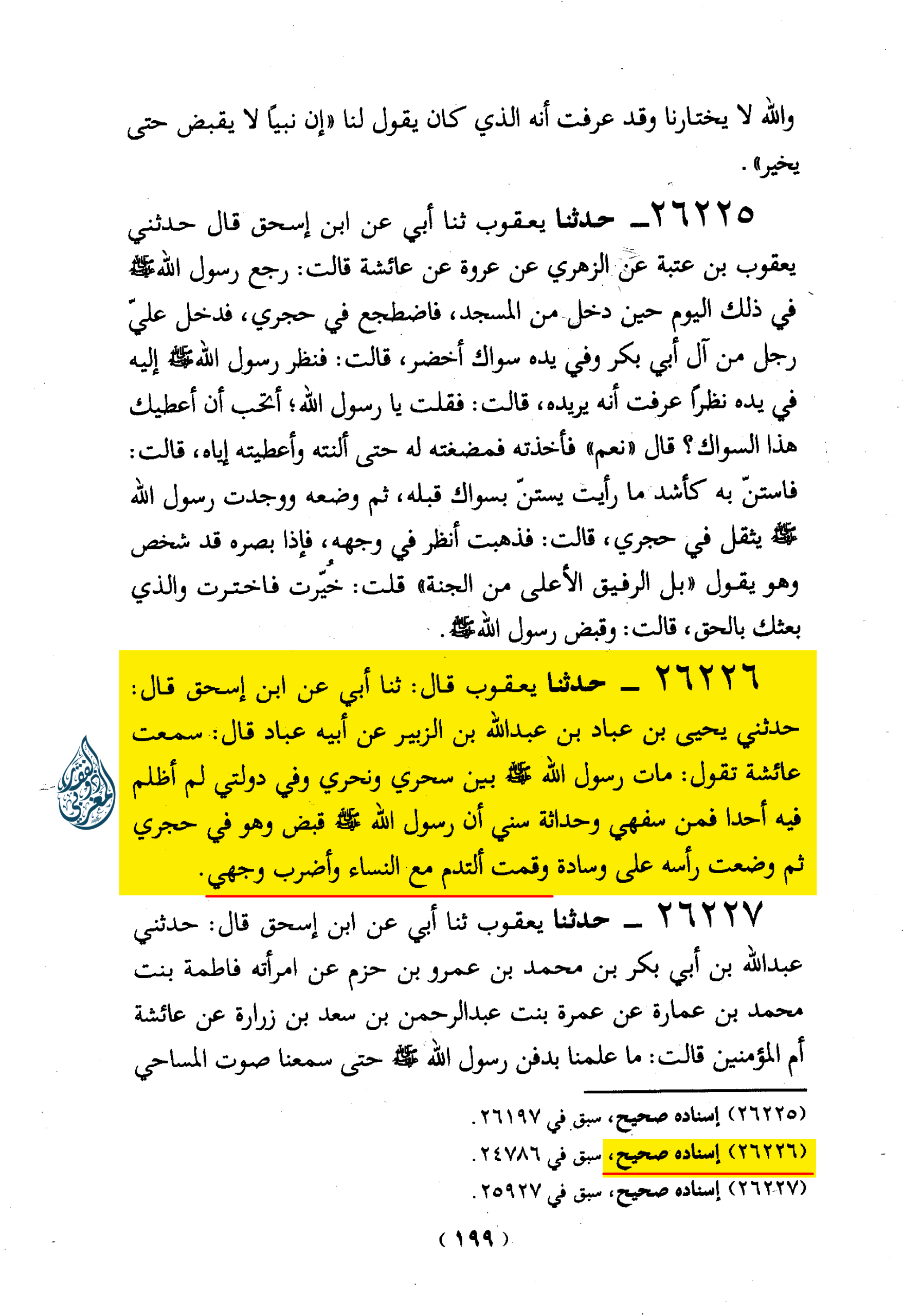 حَدَّثَنَا يَعْقُوبُ، قَالَ: حَدَّثَنَا أَبِي، عَنِ ابْنِ إِسْحَاقَ، قَالَ: حَدَّثَنِي يَحْيَى بْنُ عَبَّادِ بْنِ عَبْدِ اللهِ بْنِ الزُّبَيْرِ، عَنْ أَبِيهِ عَبَّادٍ، قَالَ: سَمِعْتُ عَائِشَةَ تَقُولُ: مَاتَ رَسُولُ اللهِ صلى الله عليه وسلم بَيْنَ سَحْرِي وَنَحْرِي وَفِي دَوْلَتِي، لَمْ أَظْلِمْ فِيهِ أَحَدًا، فَمِنْ سَفَهِي وَحَدَاثَةِ سِنِّي أَنَّ رَسُولَ اللهِ صلى الله عليه وسلم قُبِضَ وَهُوَ فِي حَجْرِي، ثُمَّ وَضَعْتُ رَأْسَهُ عَلَى وِسَادَةٍ، وَقُمْتُ أَلْتَدِمُ مَعَ النِّسَاءِ، وَأَضْرِبُ وَجْهِي