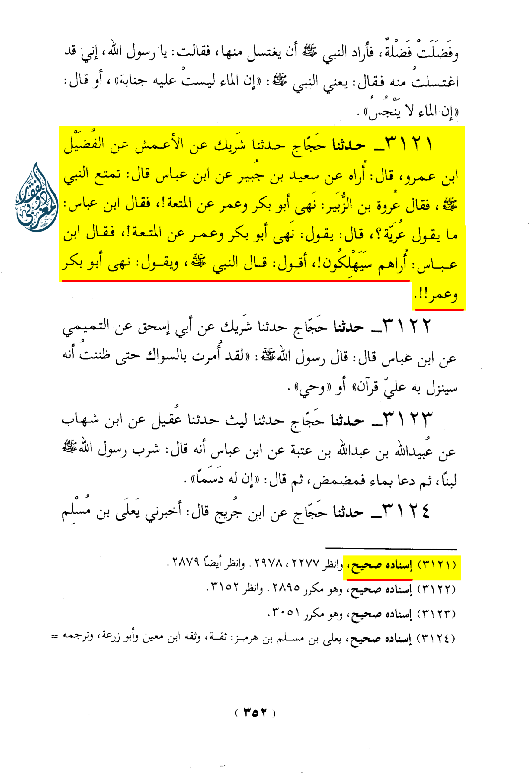 «3121 – حدثنا حَجّاج حدثنا شَريك عن الأعمش خن الفُضَيْل ابن عمرو، قال: أُراه عن سعيد بن جُبير عن ابن عباس قال: تمتع النبي صلى الله عليه وسلم، فقال عُروة بن الزبَير: نَهى أبو بكر وعمر عن المتعة!، فقال ابن عباس: ما يقول عُرَيّة؟، قال: يقول: نَهى أبو بكر وعمر عن المتعة!، فقال ابن عباس: أُراهم سَيَهْلِكُون!، أقول: قال النبي صلى الله عليه وسلم، ويقول: نهى أبو بكر وعمر»