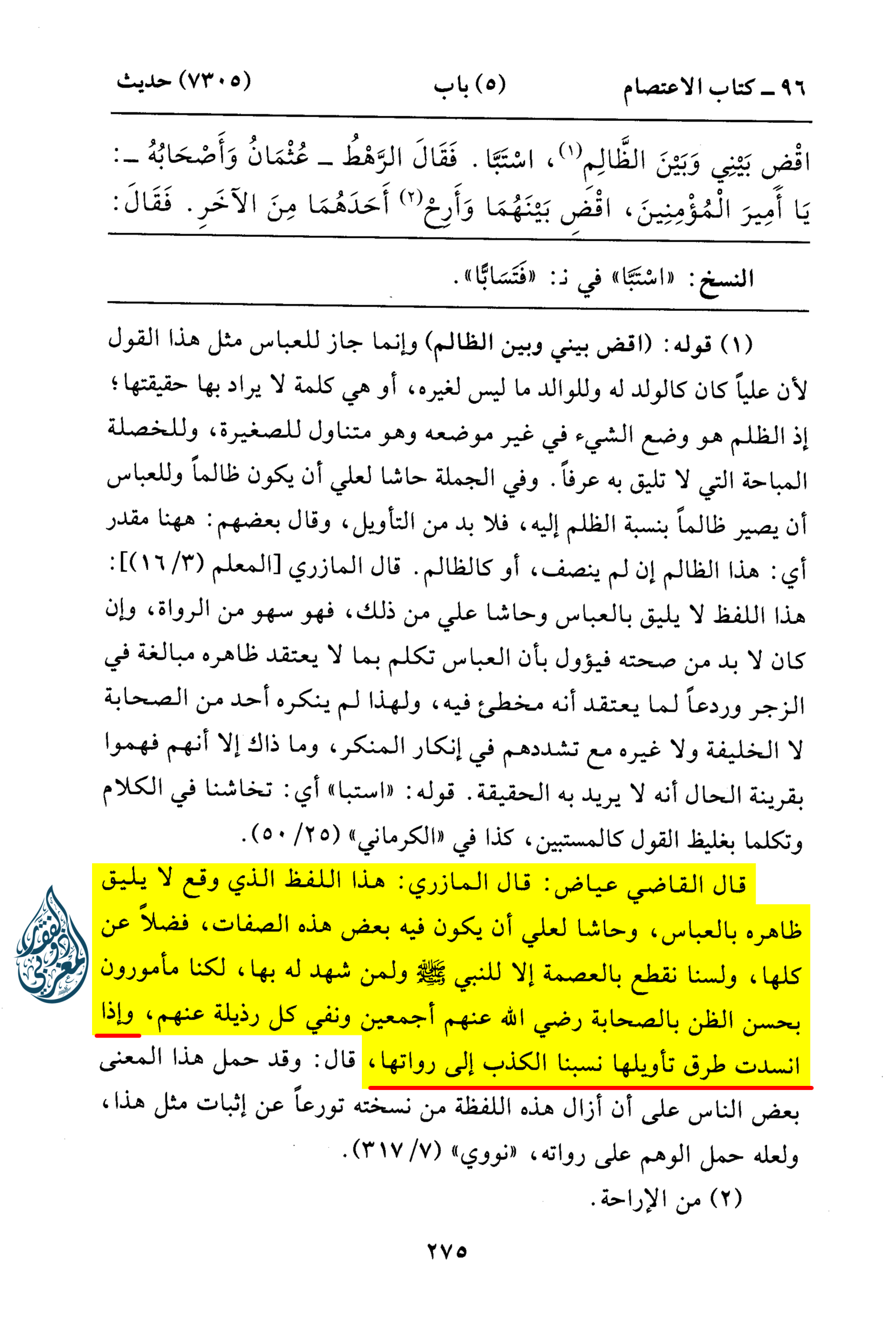 قال القاضي عياض: قال المازري: هذا اللفظ الذي وقع لا يليق ظاهره بالعباس، وحاشا لعلي أن يكون فيه بعض هذه الصفات، فضلًا عن كلها، ولسنا نقطع بالعصمة إلا للنبي صلى الله عليه وسلم ولمن شهد له بها، لكنا مأمورون بحسن الظن بالصحابة رضي الله عنهم أجمعين ونفي كل رذيلة عنهم، وإذا ‌انسدت ‌طرق ‌تأويلها نسبنا الكذب إلى رواتها