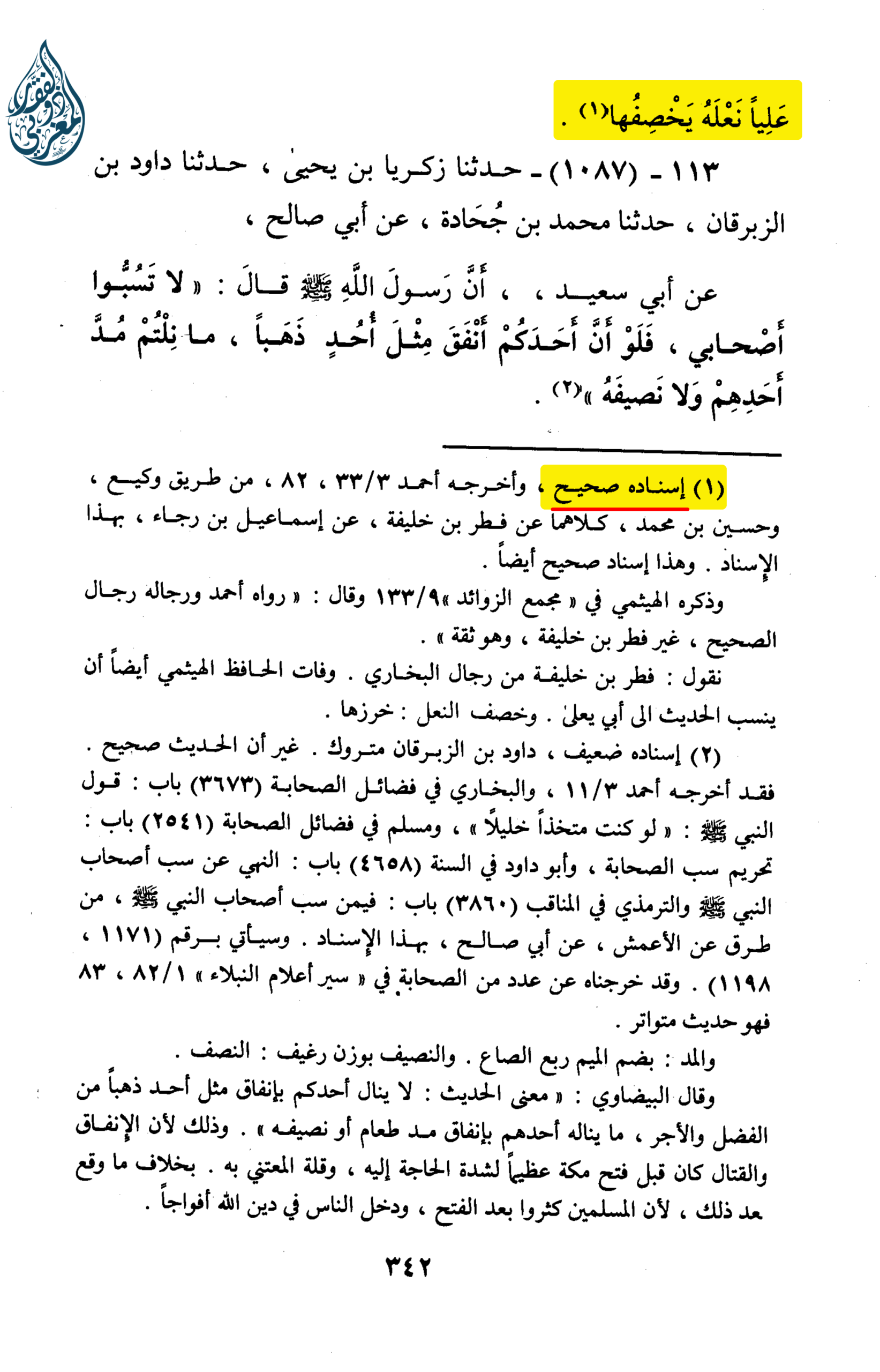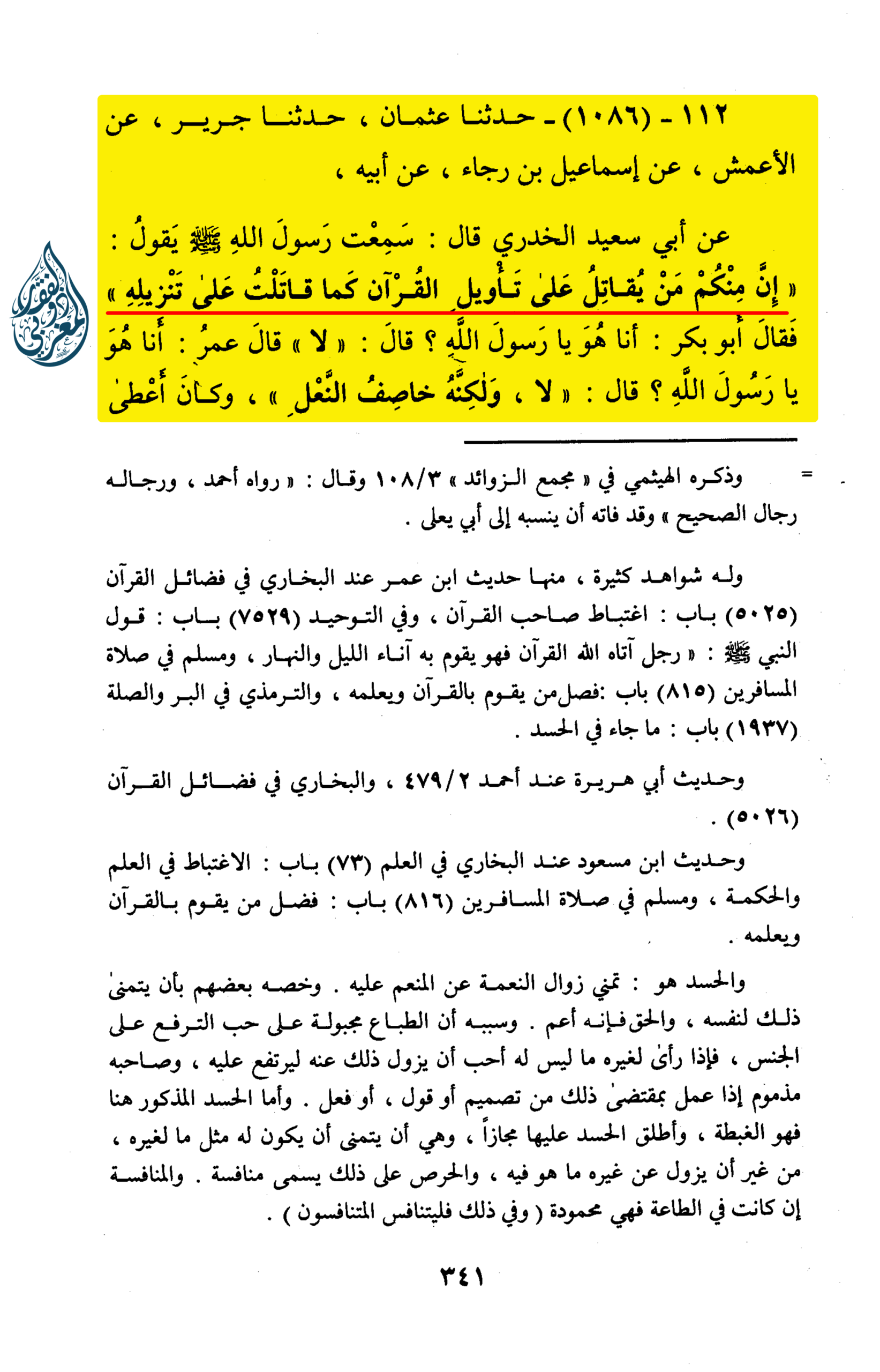 1086 – حَدَّثَنَا عُثْمَانُ، حَدَّثَنَا جَرِيرٌ، عَنِ الْأَعْمَشِ، عَنْ إِسْمَاعِيلَ بْنِ رَجَاءٍ، عَنْ أَبِيهِ، عَنْ أَبِي سَعِيدٍ الْخُدْرِيِّ قَالَ: سَمِعْتُ رَسُولَ اللَّهِ صلى الله عليه وسلم يَقُولُ: «إِنَّ مِنْكُمْ مَنْ يُقَاتِلُ عَلَى تَأْوِيلِ الْقُرْآنِ كَمَا قَاتَلْتُ عَلَى تَنْزِيلِهِ»، فَقَالَ أَبُو بَكْرٍ: أَنَا هُوَ يَا رَسُولَ اللَّهِ؟ قَالَ: «لَا»، قَالَ عُمَرُ: أَنَا هُوَ يَا رَسُولَ اللَّهِ؟ قَالَ: «لَا، وَلَكِنَّهُ خَاصِفُ النَّعْلِ»، وَكَانَ أَعْطَى عَلِيًّا نَعْلَهُ يَخْصِفُهَا