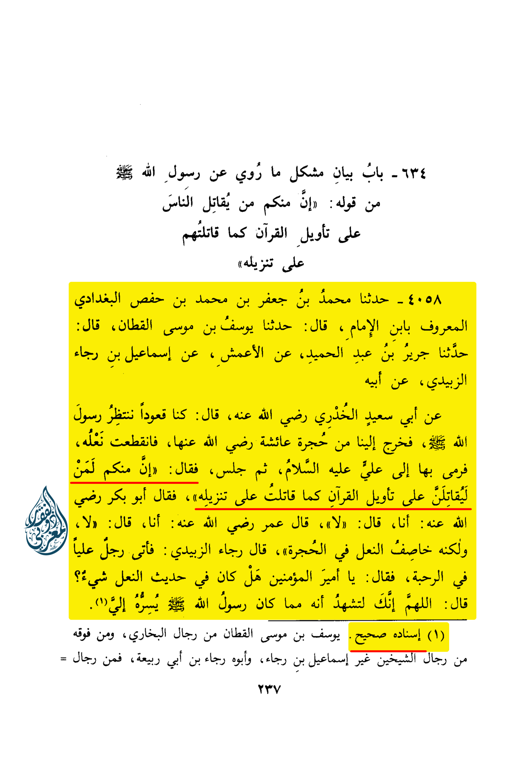 «4058 – حَدَّثَنَا مُحَمَّدُ بْنُ جَعْفَرِ بْنِ مُحَمَّدِ بْنِ حَفْصٍ الْبَغْدَادِيُّ الْمَعْرُوفُ بِابْنِ الْإِمَامِ، قَالَ: حَدَّثَنَا يُوسُفُ بْنُ مُوسَى الْقَطَّانُ، قَالَ: حَدَّثَنَا جَرِيرُ بْنُ عَبْدِ الْحَمِيدِ، عَنِ الْأَعْمَشِ، عَنْ إِسْمَاعِيلَ بْنِ رَجَاءٍ الزُّبَيْدِيِّ، عَنْ أَبِيهِ، عَنْ أَبِي سَعِيدٍ الْخُدْرِيِّ رضي الله عنه، قَالَ: كُنَّا قُعُودًا نَنْتَظِرُ رَسُولَ اللهِ صلى الله عليه وسلم، فَخَرَجَ إِلَيْنَا مِنْ حُجْرَةِ عَائِشَةَ رضي الله عنها، فَانْقَطَعَتْ نَعْلُهُ، فَرَمَى بِهَا إِلَى عَلِيٍّ عليه السلام، ثُمَّ جَلَسَ، فَقَالَ: ” إِنَّ مِنْكُمْ لَمَنْ لَيُقَاتِلَنَّ عَلَى تَأْوِيلِ الْقُرْآنِ كَمَا قَاتَلْتُ عَلَى تَنْزِيلِهِ ” فَقَالَ أَبُو بَكْرٍ رضي الله عنه: أَنَا، قَالَ: ” لَا ” قَالَ عُمَرُ رضي الله عنه: أَنَا، قَالَ: ” لَا، وَلَكِنَّهُ خَاصِفُ النَّعْلِ فِي الْحُجْرَةِ ” قَالَ رَجَاءٌ الزُّبَيْدِيُّ: فَأَتَى رَجُلٌ عَلِيًّا فِي الرَّحَبَةِ، فَقَالَ: يَا أَمِيرَ الْمُؤْمِنِينَ، هَلْ كَانَ فِي حَدِيثِ النَّعْلِ شَيْءٌ؟ قَالَ: اللهُمَّ إِنَّكَ لَتَشْهَدُ أَنَّهُ مِمَّا كَانَ رَسُولُ اللهِ صلى الله عليه وسلم يُسِرُّهُ إِلَيَّ»