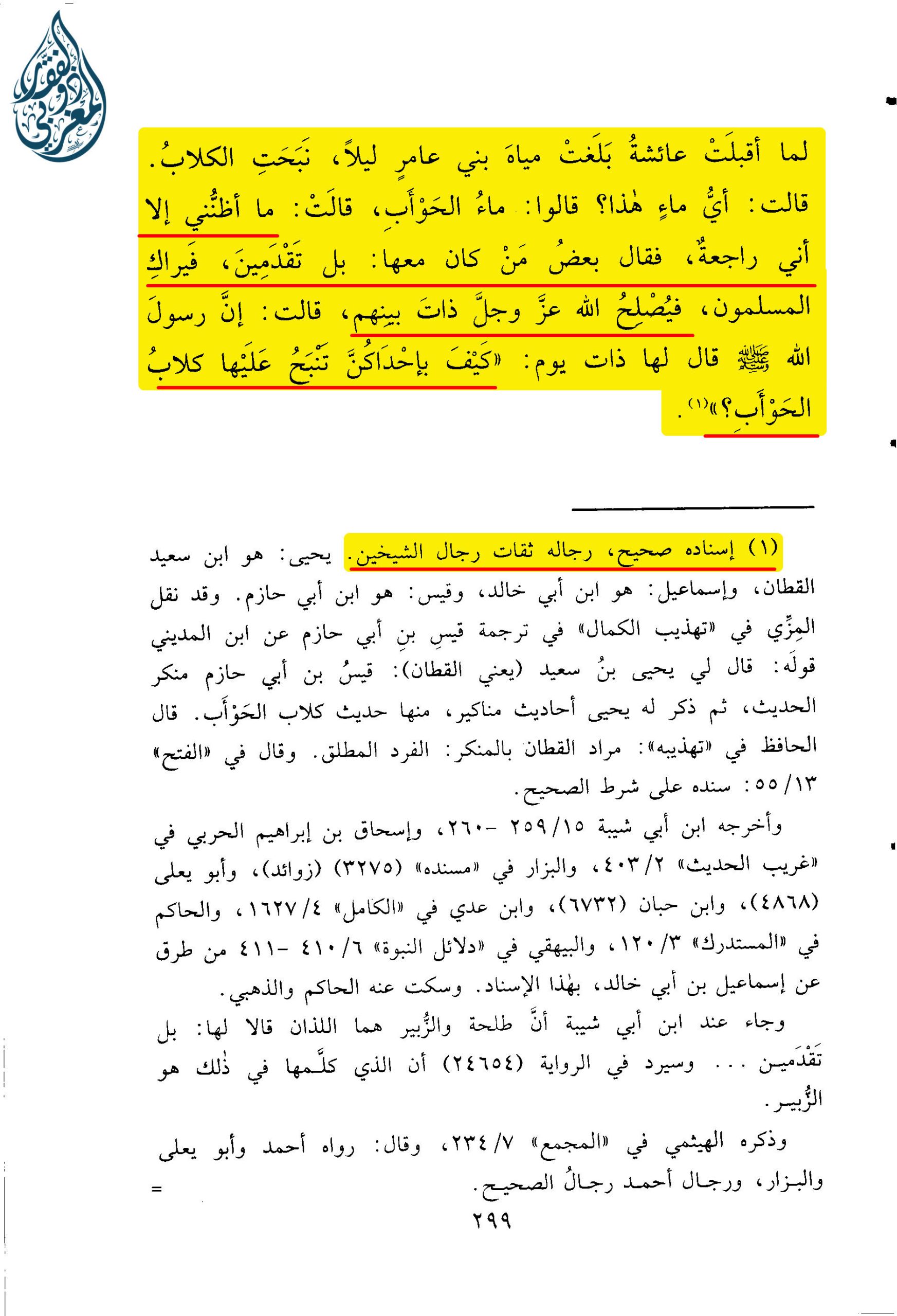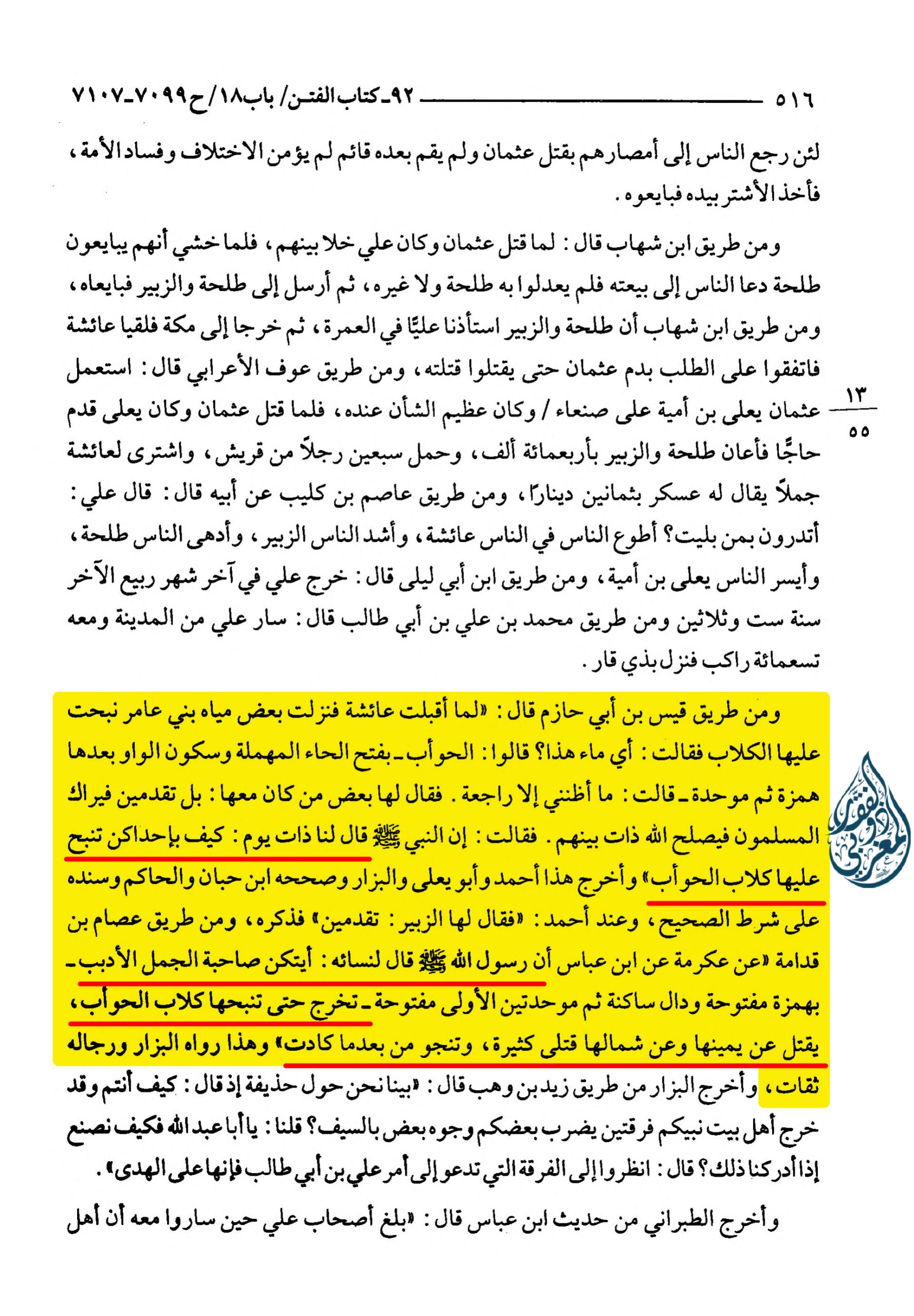 «ومن طريق قيس بن أبي حازم قال: لما أقبلت عائشة فنزلت بعض مياه بني عامر نبحت عليها الكلاب، فقالت: أي ماء هذا؟ قالوا: الحوأب – بفتح الحاء المهملة وسكون الواو بعدها همزة ثم موحدة – قالت: ما أظنني إلا راجعة. فقال لها بعض من كان معها: بل تقدمين فيراك المسلمون فيصلح الله ذات بينهم. فقالت: إن النبي صلى الله عليه وسلم قال لنا ذات يوم: كيف بإحداكن تنبح عليها كلاب الحوأب. وأخرج هذا أحمد، وأبو يعلى، والبزار وصححه ابن حبان، والحاكم وسنده على شرط الصحيح. وعند أحمد: فقال لها الزبير: تقدمين، فذكره. ومن طريق عصام بن قدامة، عن عكرمة، عن ابن عباس أن رسول الله صلى الله عليه وسلم قال لنسائه: أيتكن صاحبة الجمل الأدبب – بهمزة مفتوحة ودال ساكنة ثم موحدتين الأولى مفتوحة؟ تخرج حتى تنبحها كلاب الحوأب، يقتل عن يمينها وعن شمالها قتلى كثيرة وتنجو من بعد ما كادت. وهذا رواه البزار ورجاله ثقات.»
