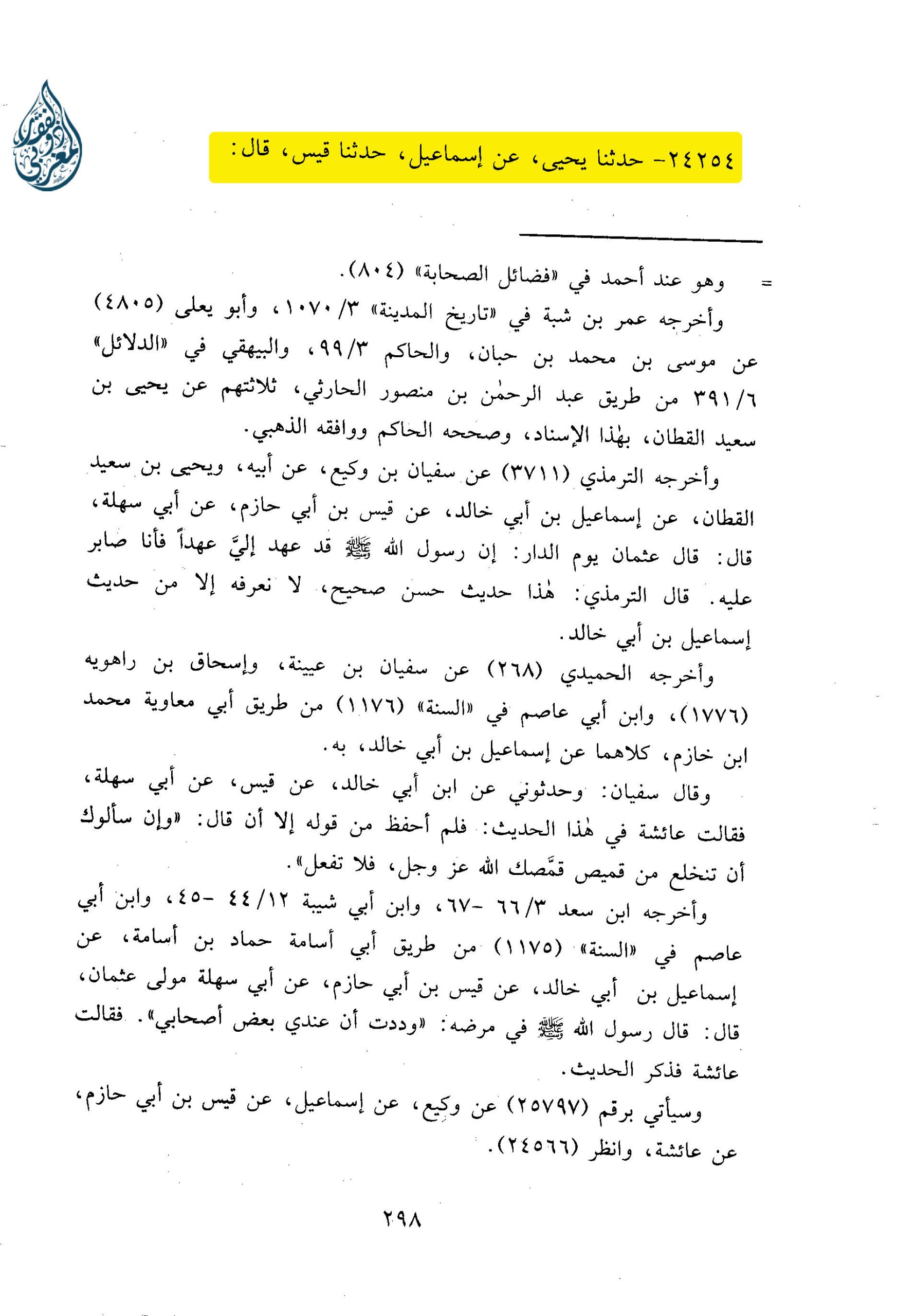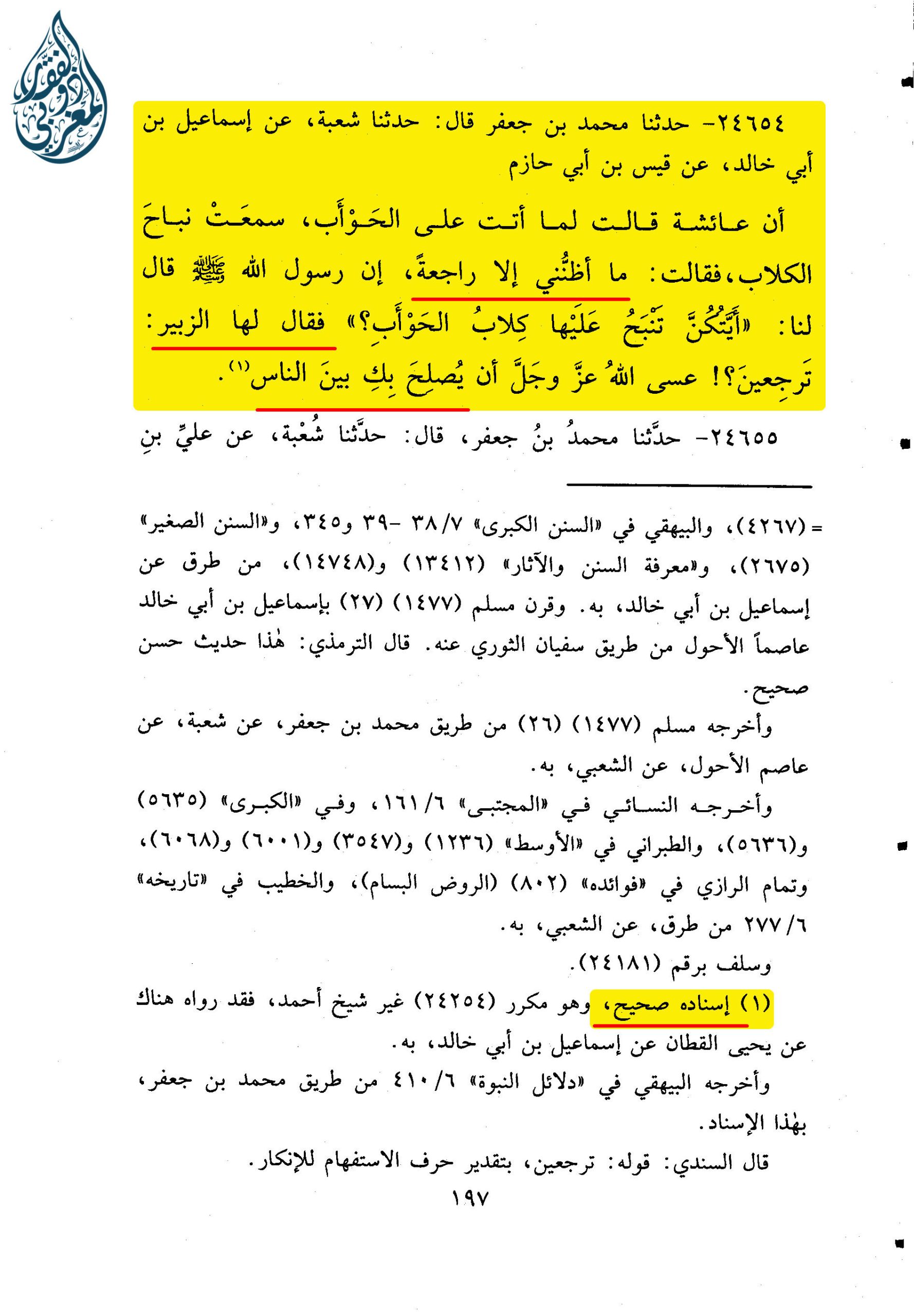 24254 – حَدَّثَنَا يَحْيَى، عَنْ إِسْمَاعِيلَ، حَدَّثَنَا قَيْسٌ، قَالَ: لَمَّا أَقْبَلَتْ عَائِشَةُ بَلَغَتْ مِيَاهَ بَنِي عَامِرٍ لَيْلًا، نَبَحَتِ الْكِلَابُ. قَالَتْ: أَيُّ مَاءٍ هَذَا؟ قَالُوا: مَاءُ الْحَوْأَبِ، قَالَتْ: مَا أَظُنُّنِي إِلَّا أَنِّي رَاجِعَةٌ، فَقَالَ بَعْضُ مَنْ كَانَ مَعَهَا: بَلْ تَقْدَمِينَ، فَيَرَاكِ الْمُسْلِمُونَ، فَيُصْلِحُ اللهُ عز وجل ذَاتَ بَيْنِهِمْ، قَالَتْ: إِنَّ رَسُولَ اللهِ صلى الله عليه وسلم قَالَ لَهَا ذَاتَ يَوْمٍ: ” كَيْفَ بِإِحْدَاكُنَّ تَنْبَحُ عَلَيْهَا كِلَابُ الْحَوْأَبِ؟ ” (1).